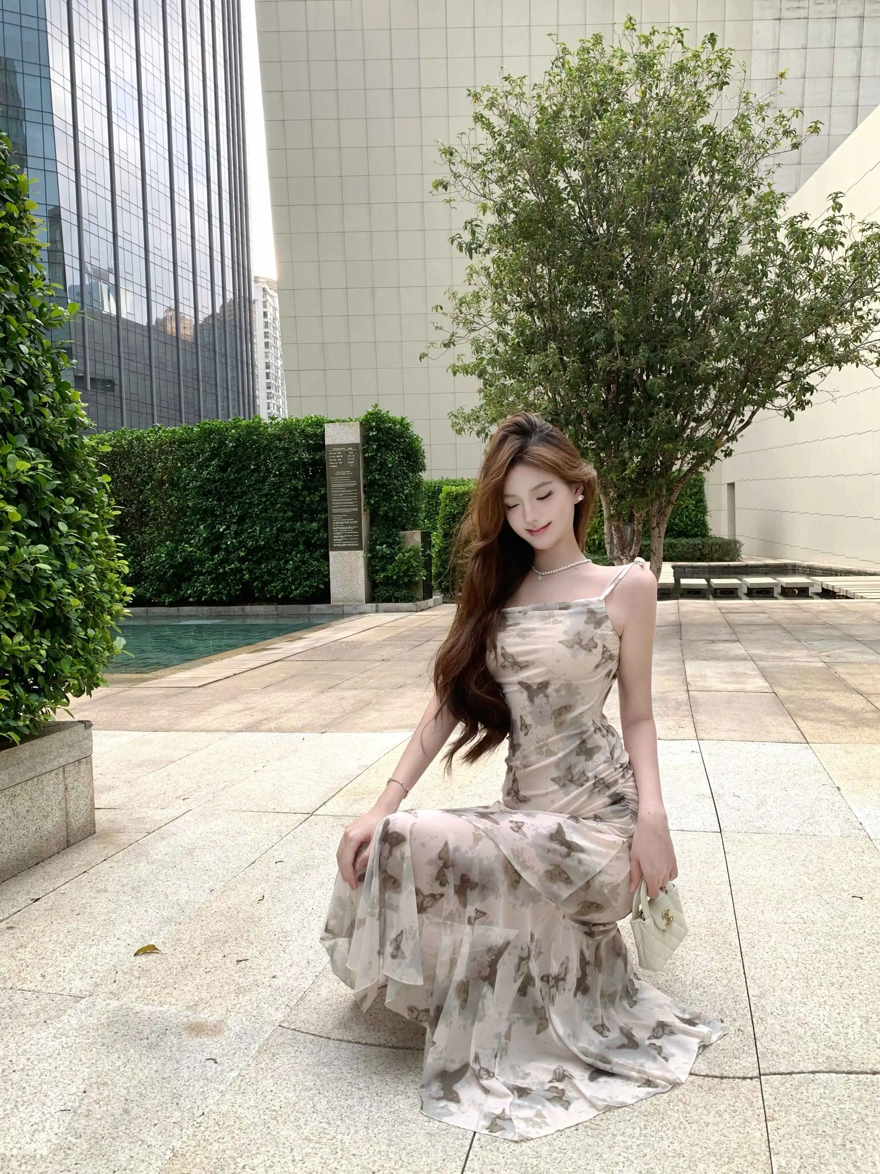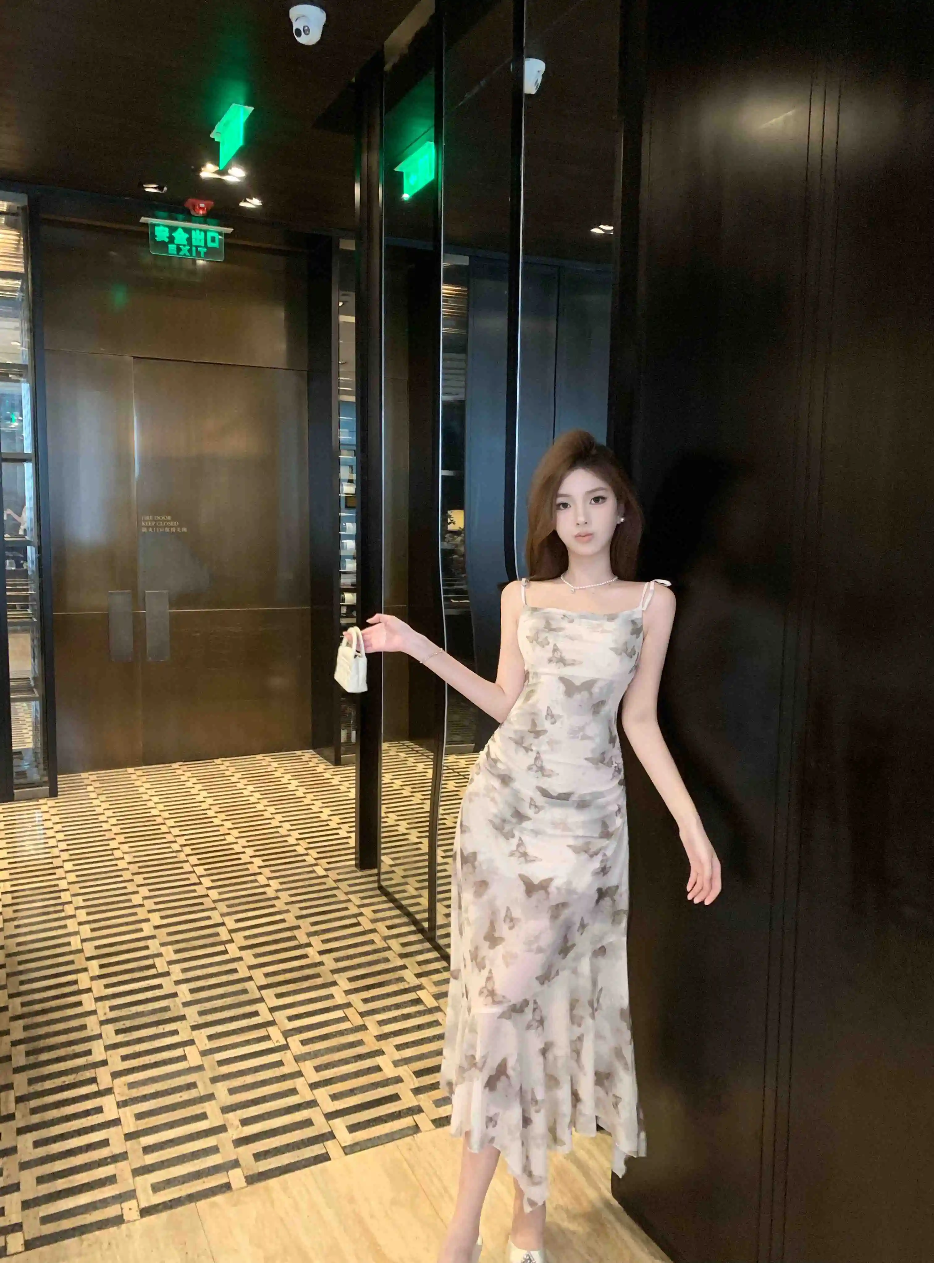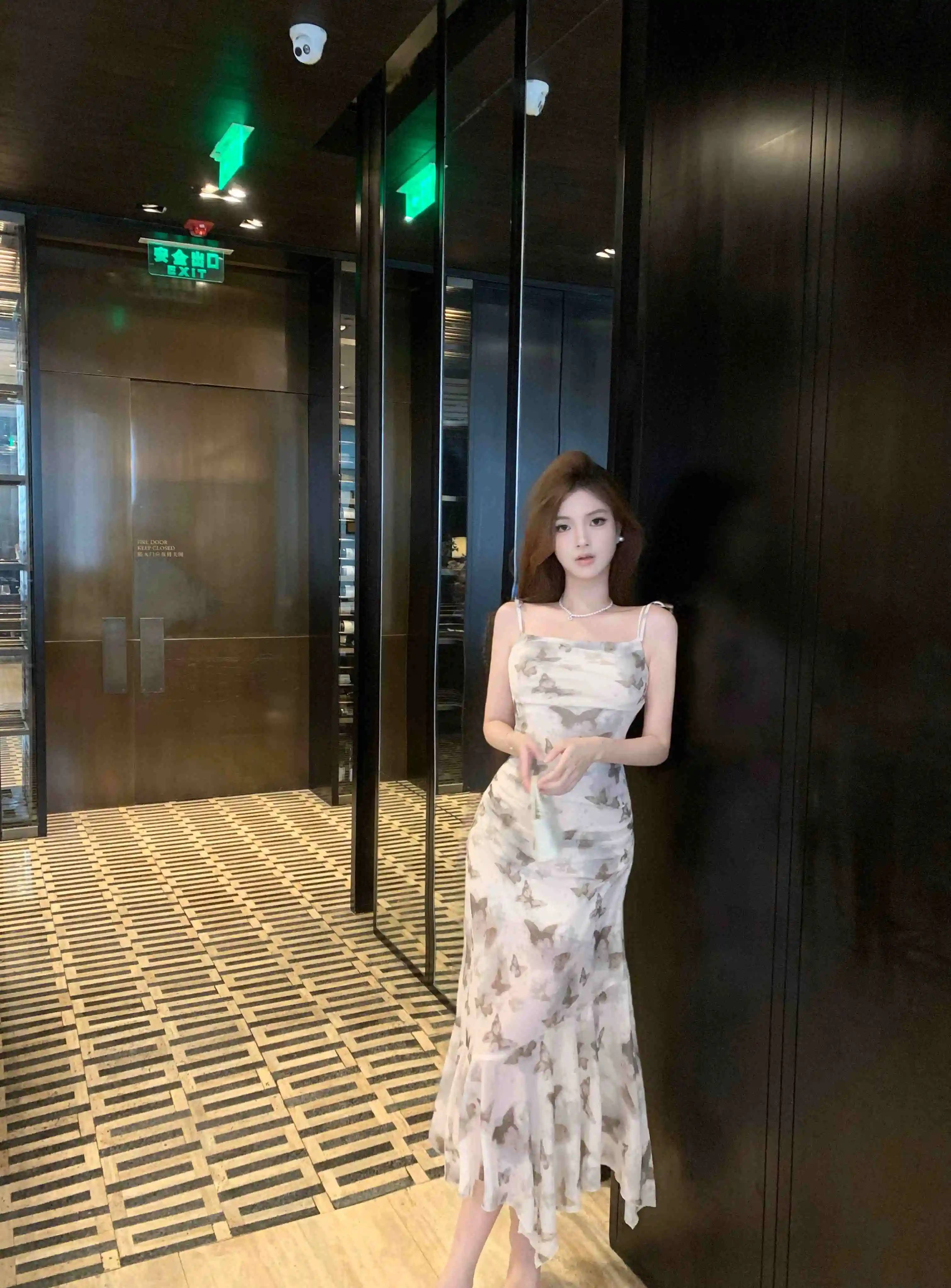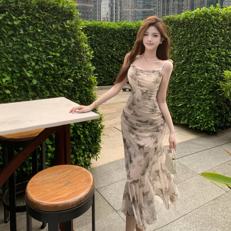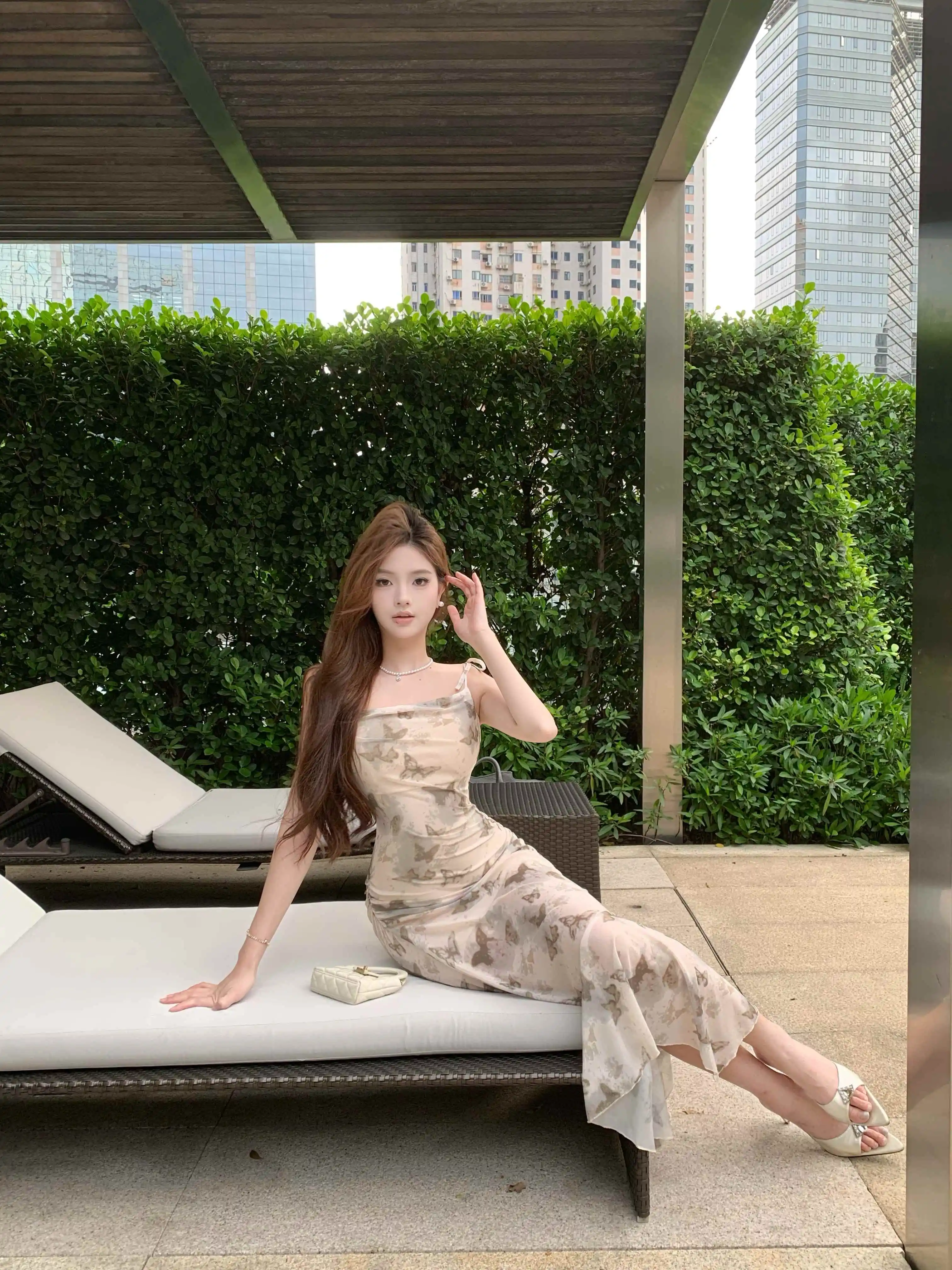 DAIIIBABYYY - New Print Mesh Sling Long Dress Summer Elegant Beach Style Holiday Dress Women Korean Fashion Bodycon Ruffled Mermaid Dress