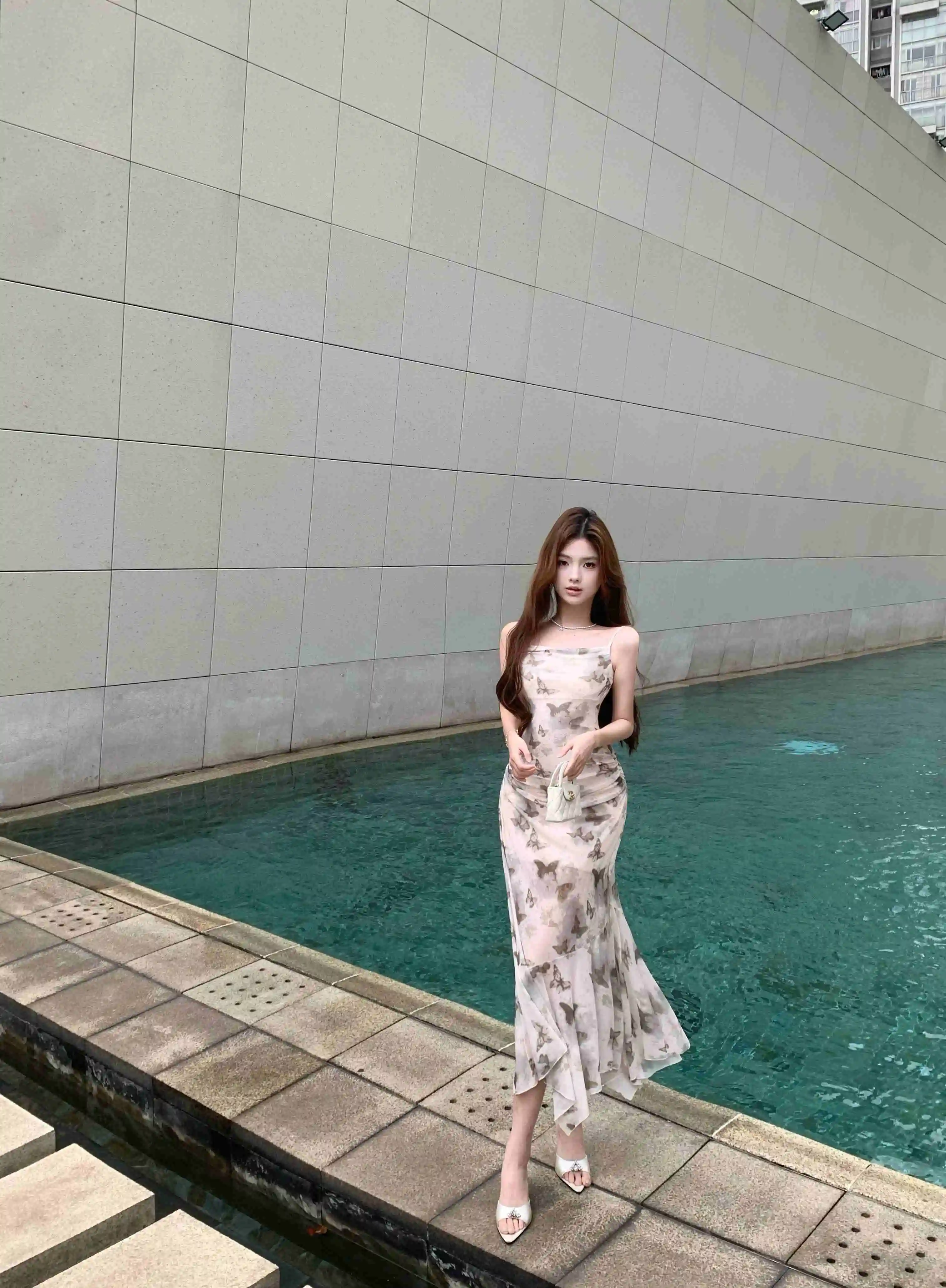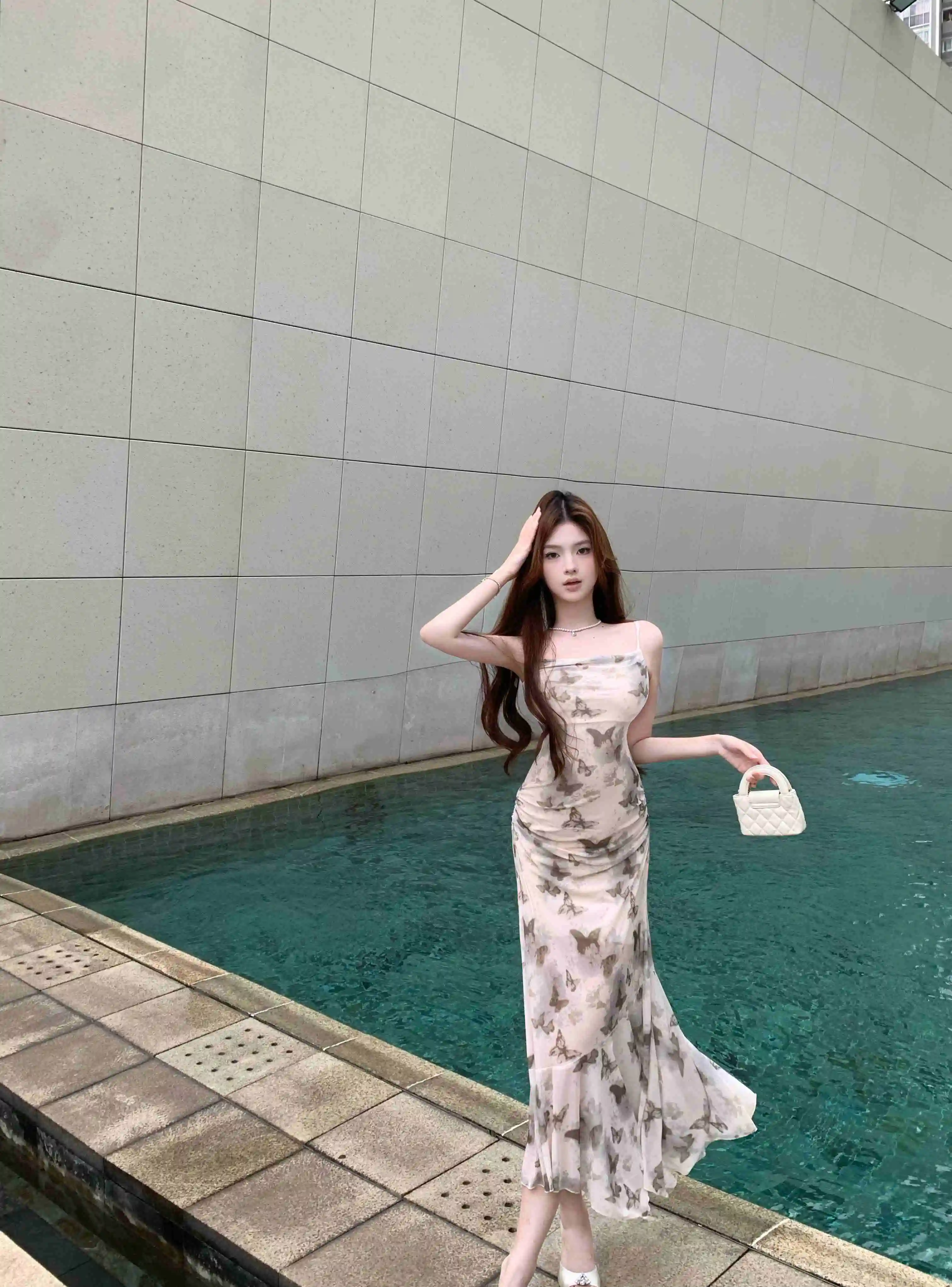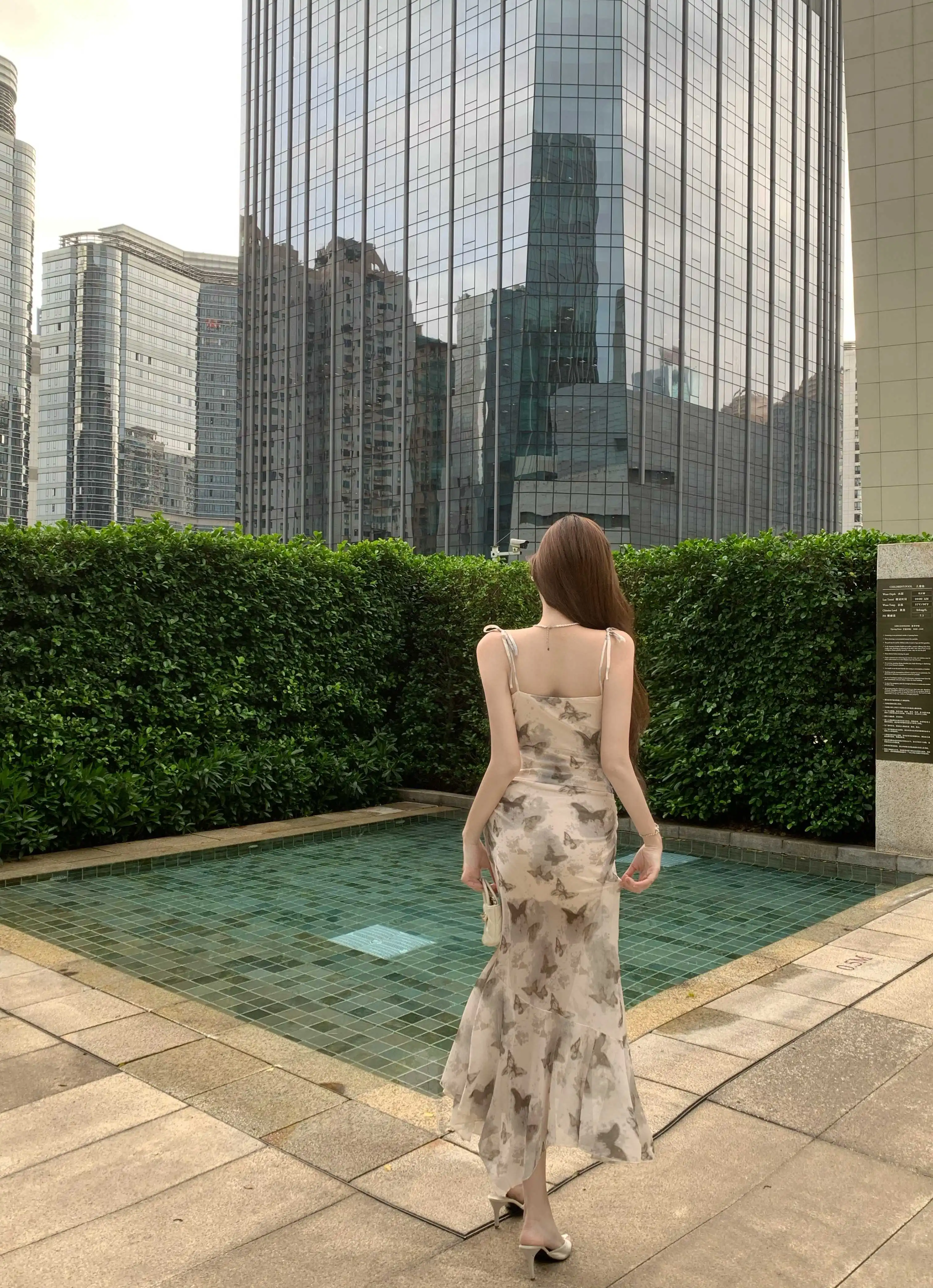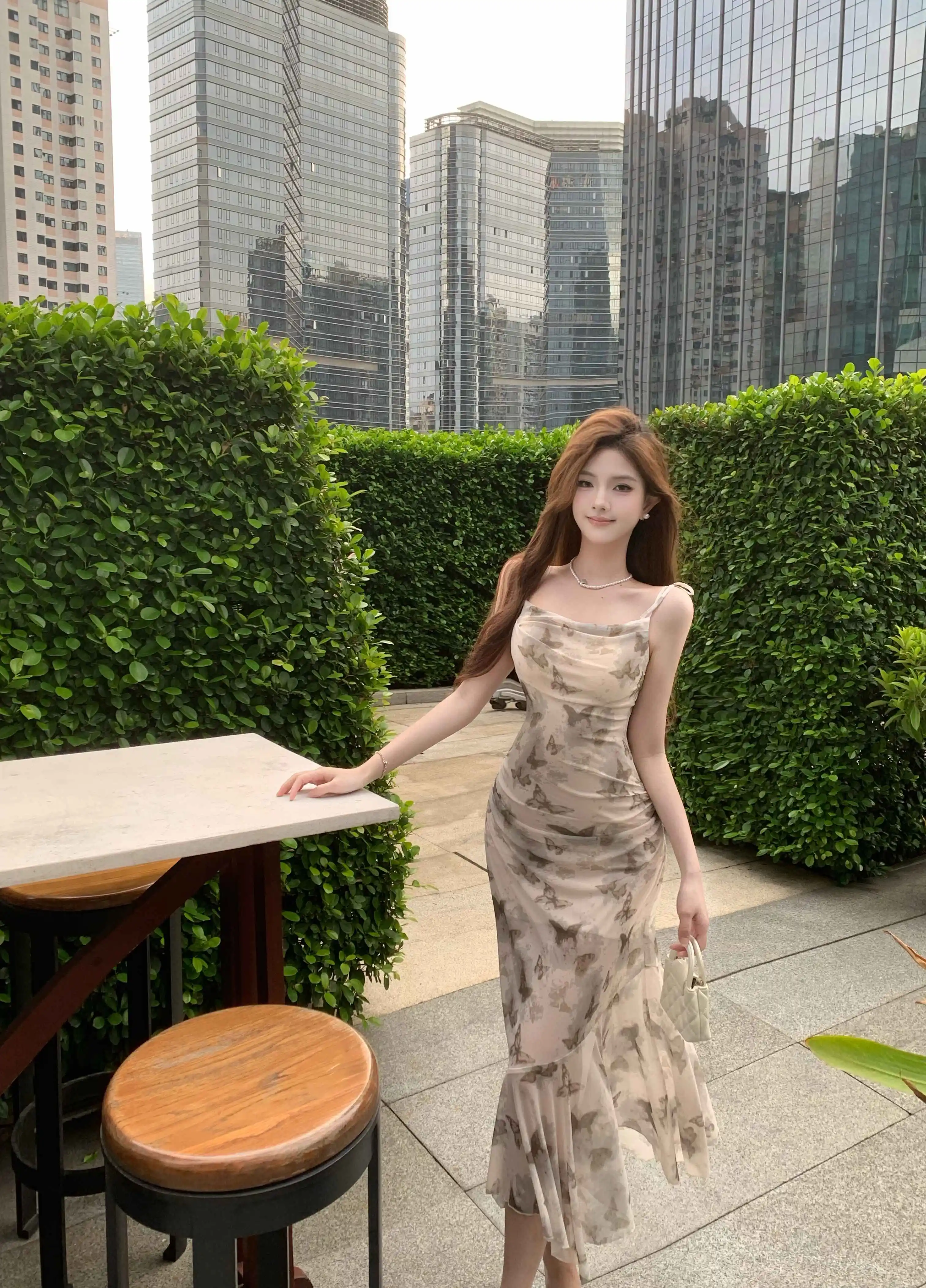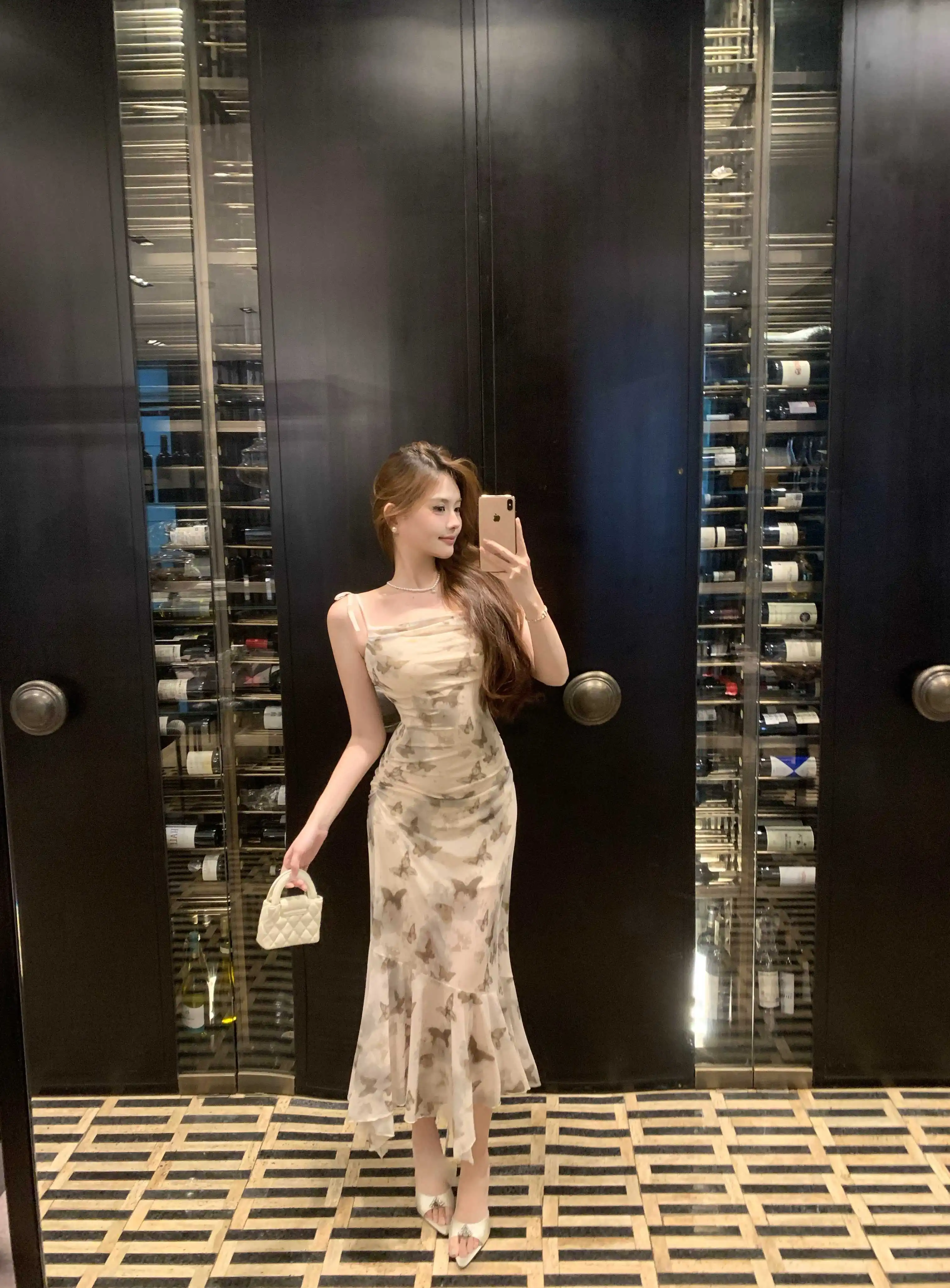 DAIIIBABYYY - New Print Mesh Sling Long Dress Summer Elegant Beach Style Holiday Dress Women Korean Fashion Bodycon Ruffled Mermaid Dress
