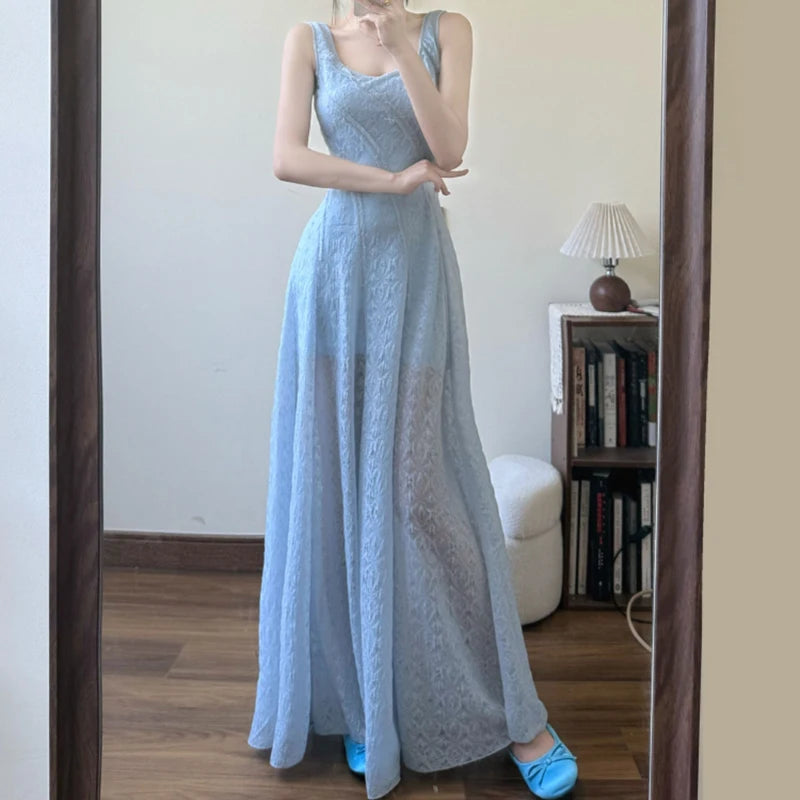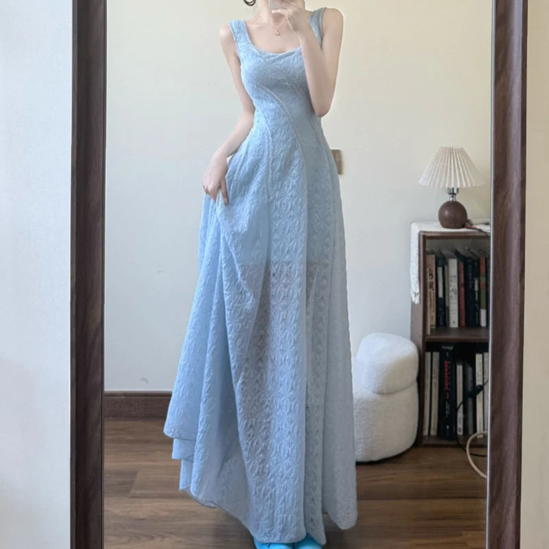 DAIIIBABYYY - New Style Blue Strap Ankle-Length Dress For Women French Luxury Summer Beach Vacation Fashion Sleeveless High Waist Sling Dresse