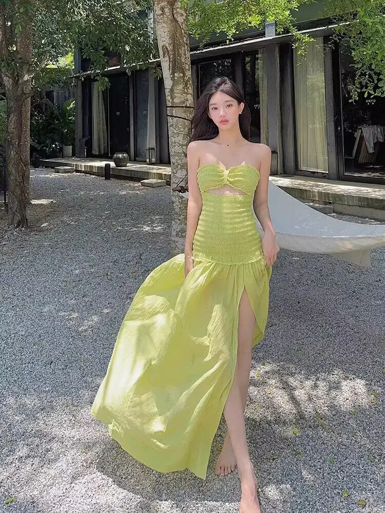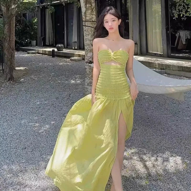 DAIIIBABYYY  -  New Summer Long Strapless Holiday Dress Women Fashion Sexy Hollow Sexy Split Green Dress Seaside Resort Vacation Beach Dress
