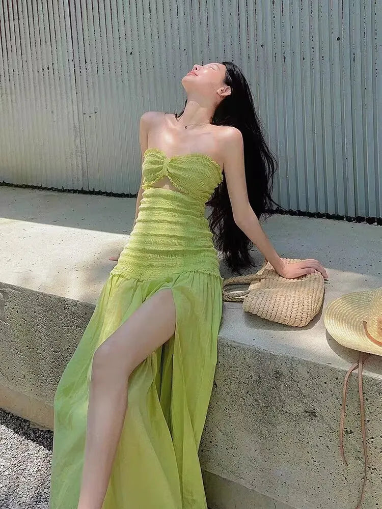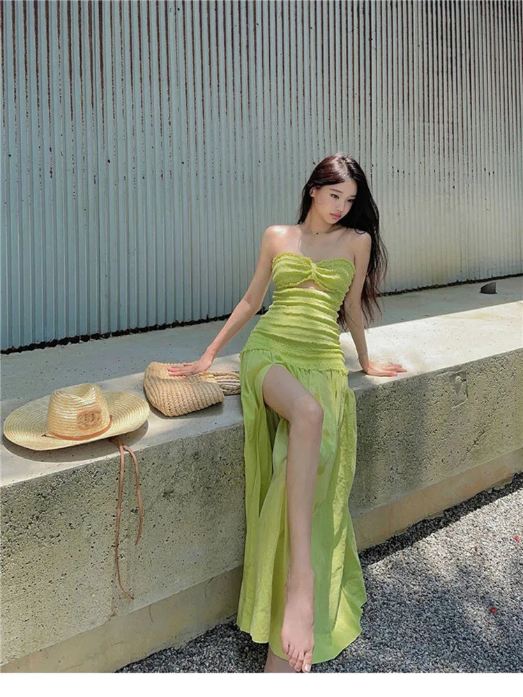 DAIIIBABYYY - New Summer Long Strapless Holiday Dress Women Fashion Sexy Hollow Sexy Split Green Dress Seaside Resort Vacation Beach Dress