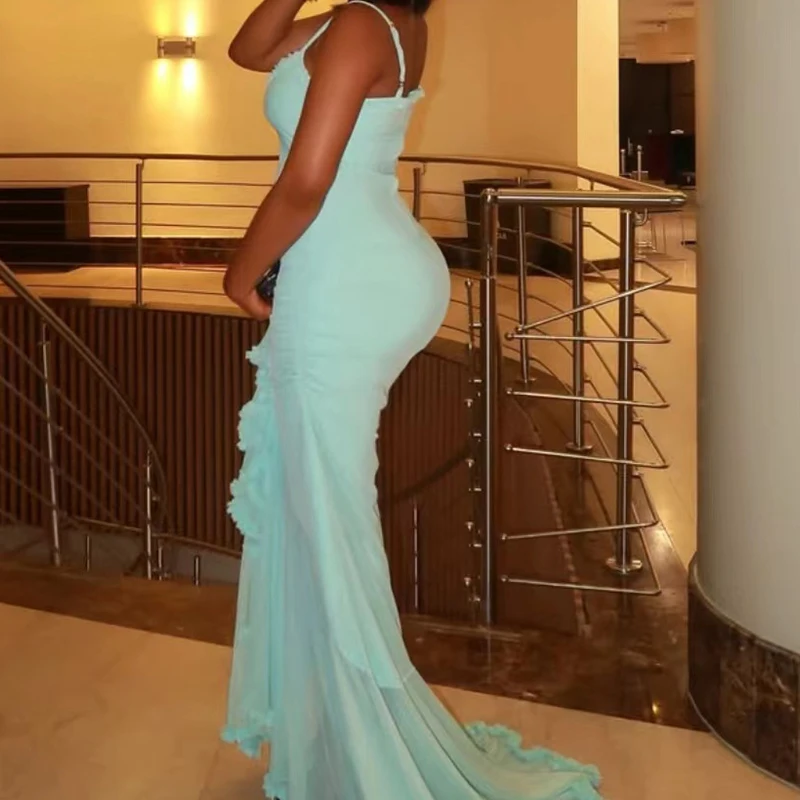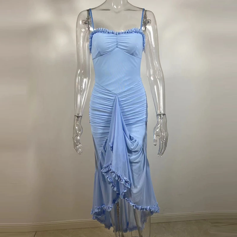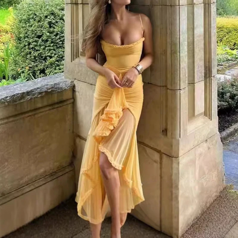 DAIIIBABYYY - New Summer Sexy Garden Party Solid Women's Dress Elegant Chest Wrap Mesh Patchwork Long Dress Casual Suspender Beach Dress Mujer