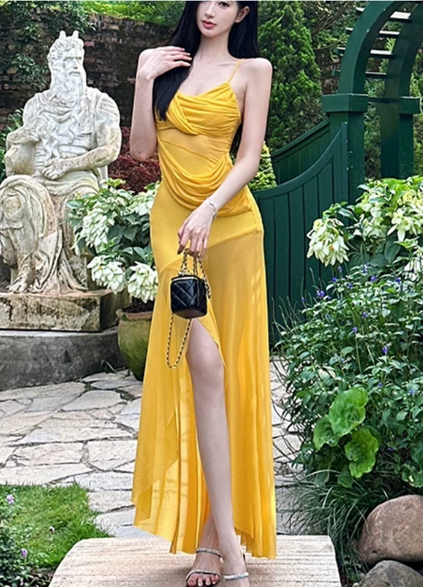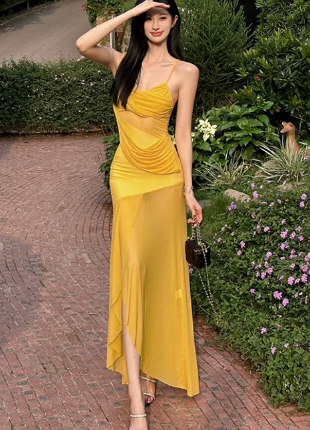 DAIIIBABYYY - New Summer Women Fashion Yellow Holiday Irregular Long Dress Sexy V Neck Sheer High Split Fairy Dress Seaside Resort Beach Dress