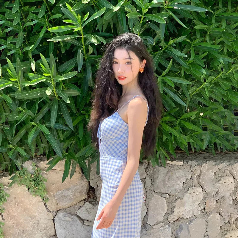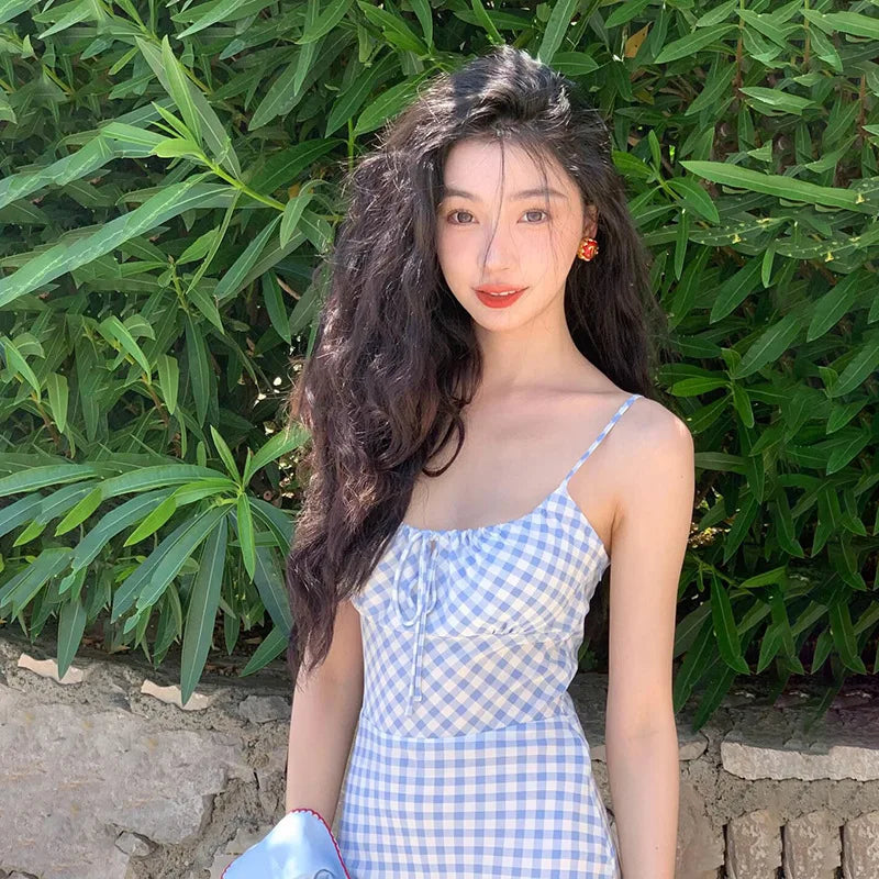 DAIIIBABYYY  -  New Women's Solid Color Slim Fit High Waist Fashionable Suspender Sleeveless Plaid Dress