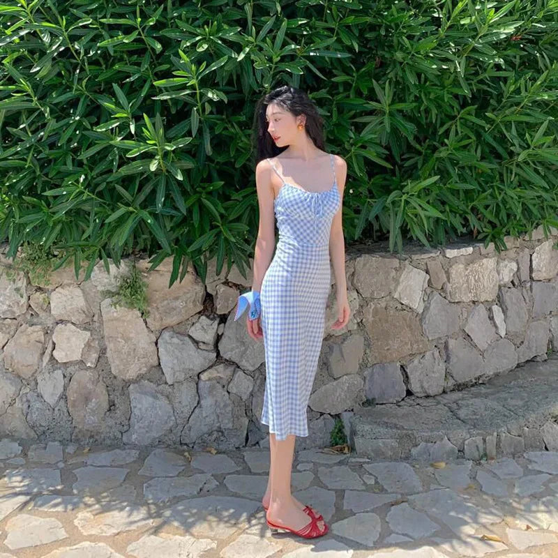DAIIIBABYYY - New Women's Solid Color Slim Fit High Waist Fashionable Suspender Sleeveless Plaid Dress