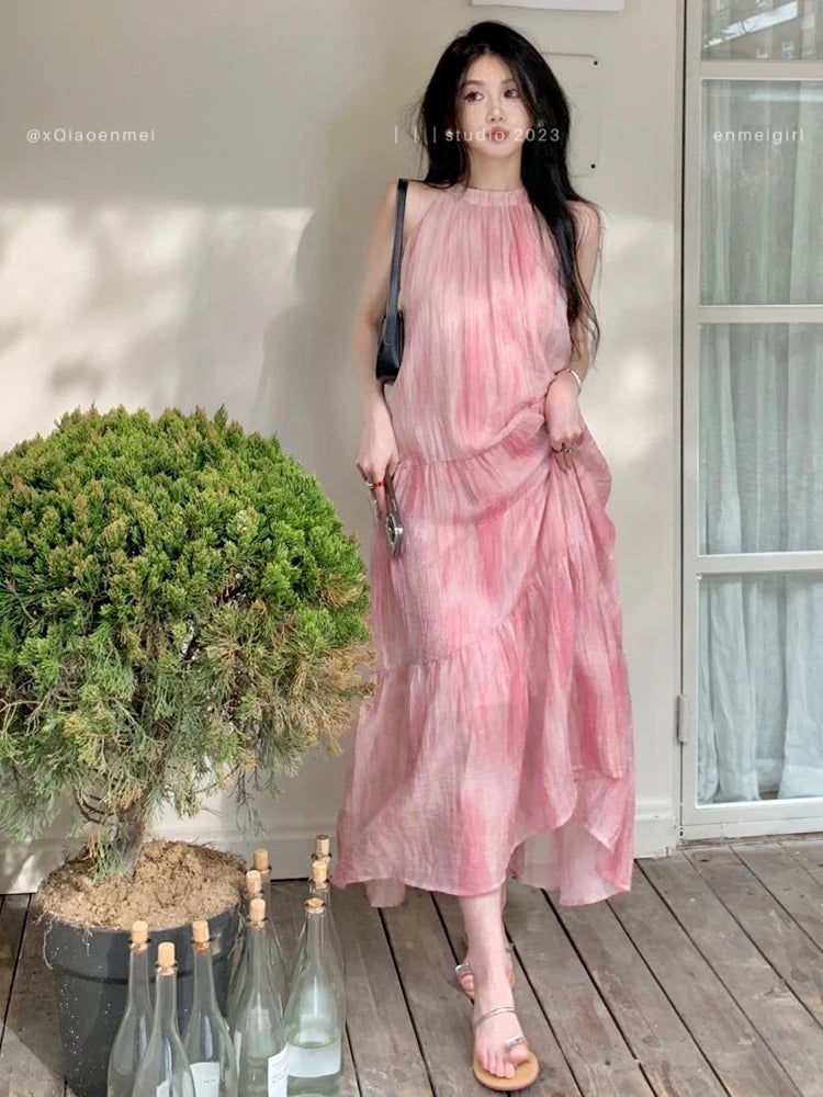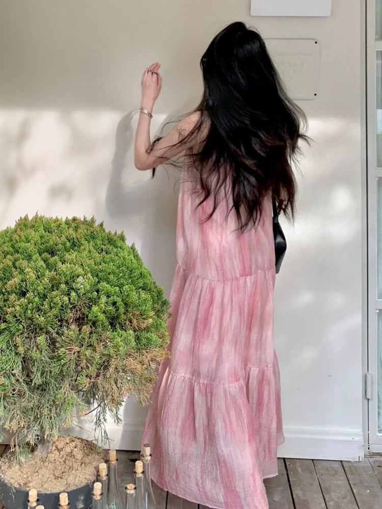 DAIIIBABYYY - Pink Tie Dye Beach Long Dress Women Elegant Casual Sleeveless Sweet Tanks Dress Casual Vintage Summer Lady Loose Long Dress