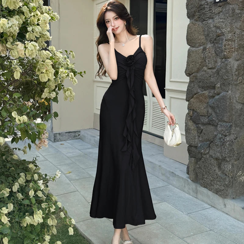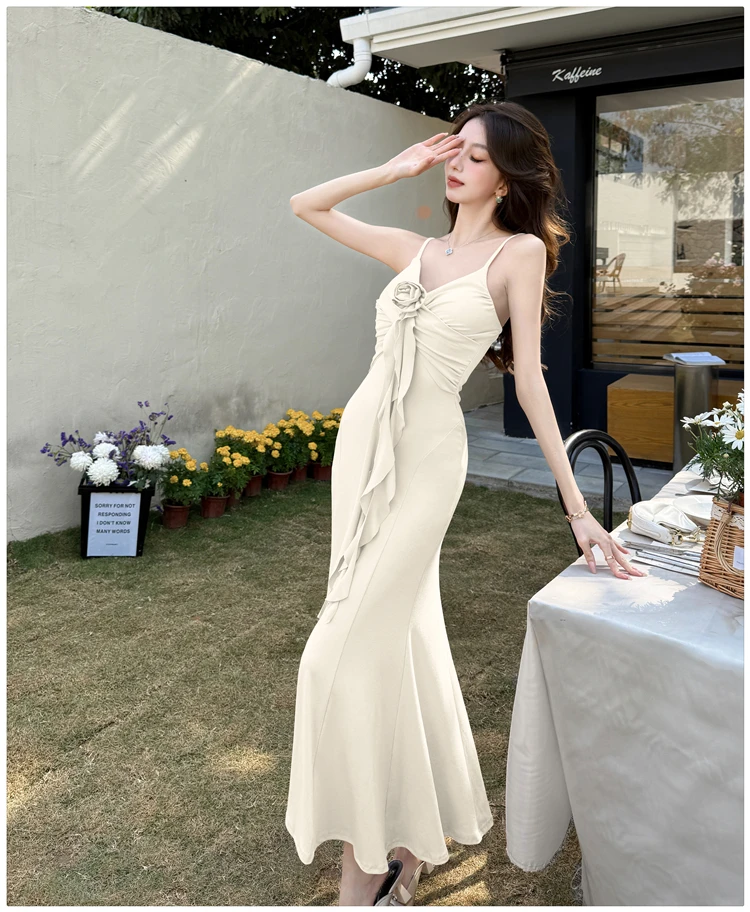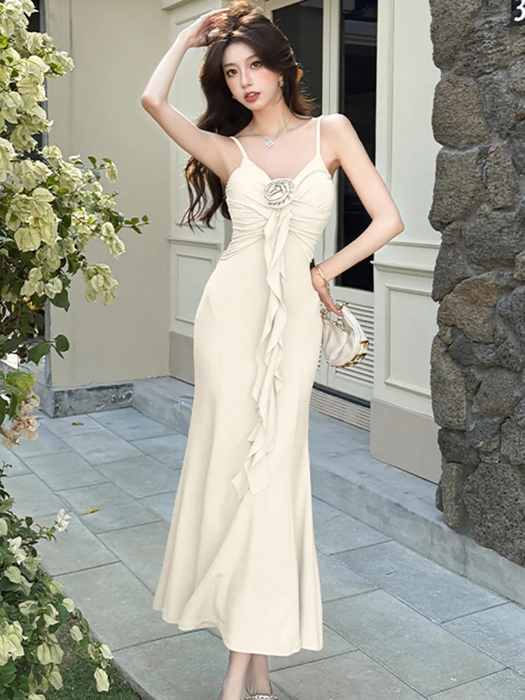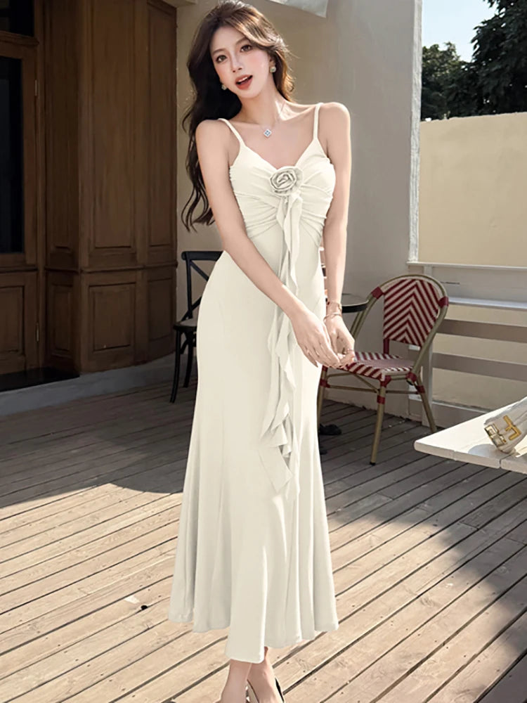 DAIIIBABYYY - Pink V-Neck Sexy Sling Long Dress Summer Elegant Luxury Chic Ruffled Long Dress Women Korean Fashion Bodycon Prom Dress