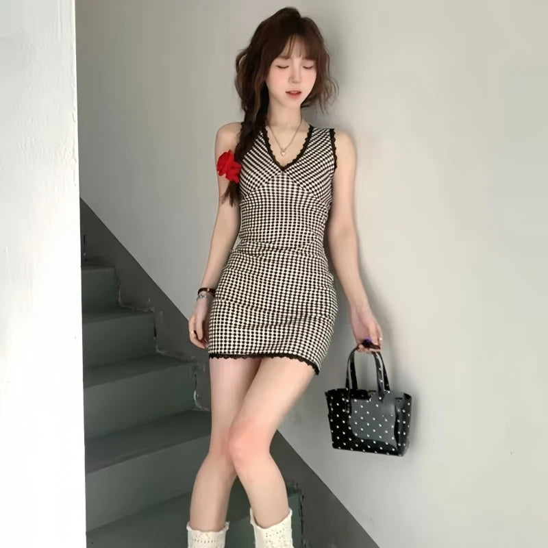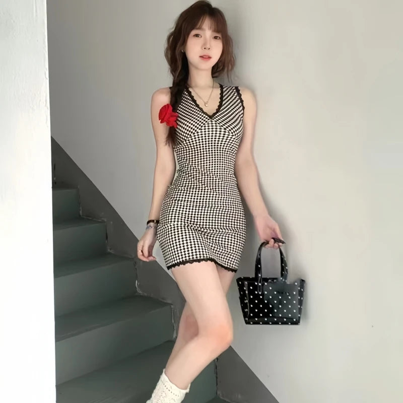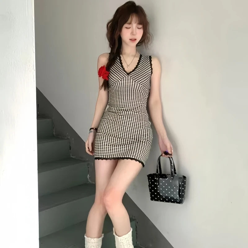 DAIIIBABYYY  -  Pure Sexy Lace Edge V-neck Dress Women's Summer Plaid Patchwork Slim Sleeveless Hip Wrap Short Dress Fashion Female Clothes