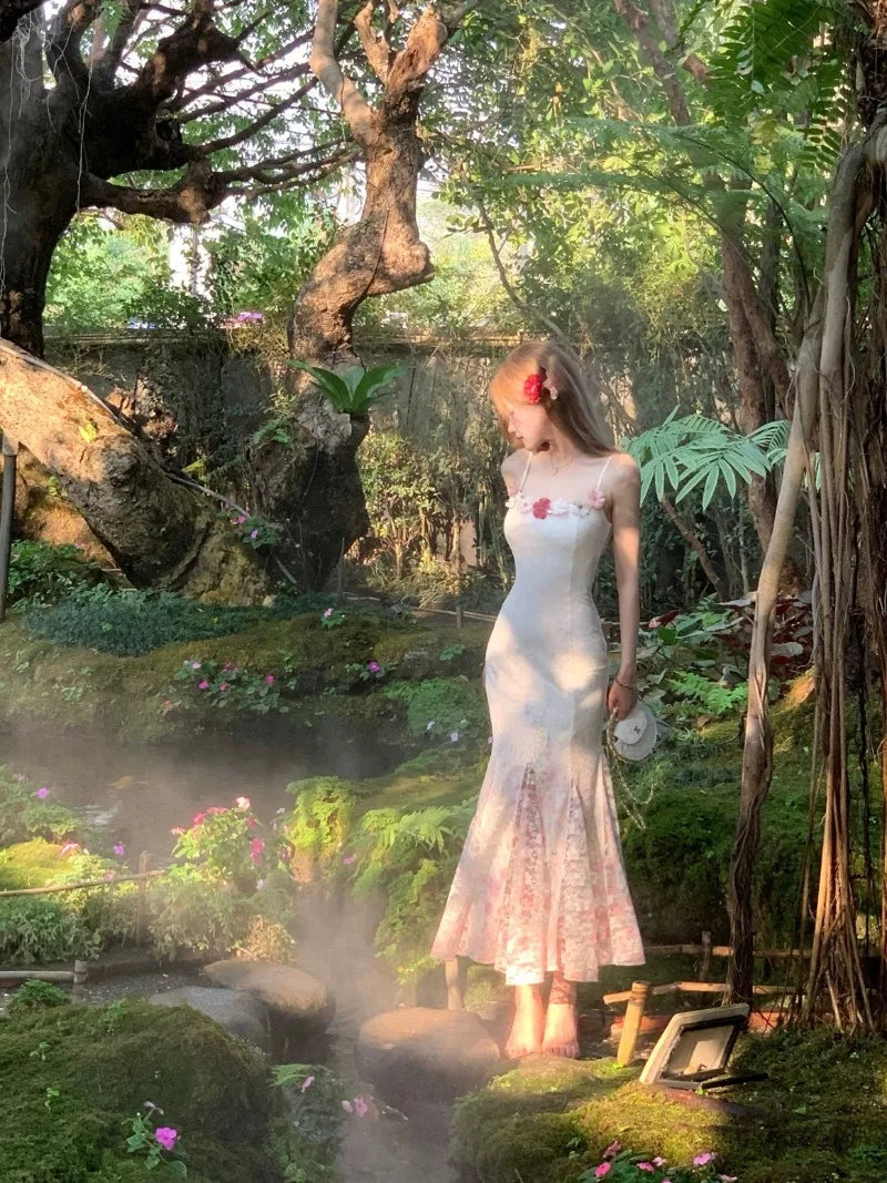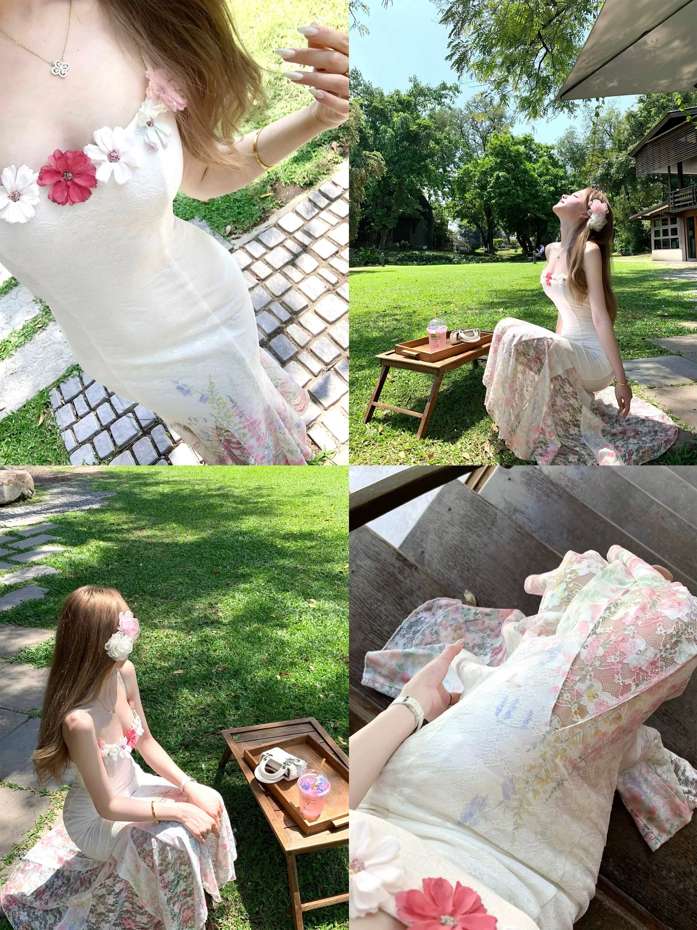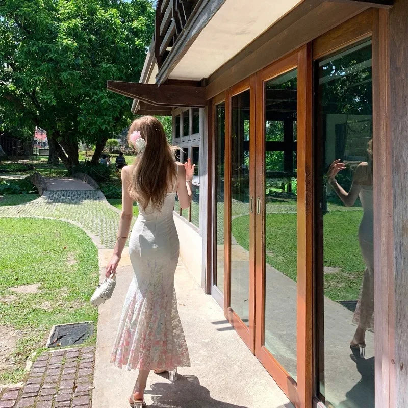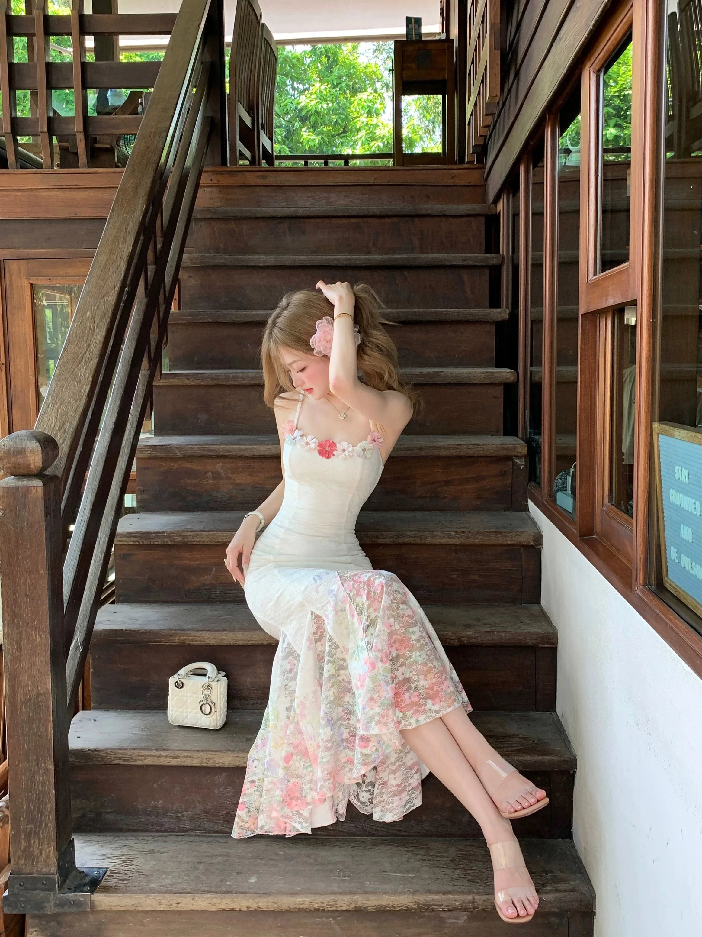 DAIIIBABYYY - Pure Sexy Lace Strap Dress Women's Summer Three-dimensional Flower Slim Fit Mermaid Long Dress Fashion Female Clothes