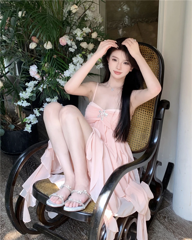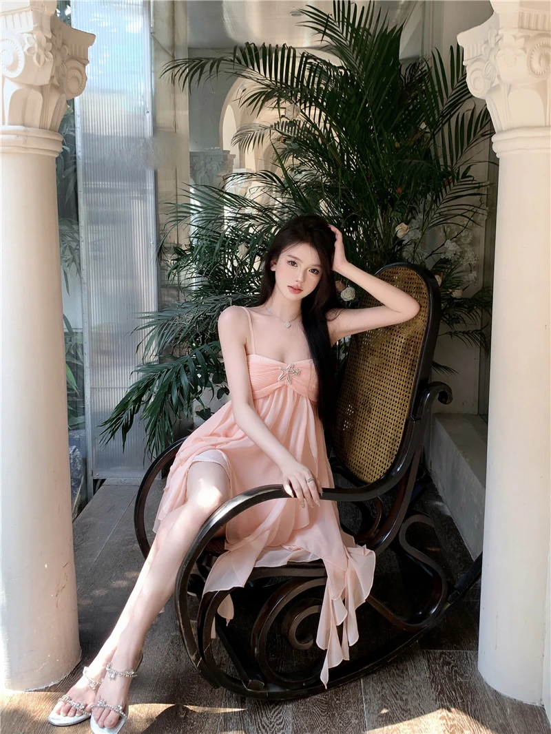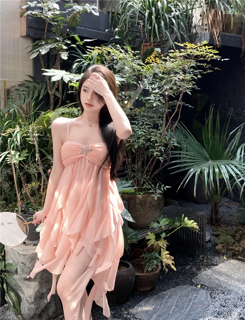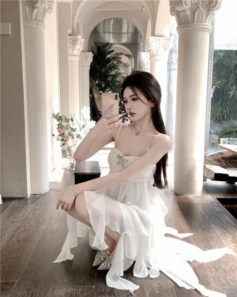 DAIIIBABYYY - Pure Sexy Sweet Hot Girl Chiffon Strap Dress Women's Summer Square Collar Backless Fairy Ruffled Short Dress Female Clothes