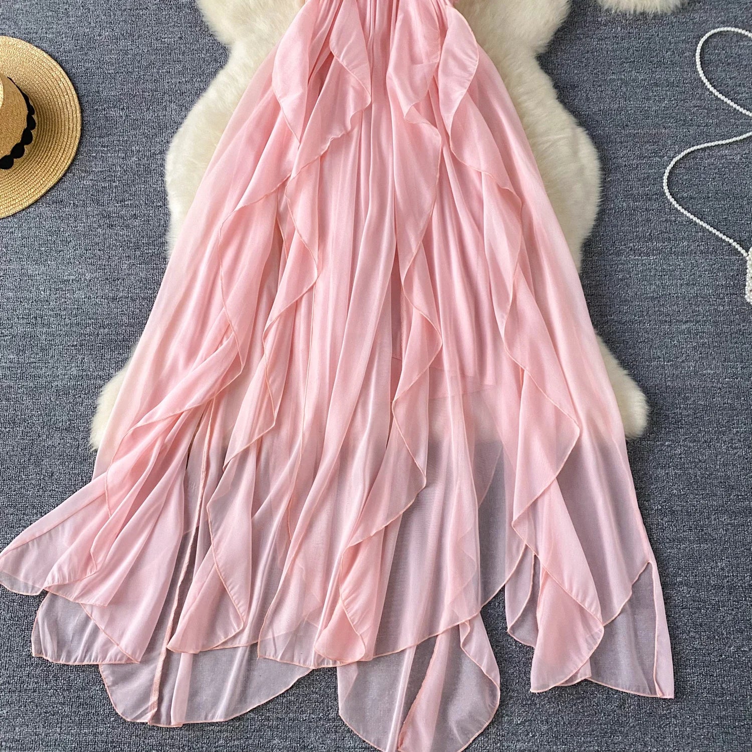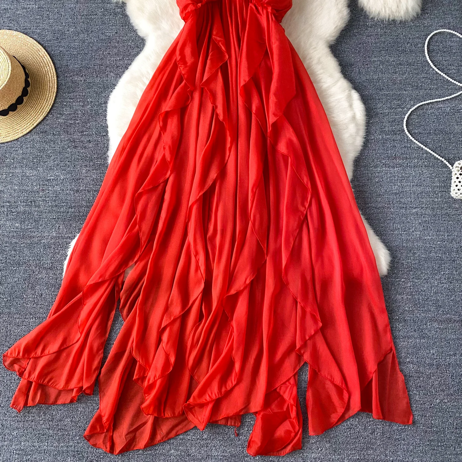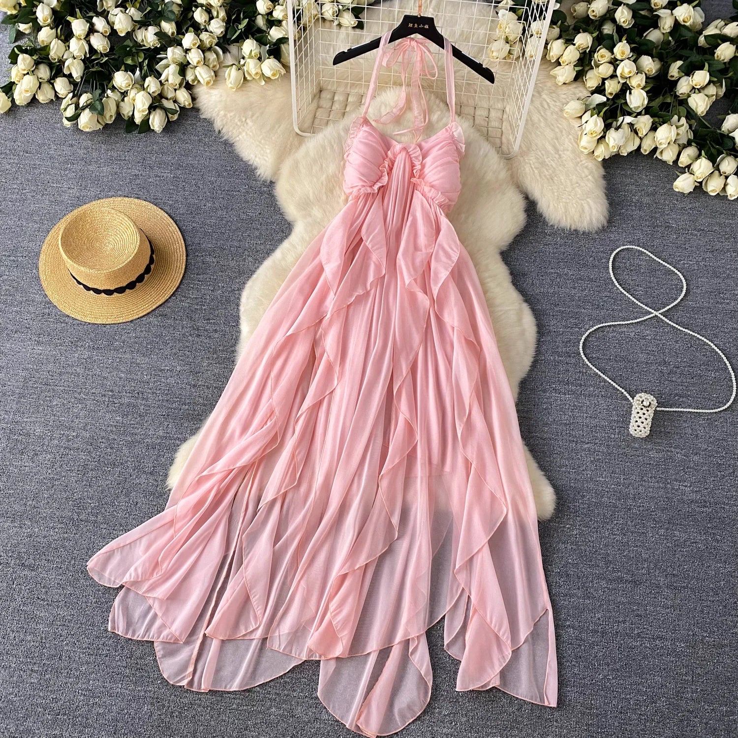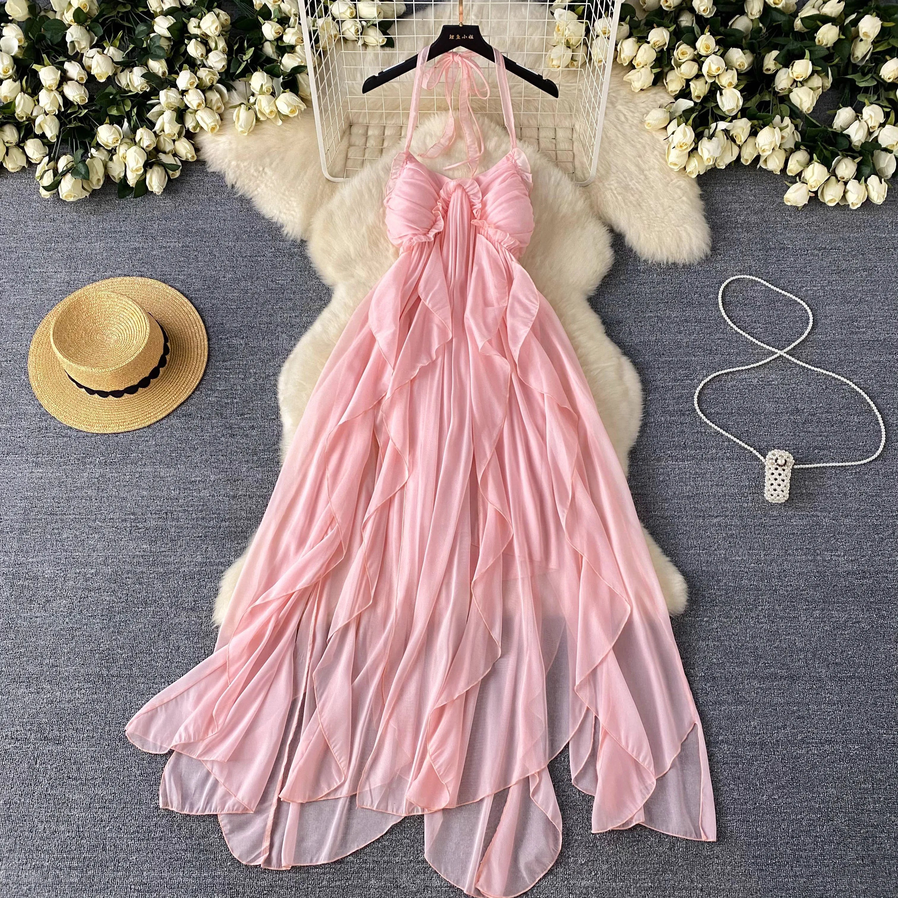 DAIIIBABYYY - Retro Ruffle chiffon halter off shoulder backless Dress asymmetrical Casual sweet High Waist evening Women Summer dresses