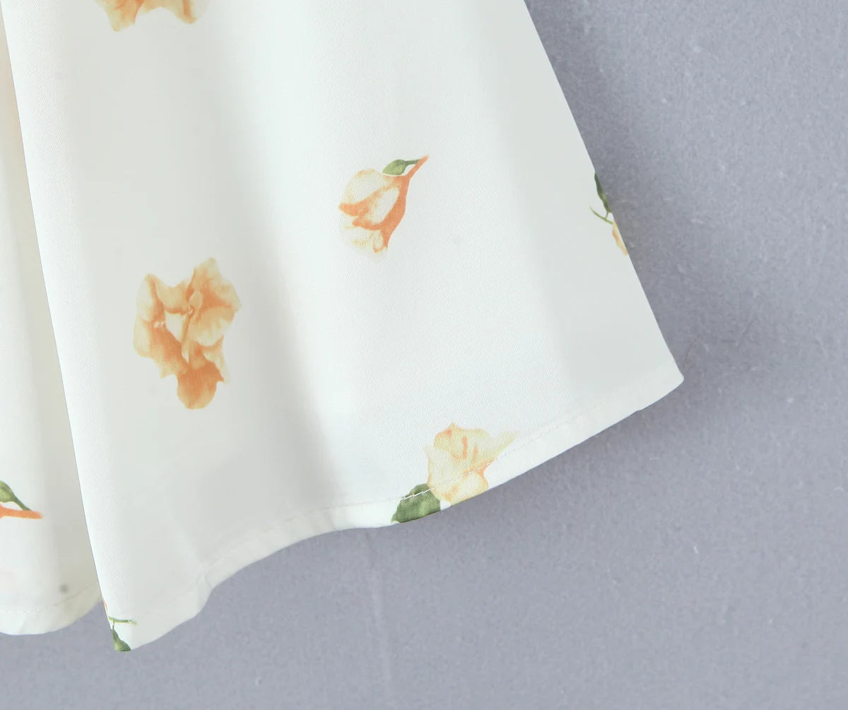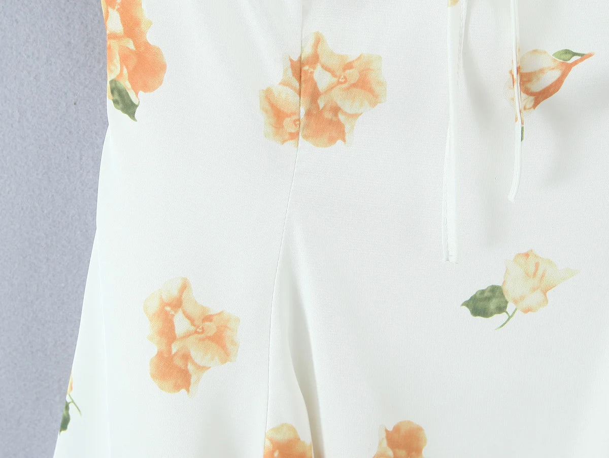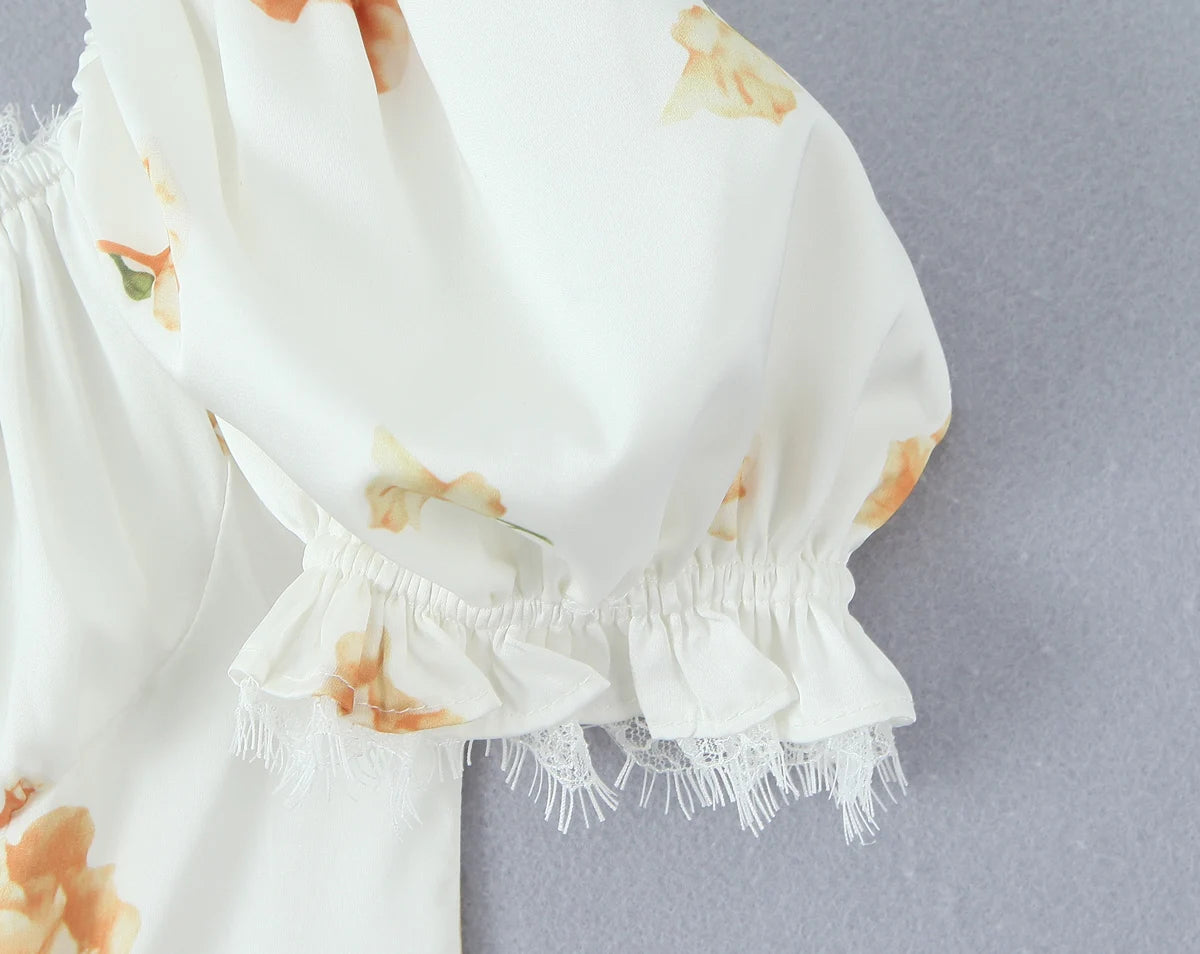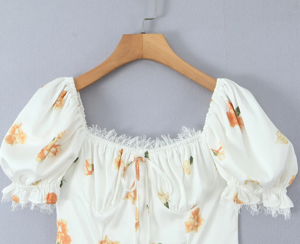 Daiiibabyyy  Retro White Flower Bow Ruched Chest Lace Slash Collar Satin Mini Dress Women Short Puff Sleeve Low Waist Swing Dresses Robe