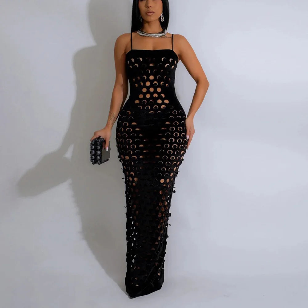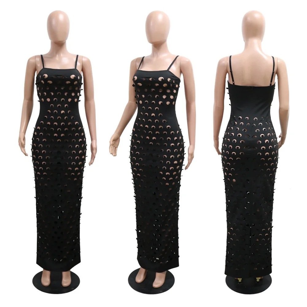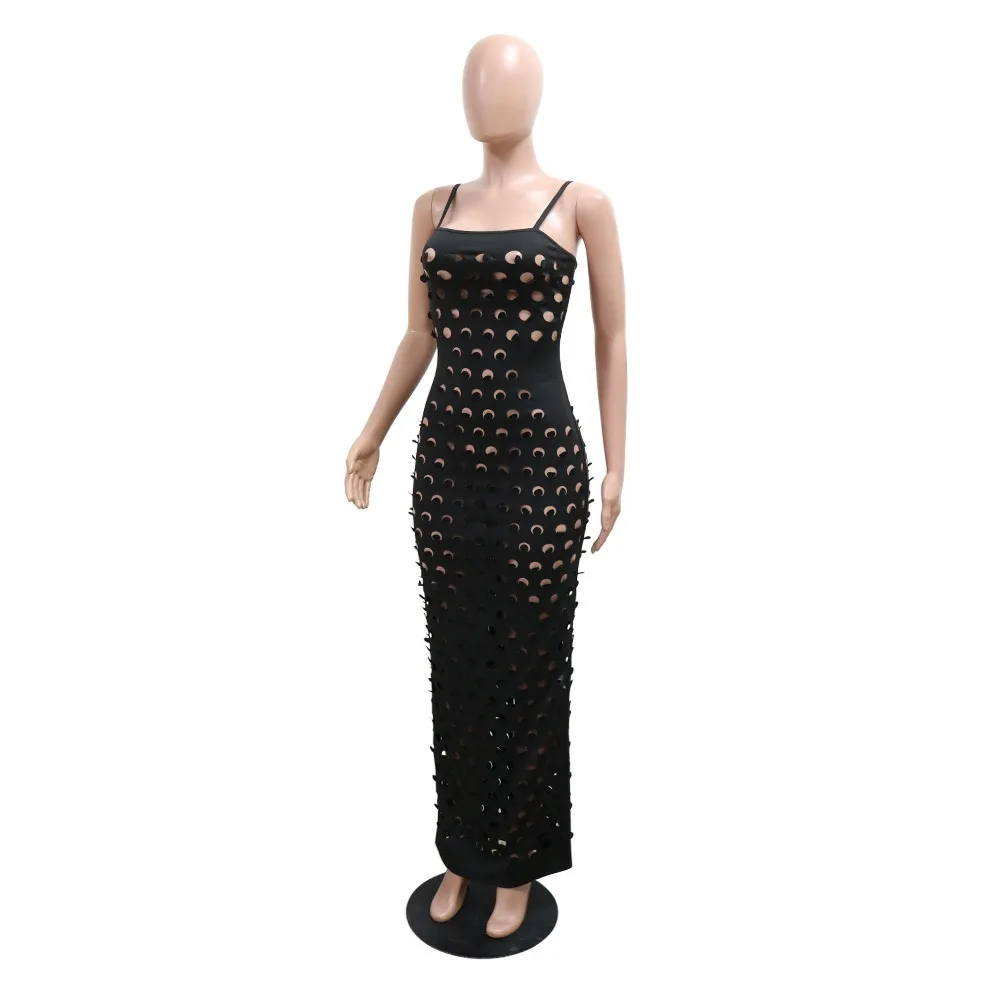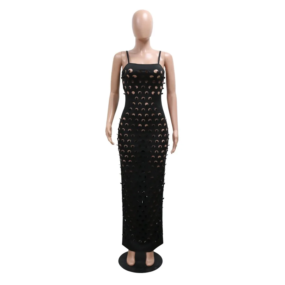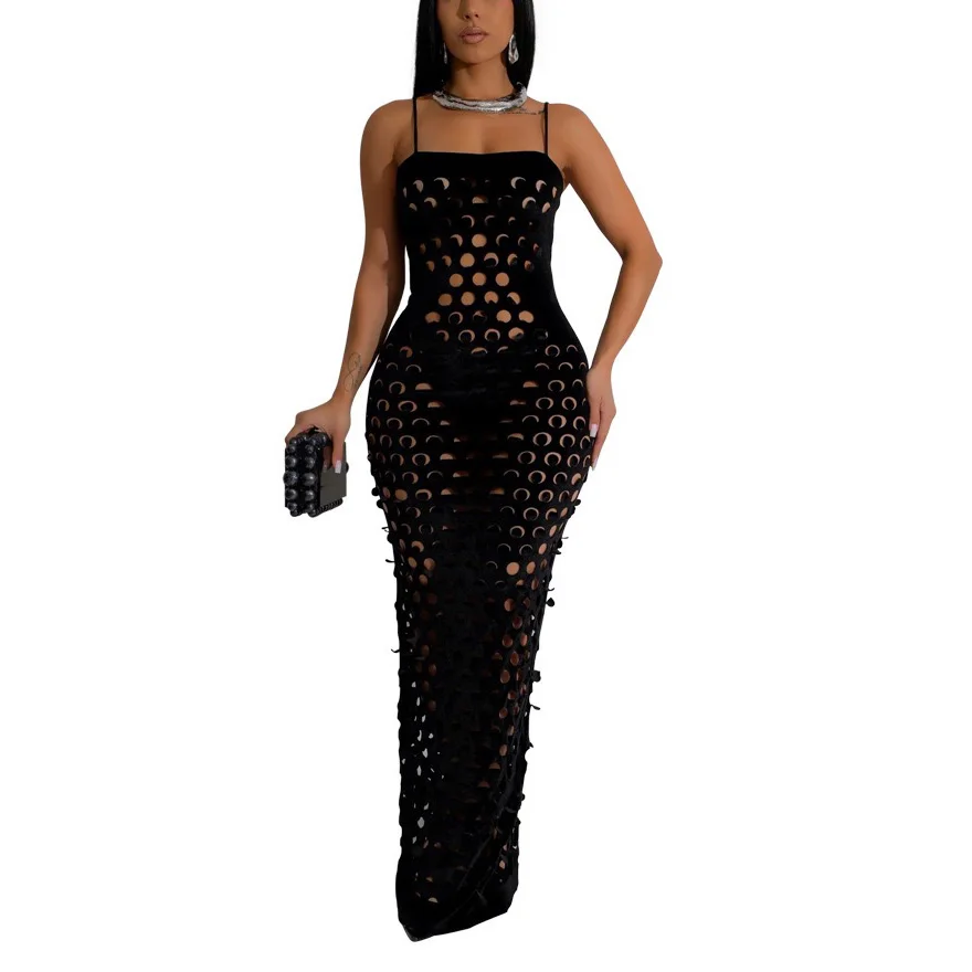 DAIIIBABYYY - Sexy Dresses for Women Spaghetti Strap Black Hollow Out Sheath Floor Length Elegant Ladies Birthday Party Dinner Club Vestidos