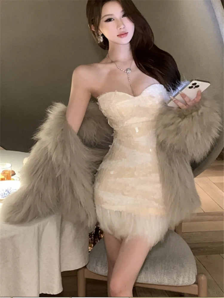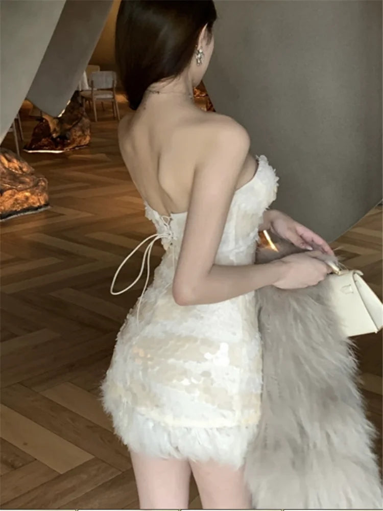 DAIIIBABYYY - Sexy Glitter Stunning Sequined Pencil Party Dress Women Fashion Strapless Feather Hem Short Dress Lace Up Back Bodycon Dress