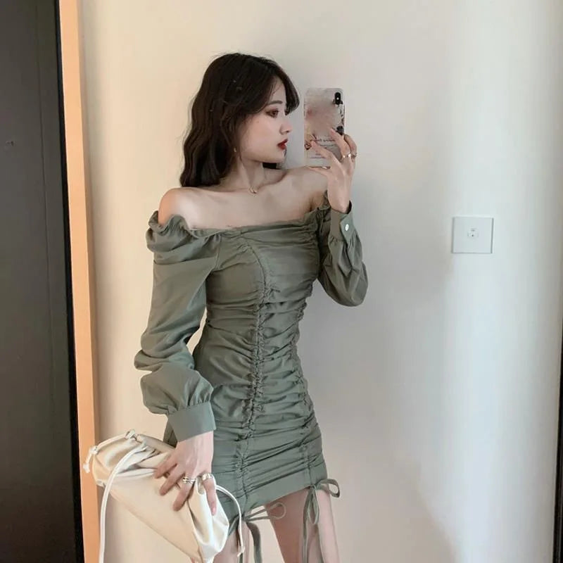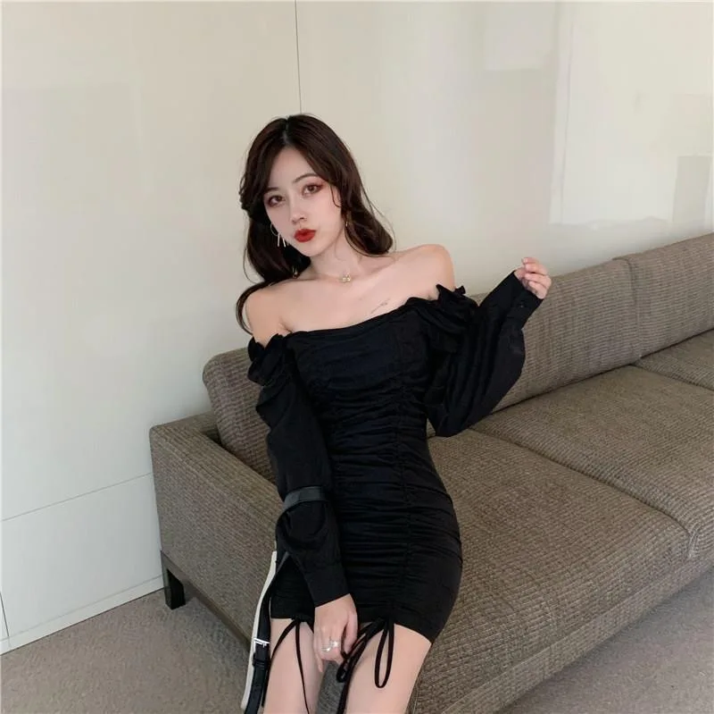 Daiiibabyyy Sexy Shirring Slash Neck Puff Sleeve Women Dress New Spring Autumn Korean Style Above Knee Solid Color Belt Long Skirt