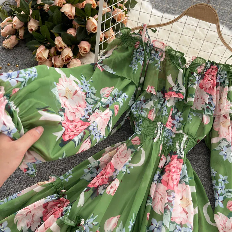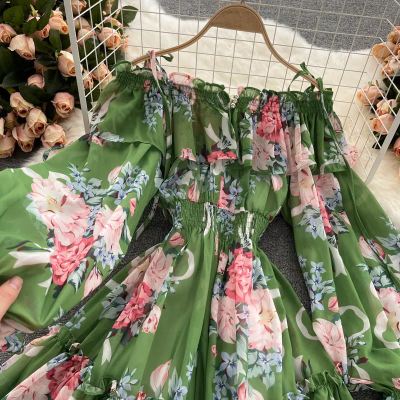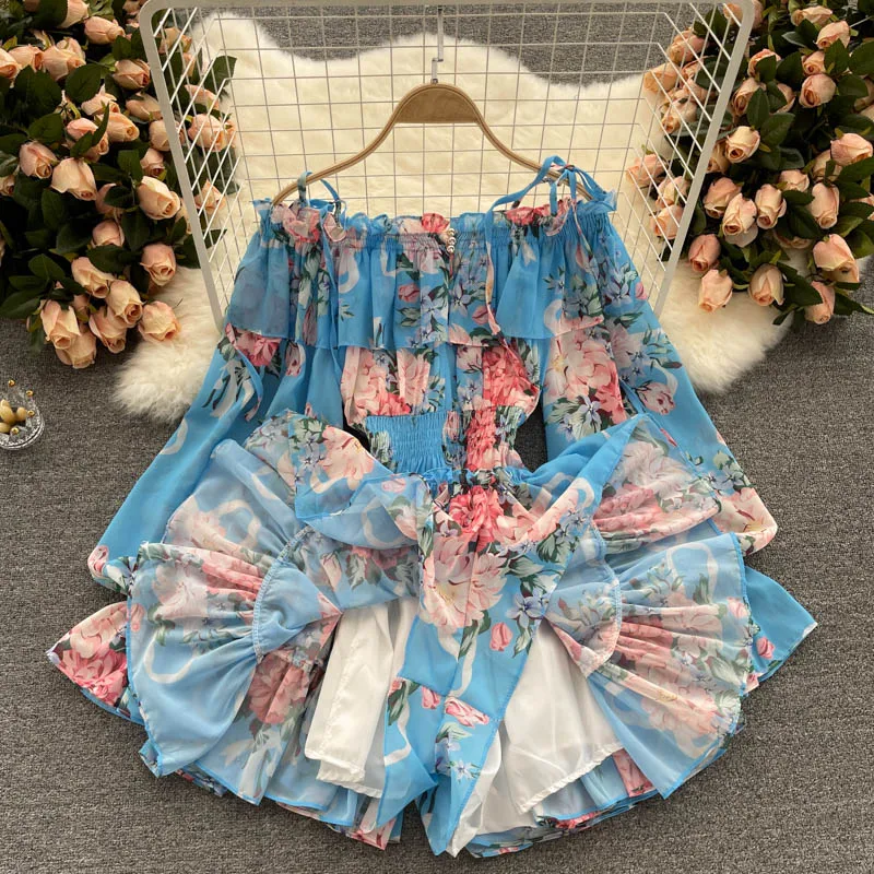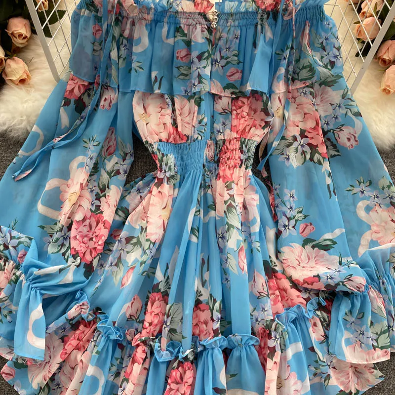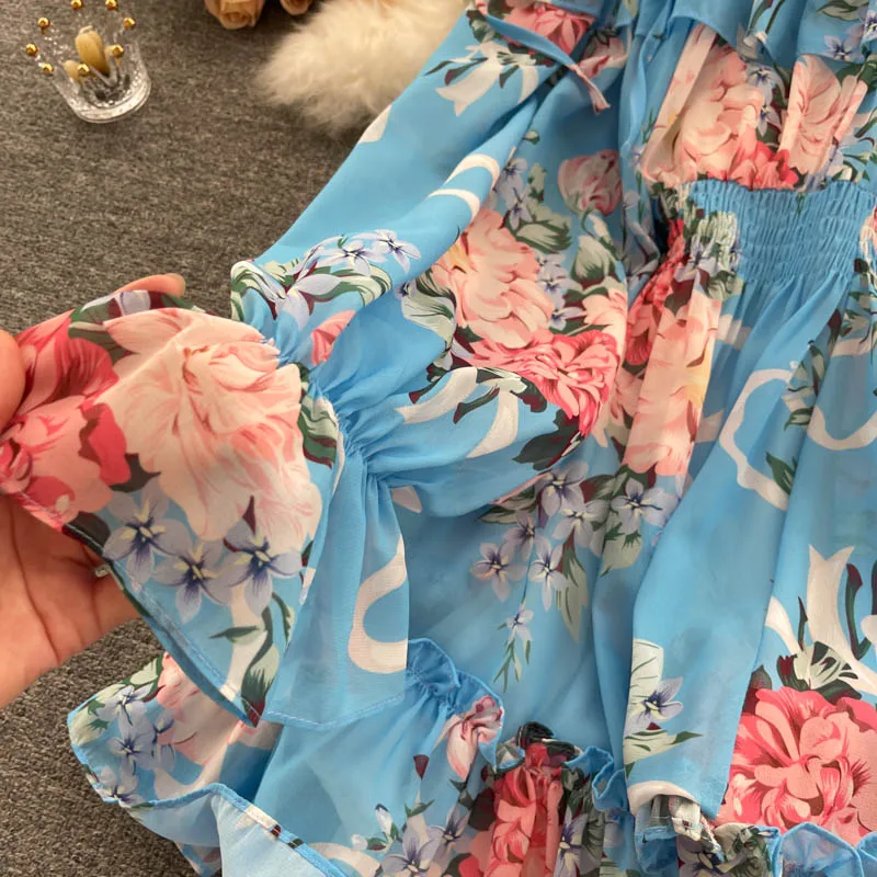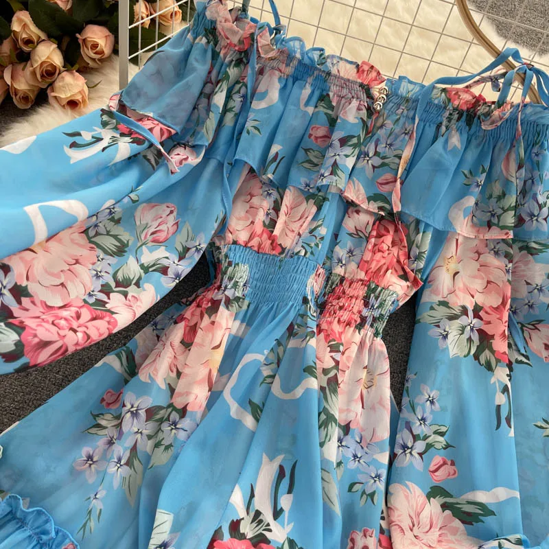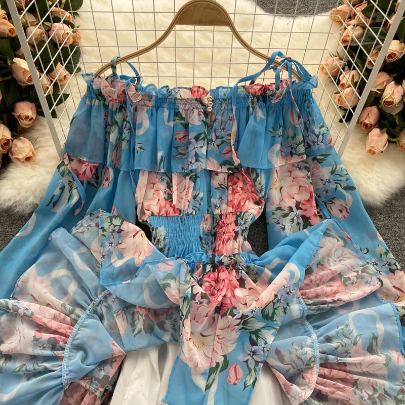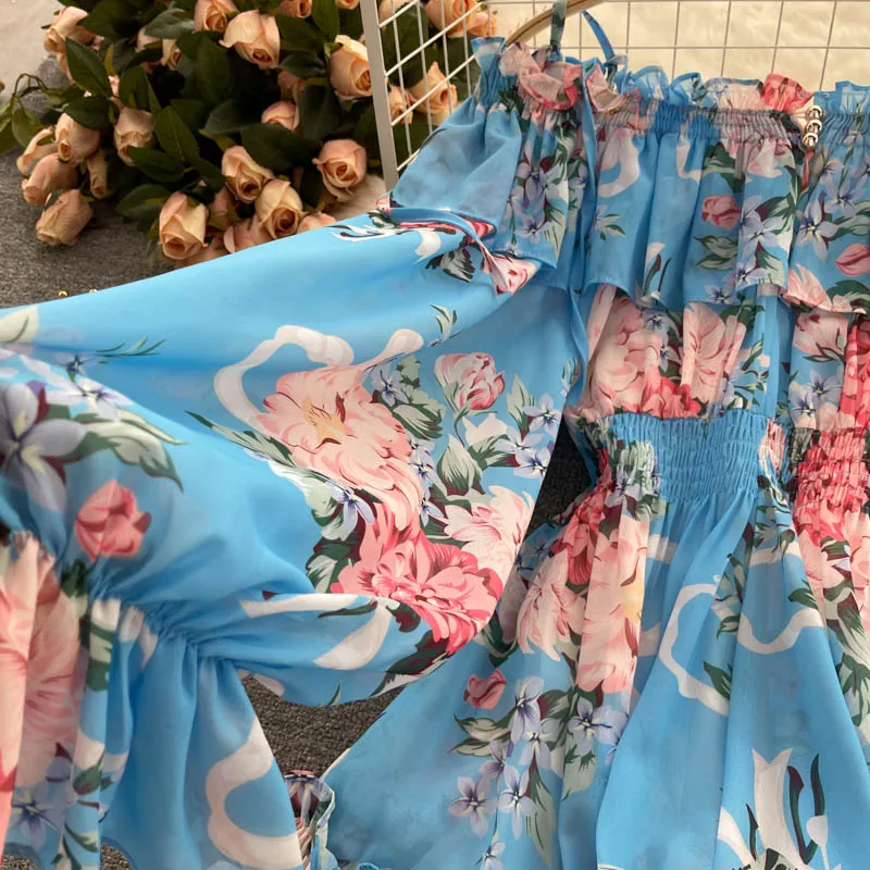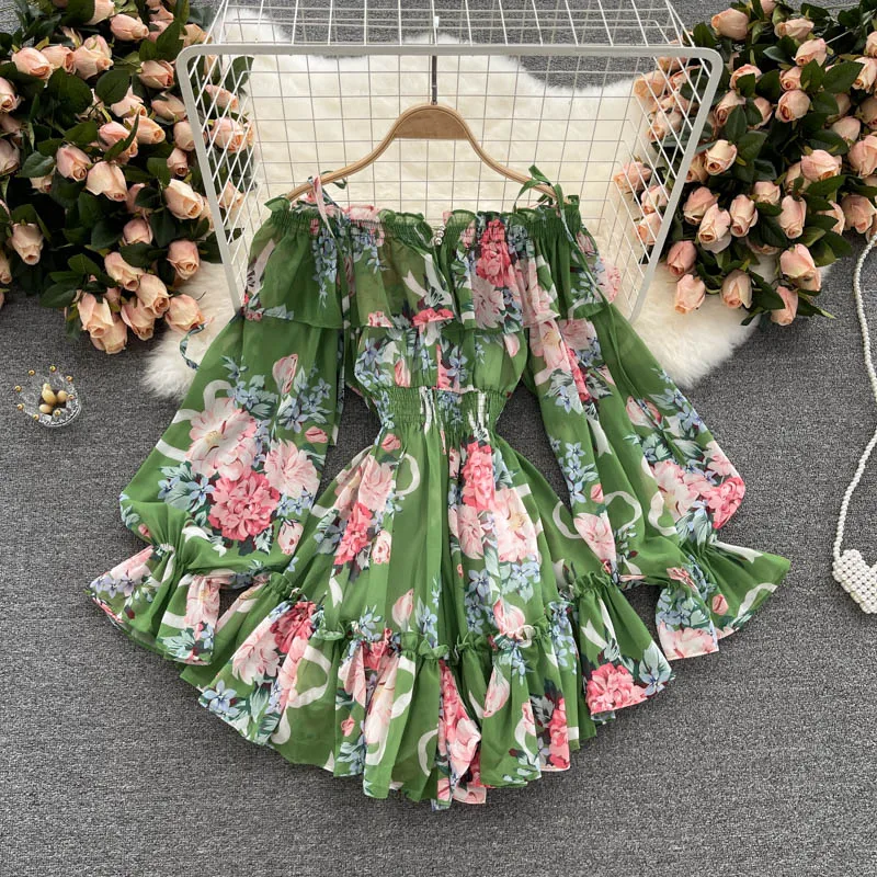DAIIIBABYYY - Sexy Slash Neck Spaghetti Strap Mini Chiffon Dress Women Summer Vacation Beach Flare Long Sleeve Ruffle Blue/Green Vestidos New