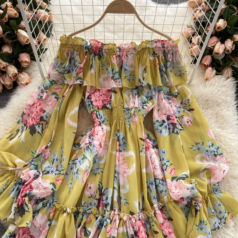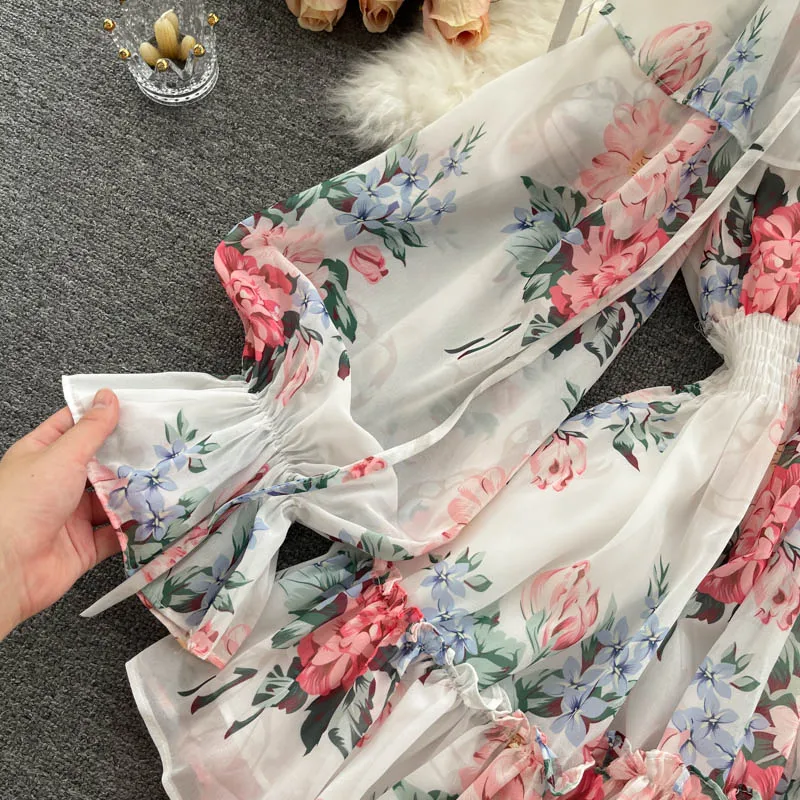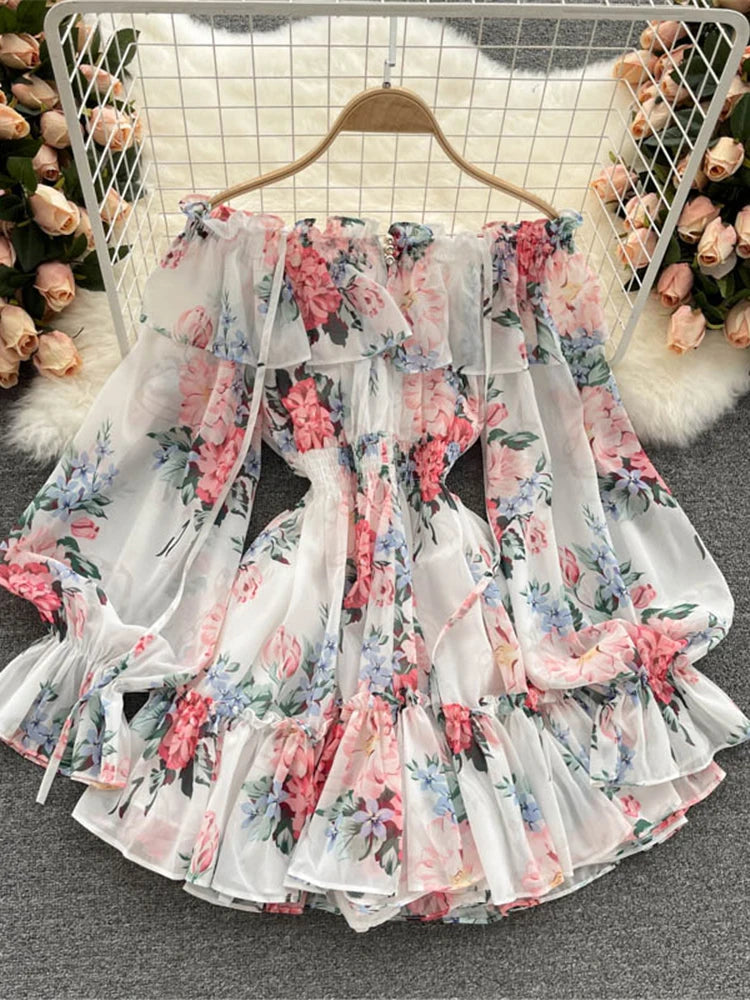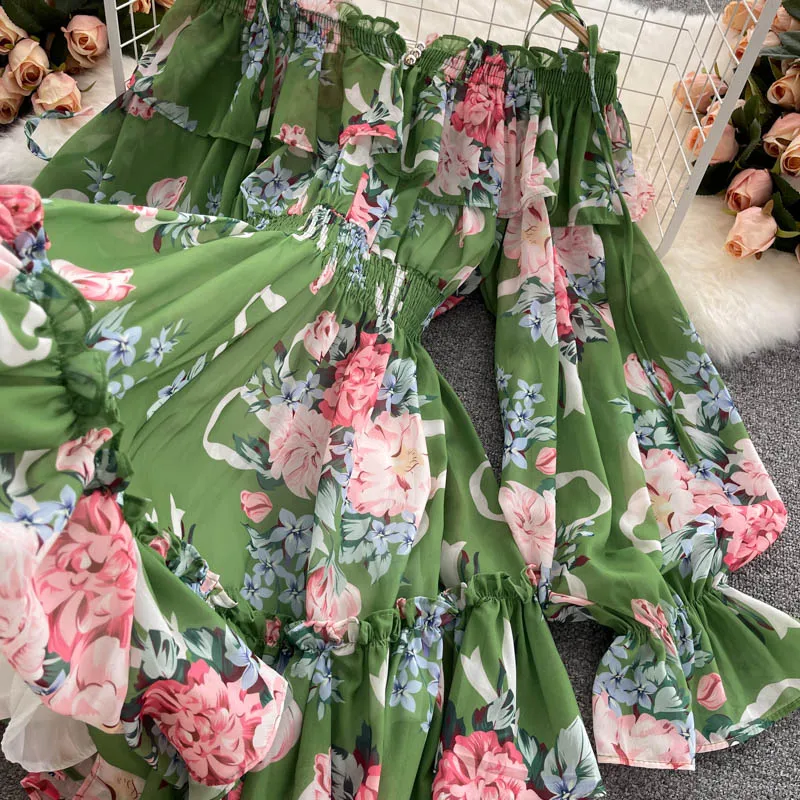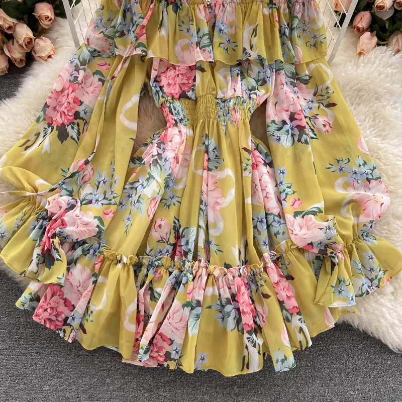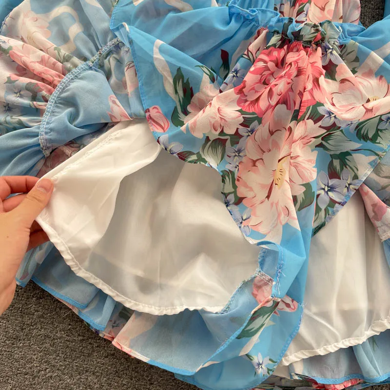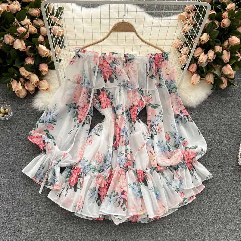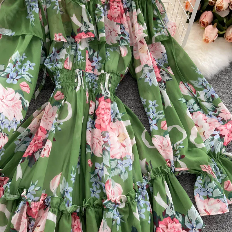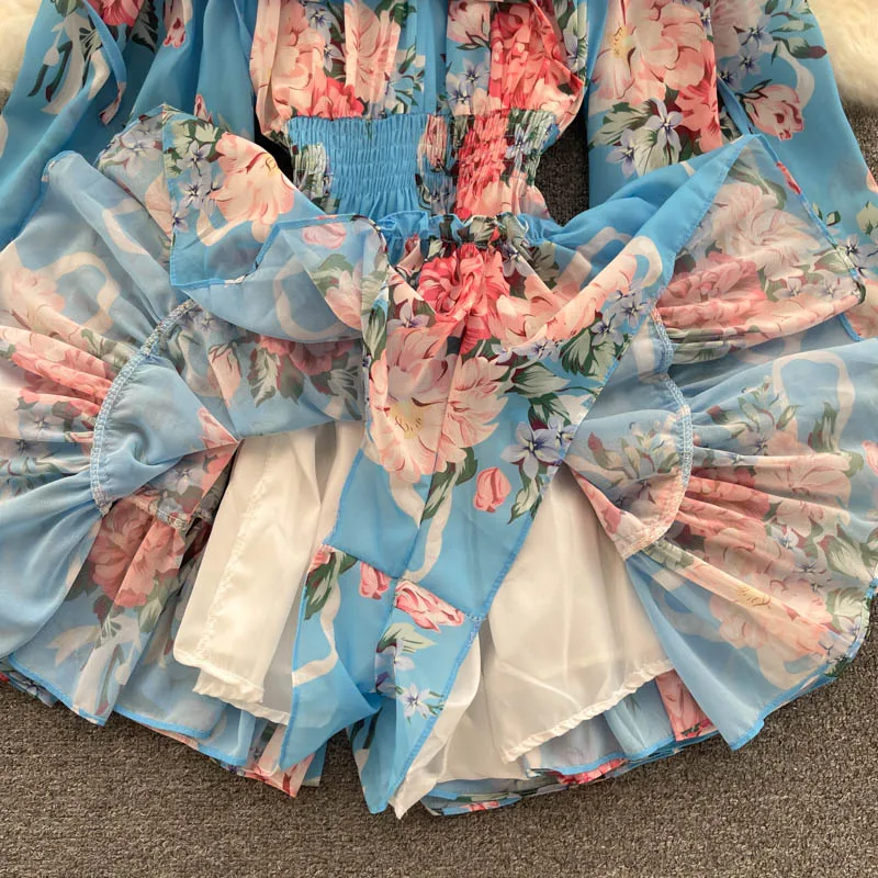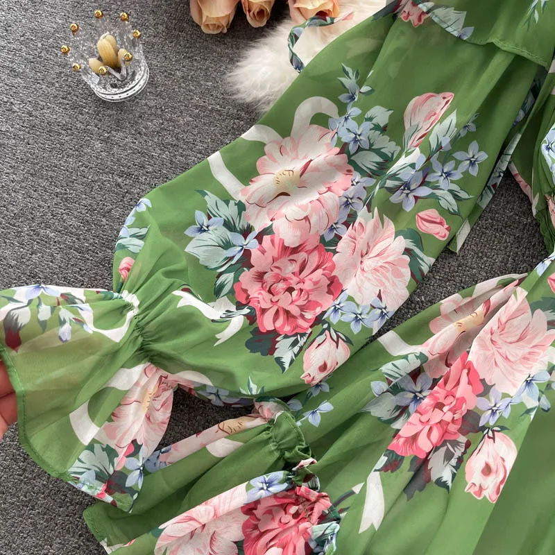 DAIIIBABYYY - Sexy Slash Neck Spaghetti Strap Mini Chiffon Dress Women Summer Vacation Beach Flare Long Sleeve Ruffle Blue/Green Vestidos New