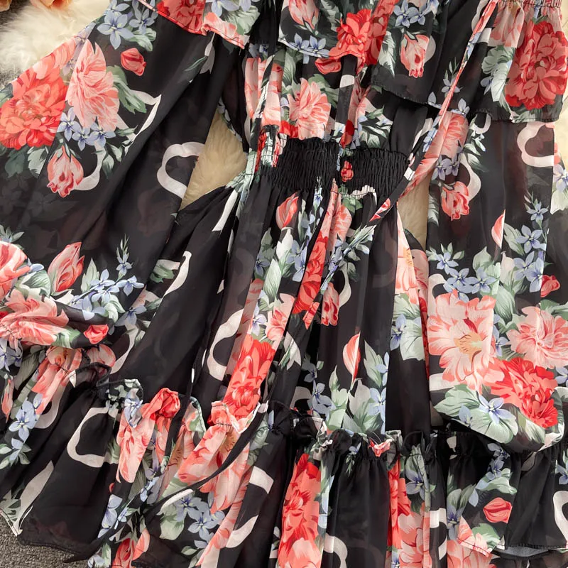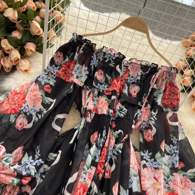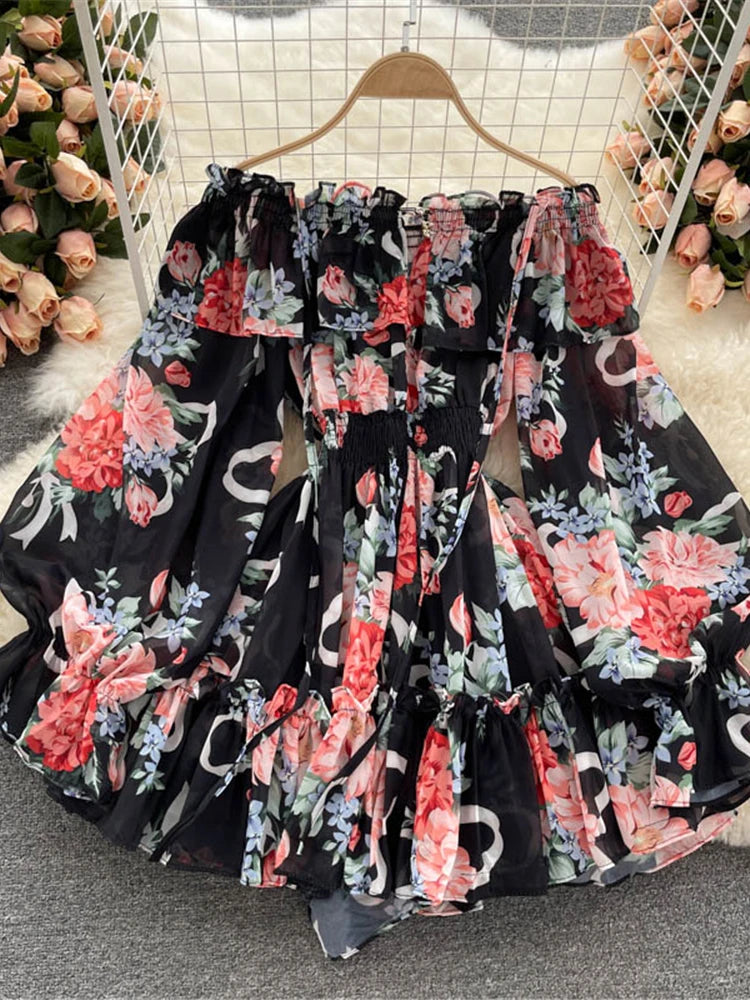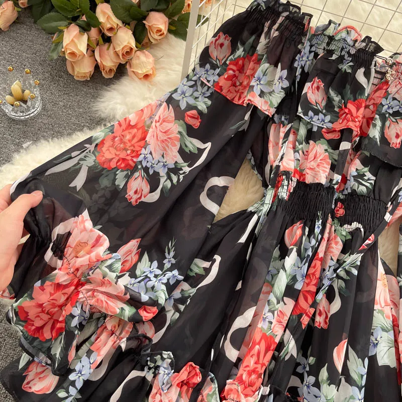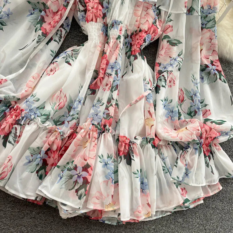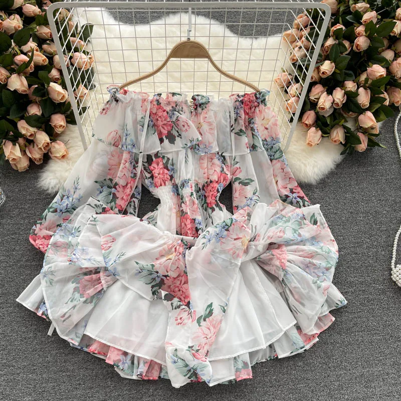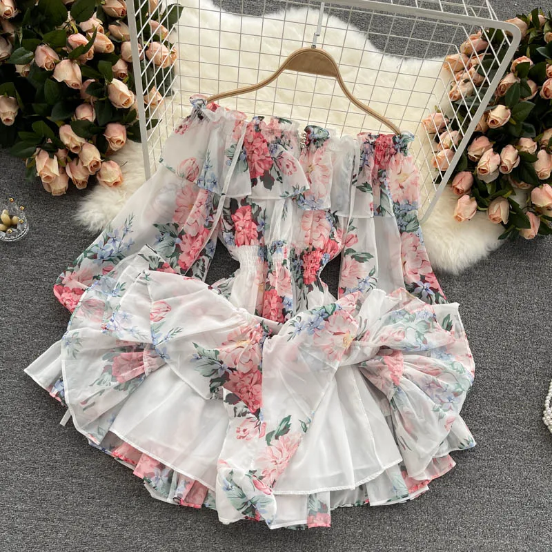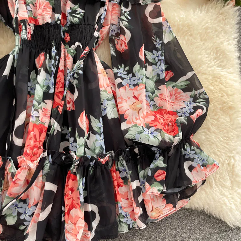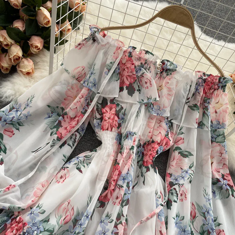 DAIIIBABYYY - Sexy Slash Neck Spaghetti Strap Mini Chiffon Dress Women Summer Vacation Beach Flare Long Sleeve Ruffle Blue/Green Vestidos New