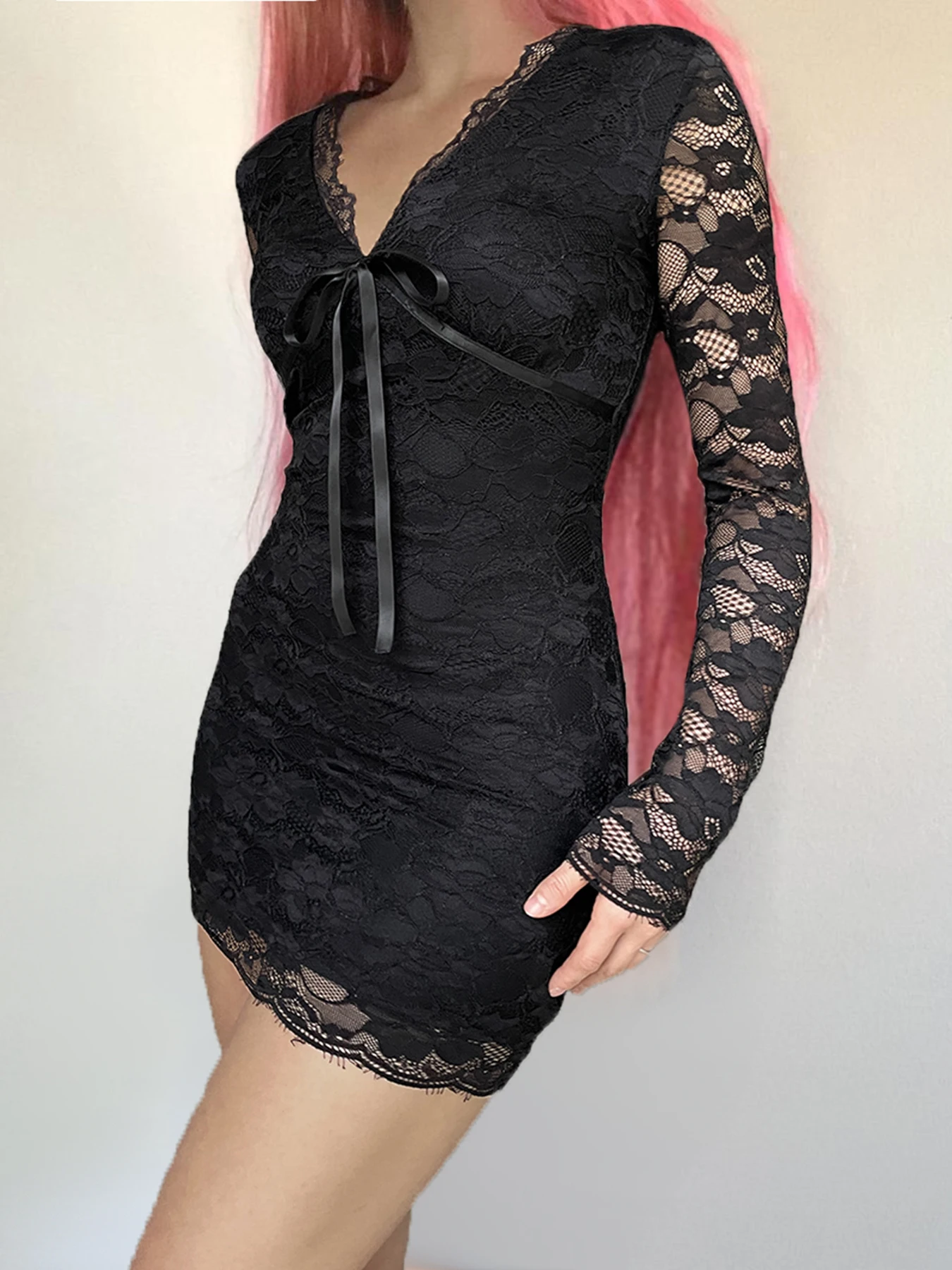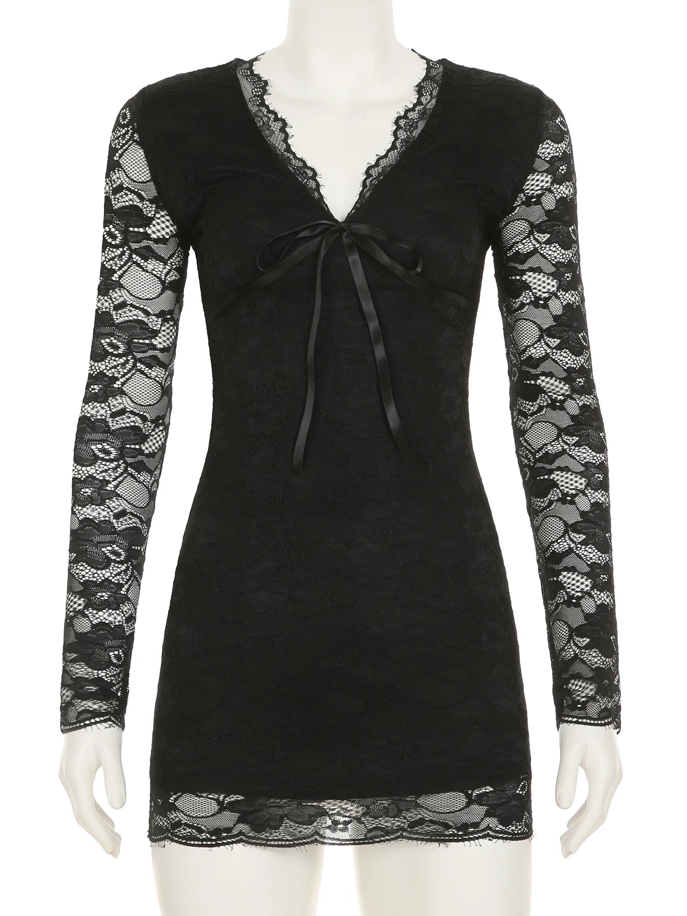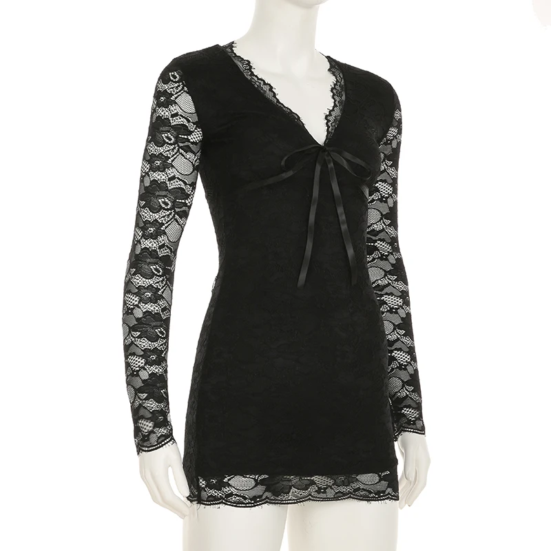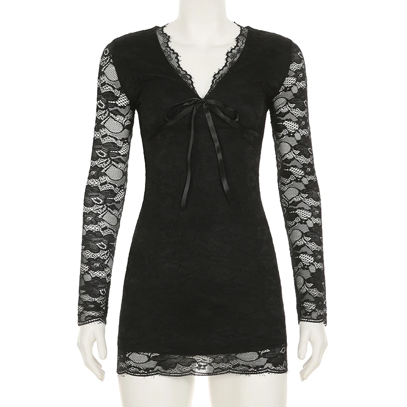 DAIIIBABYYY - Sexy Slim Lace Bodycon Dress Casual Bow V-Ncek Long Sleeve Mini Dresses For Women 2025 Spring Autumn Streetwear Lady