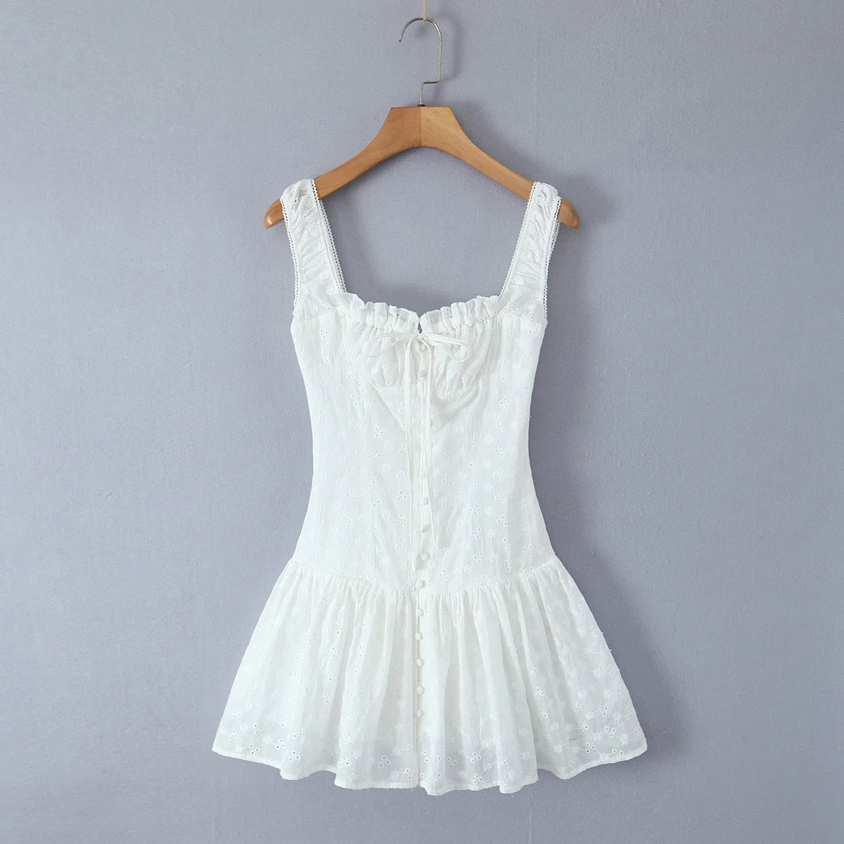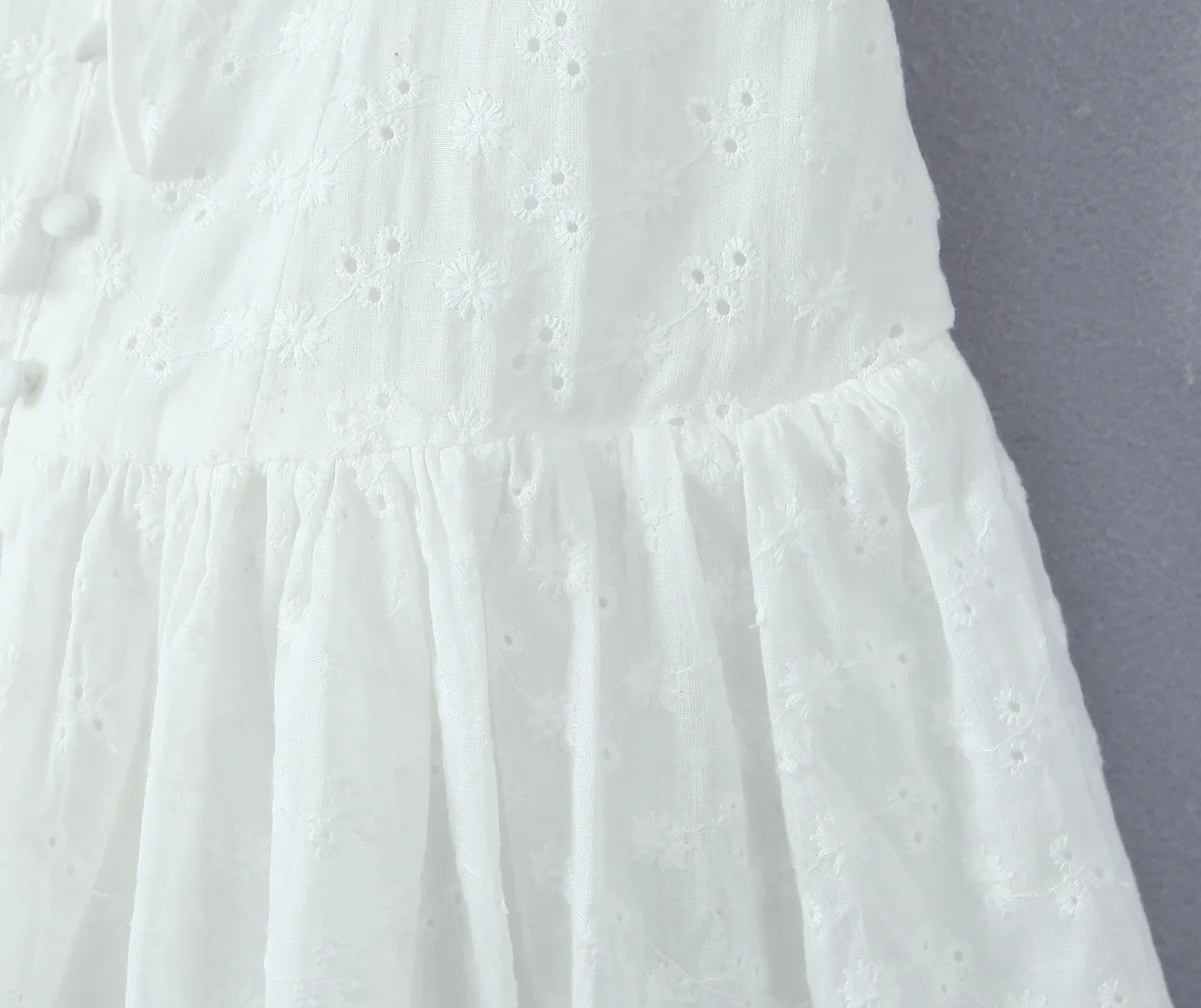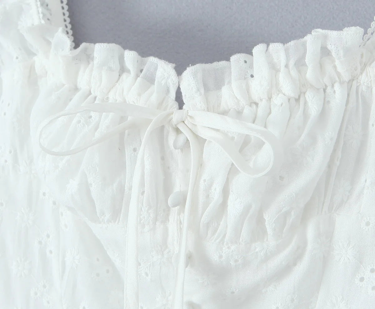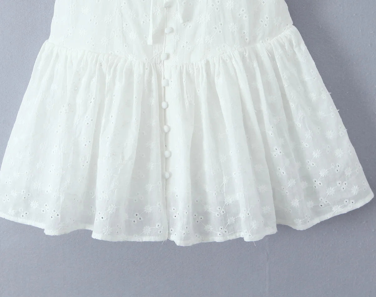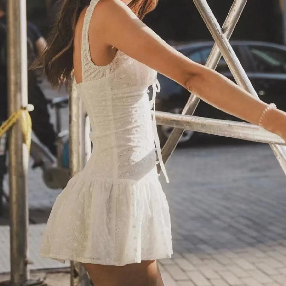 Daiiibabyyy Sexy White Emboridery Flower Bow Ruched Chest Elastic Strap Mini Tank Dress Low Waist Spliced Folded Swing Women Sleeveless Robe