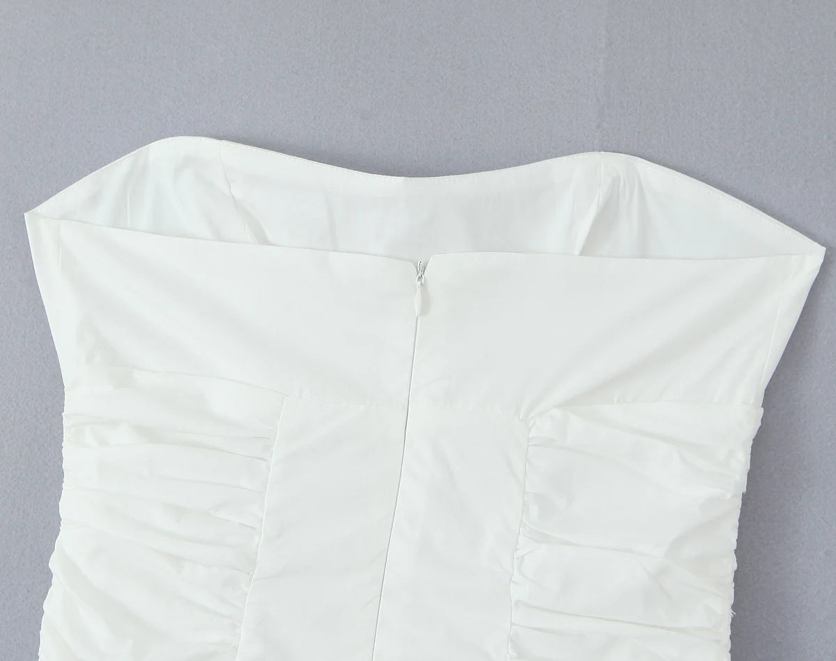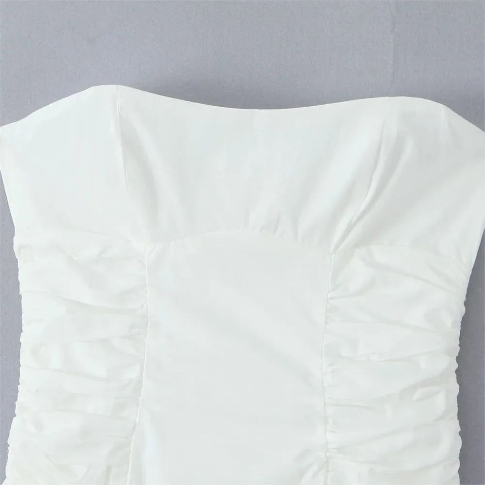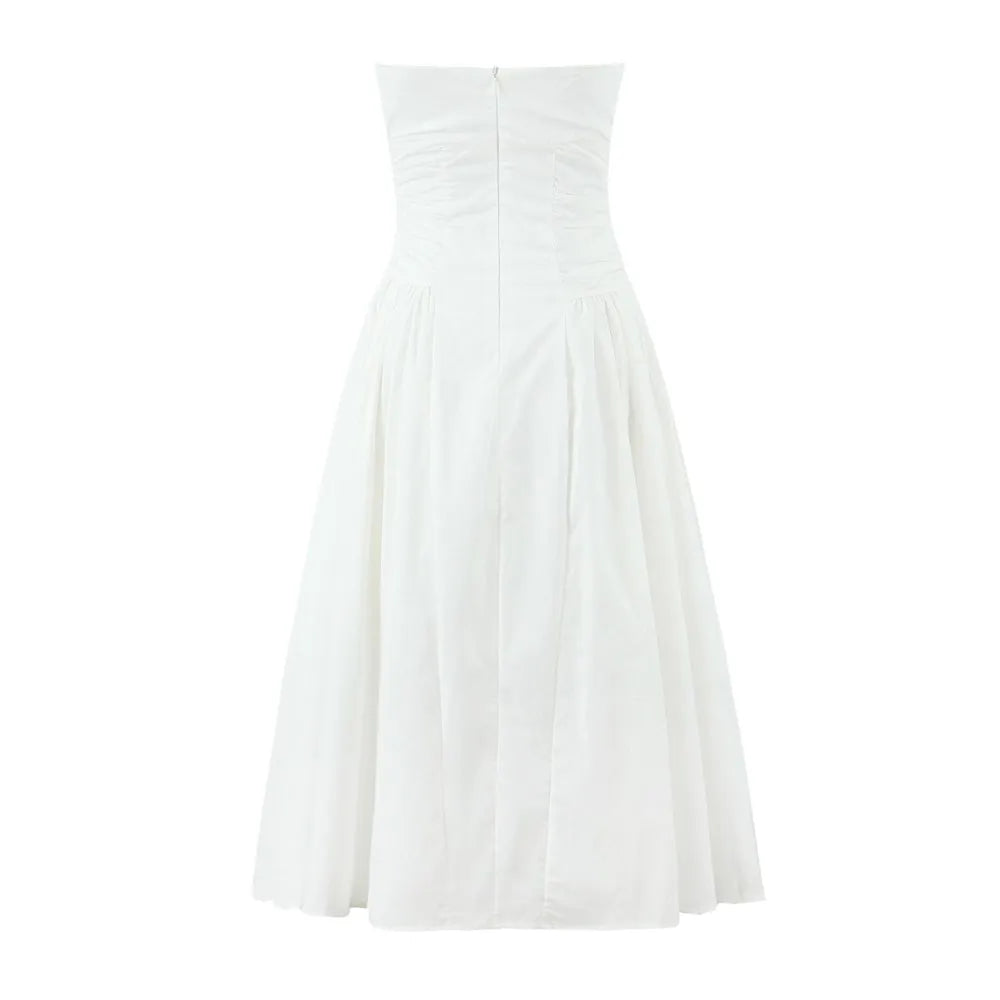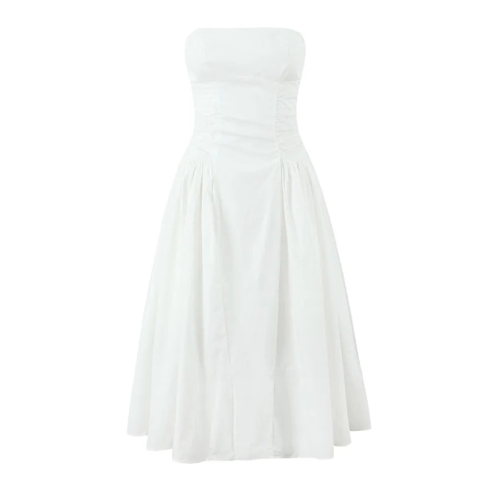 Daiiibabyyy Sexy White Slash Collar Backless Midi Long Strapless Dress Women Pleated Folded Low Waist Pleated Ruched Hem Swing Party Robe