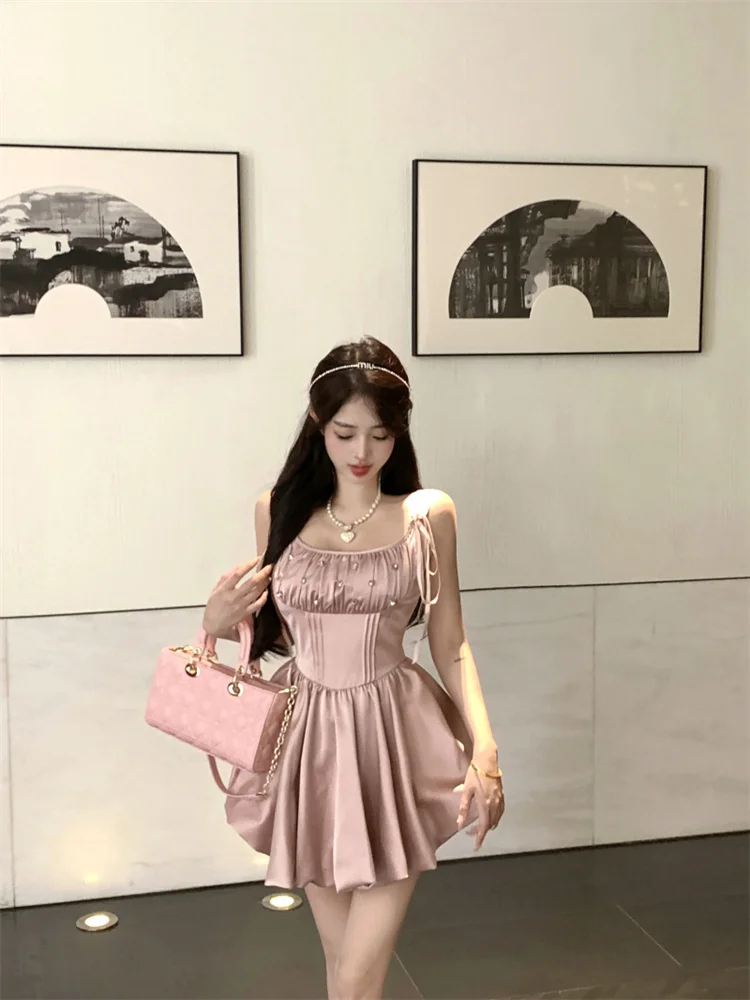DAIIIBABYYY - Sexy Women Little Pink Dress Satin Beading Corset Slim Suspender Short Mini Dress Fashion Short Elegant Birthday Party Dress