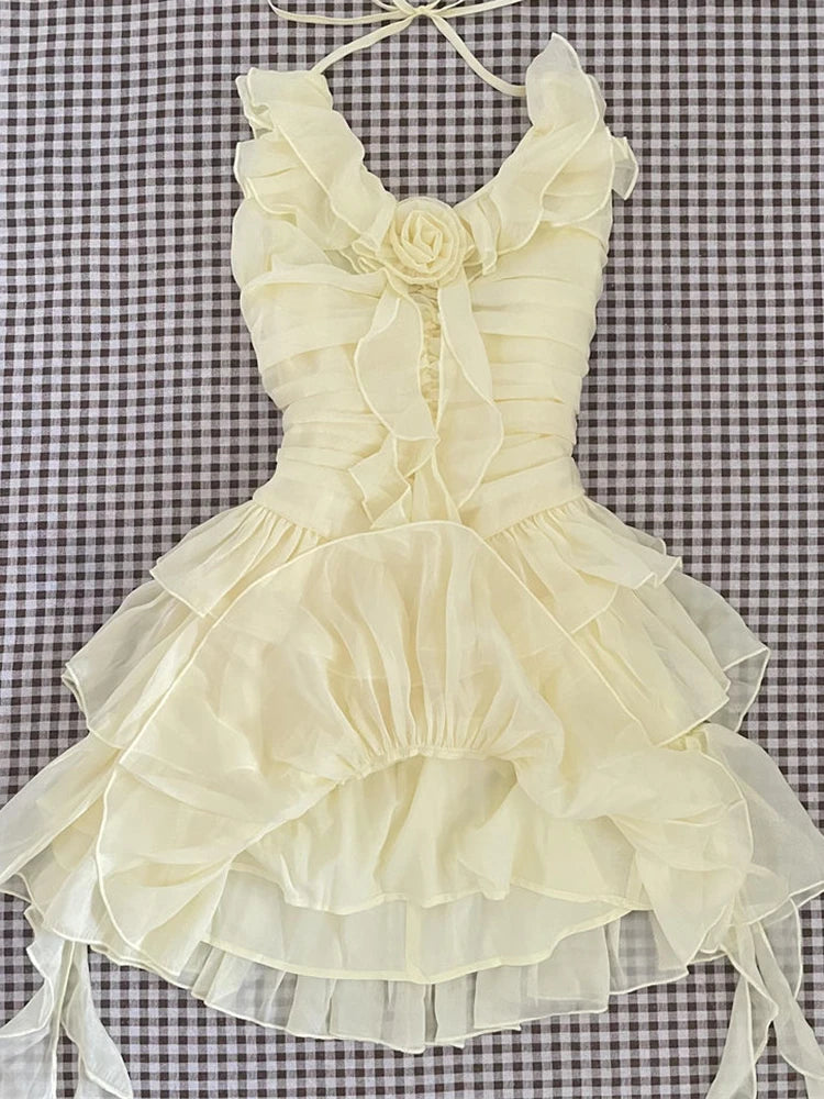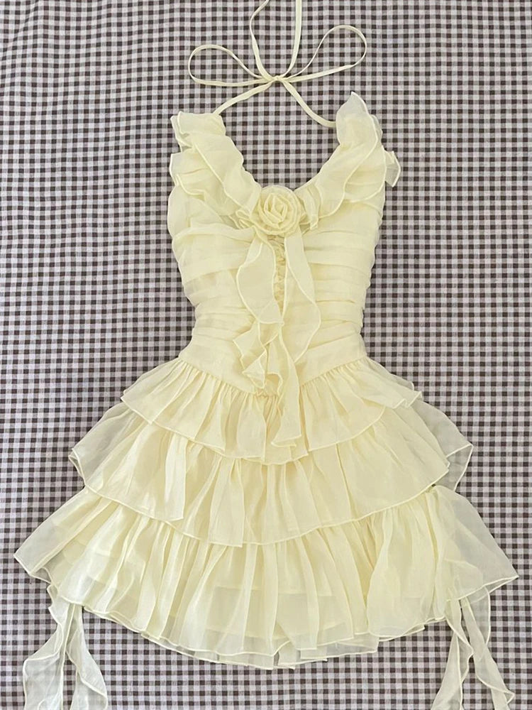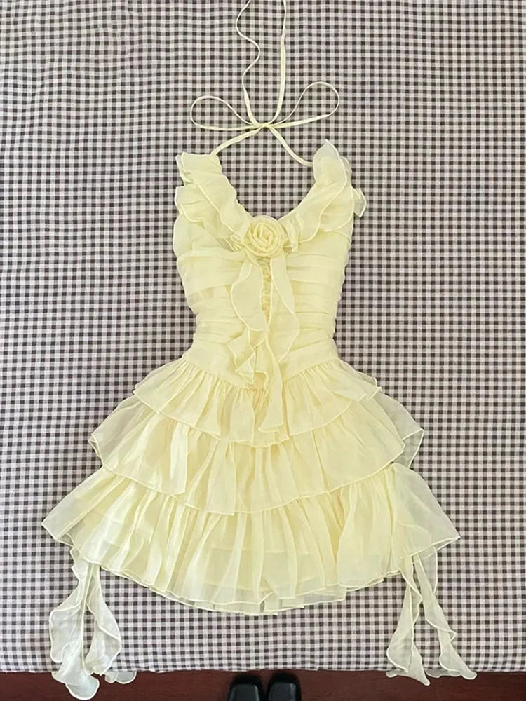 DAIIIBABYYY - Slim Sweet Ruffles Dress Women Fashion 3D Floral Casual Elegant Mini Dress Summer Sexy Sleeveless Lady Yellow Cake Vestidos