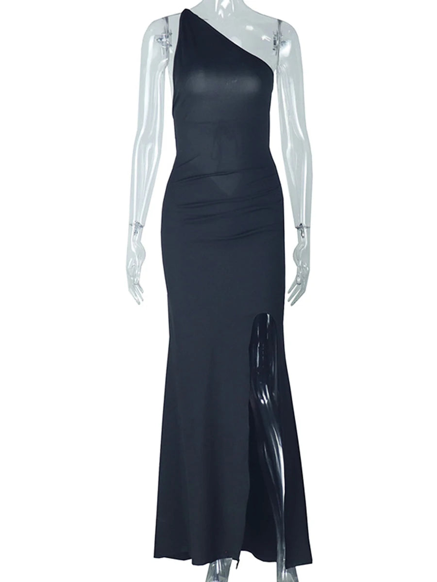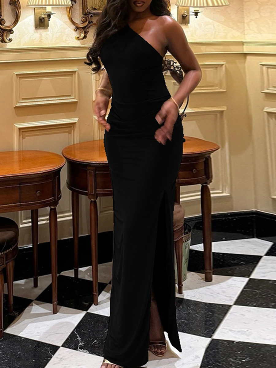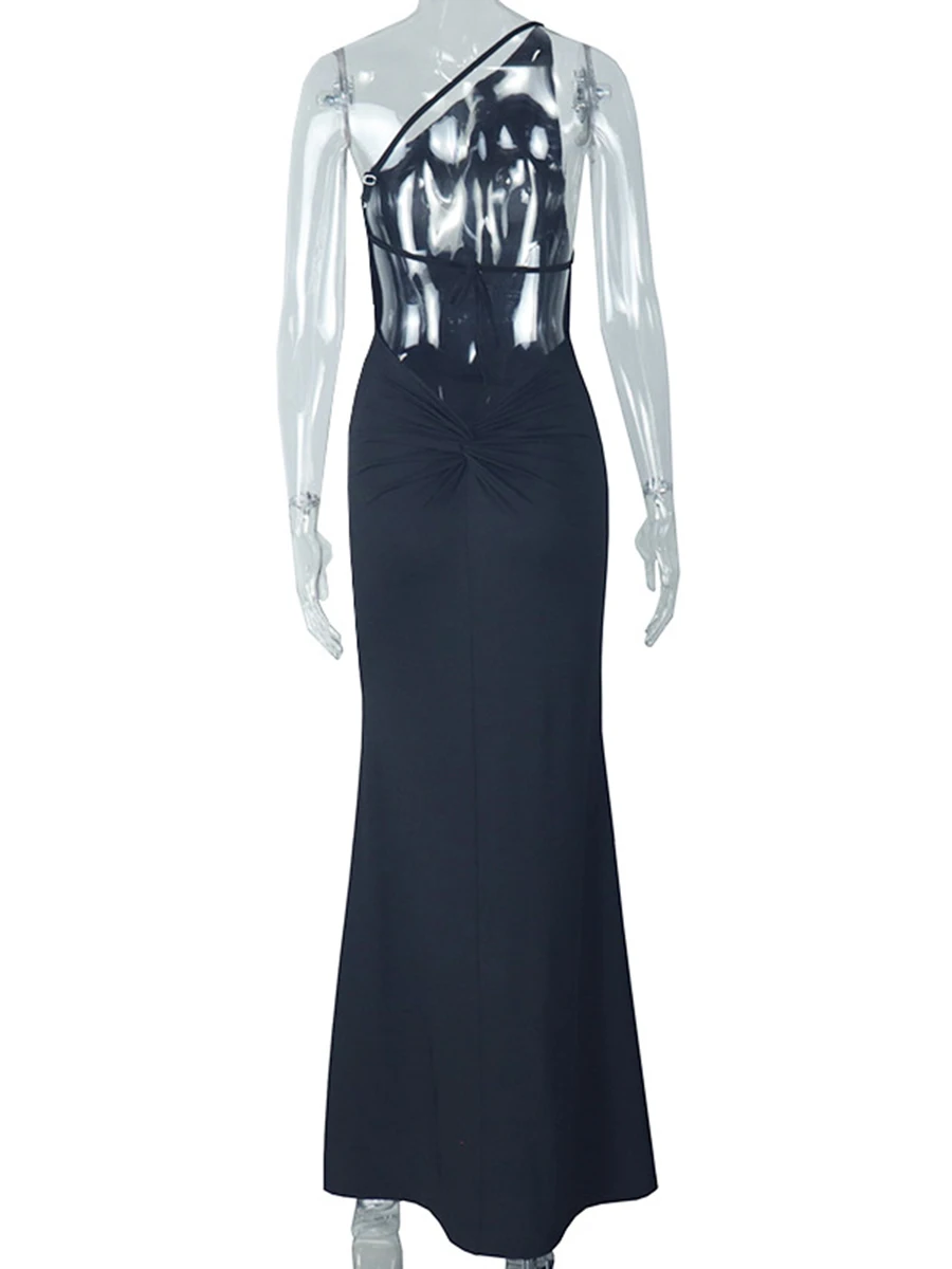DAIIIBABYYY - Solid Slimming Backless Evening Dresses for Women Diagonal Collar One Shoulder Sleeve High Waist Elegant Dress Female New