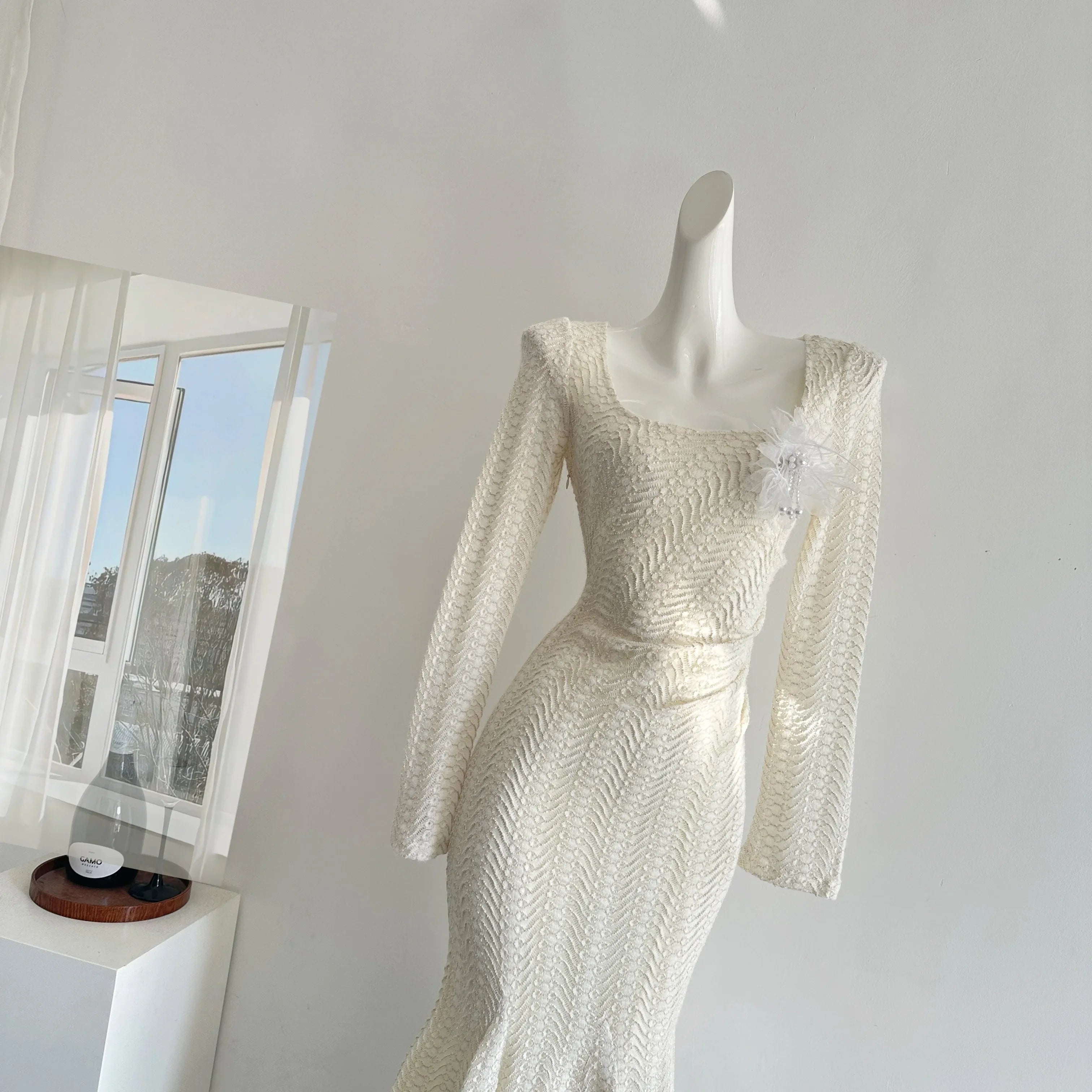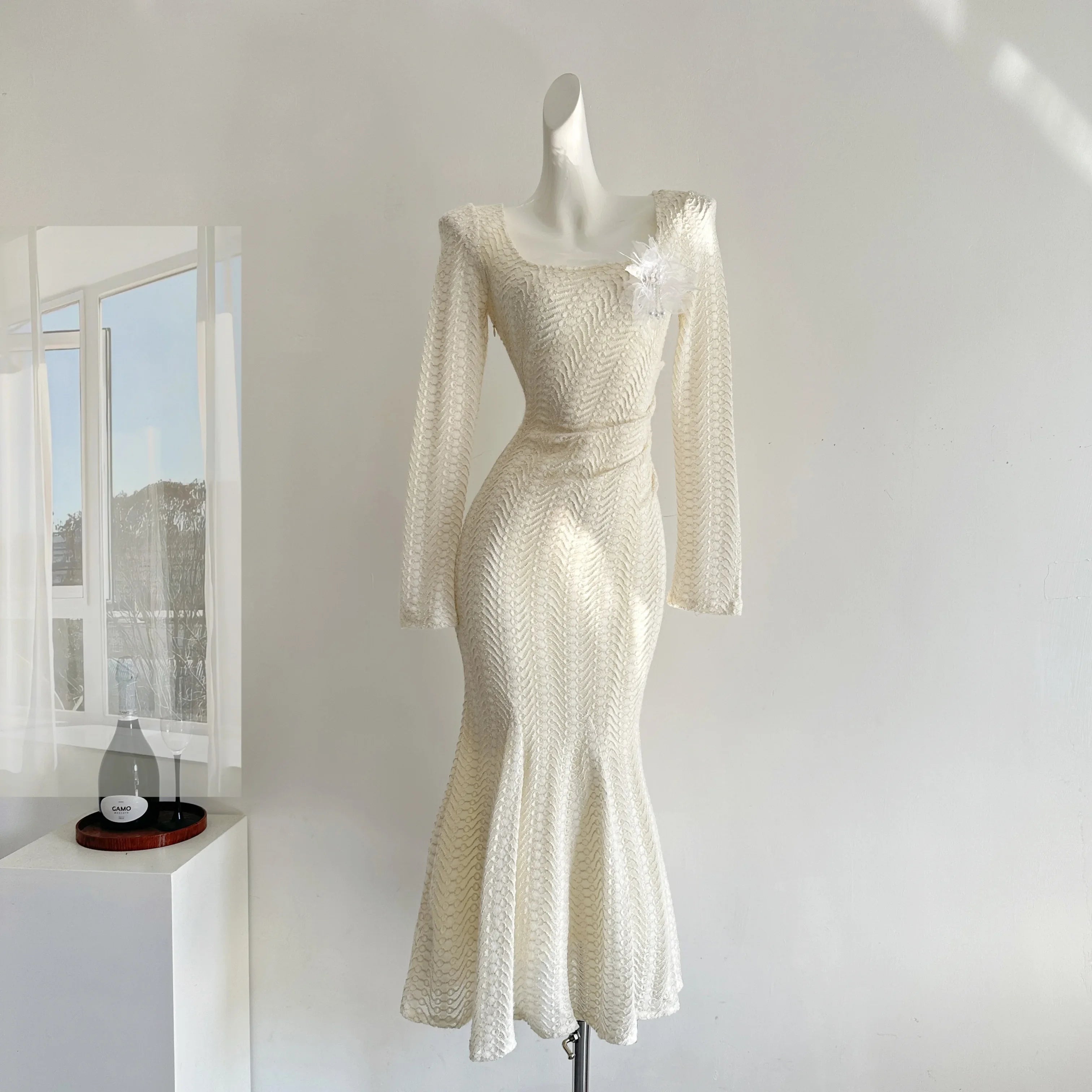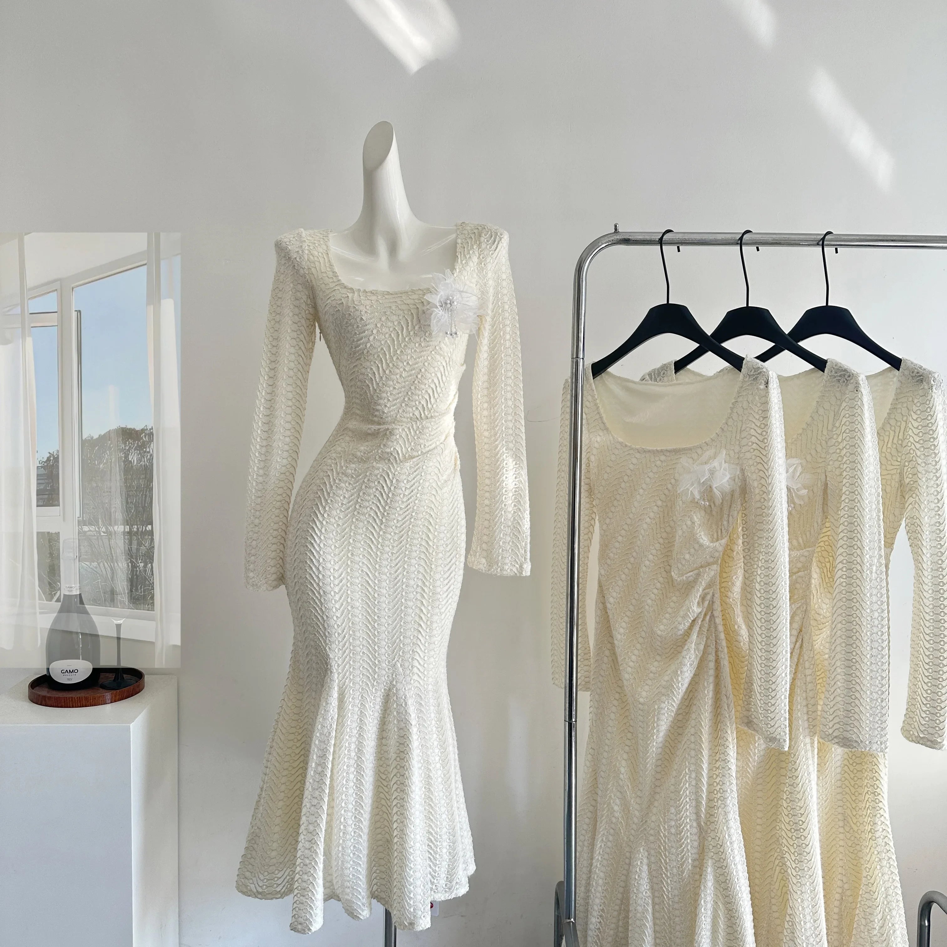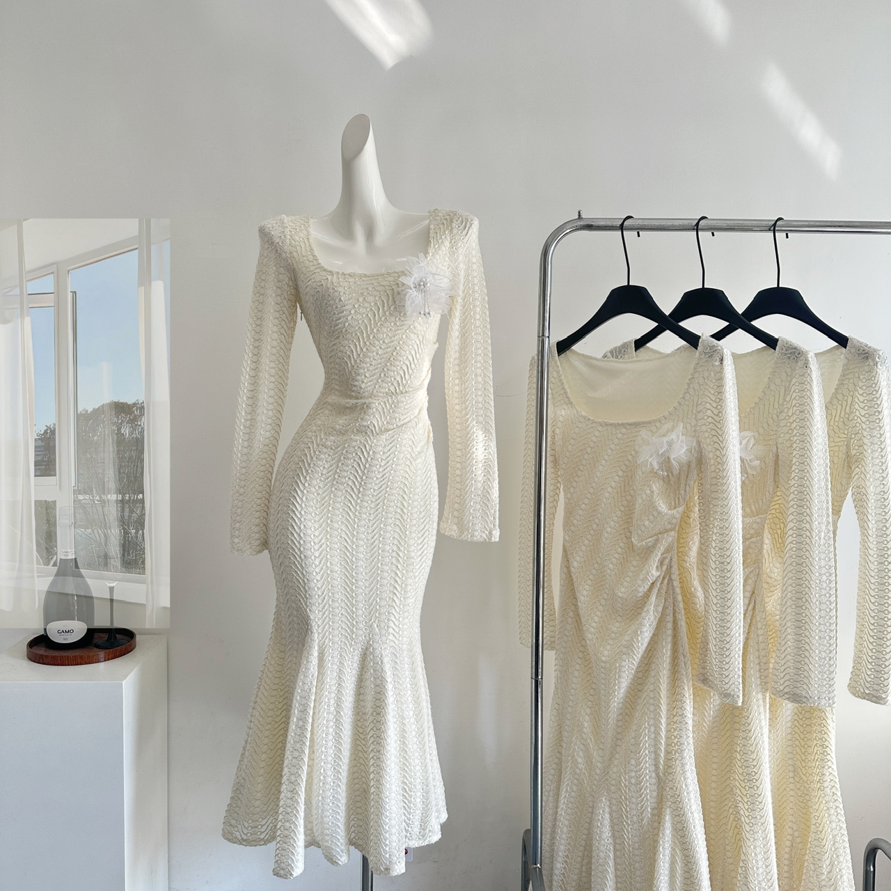 DAIIIBABYYY - Spring and Autumn Thickened Stretch Square Neck Long-sleeved Lace Long Dresses Women's Solid Color 3D Flower Slim Fishtail Dress