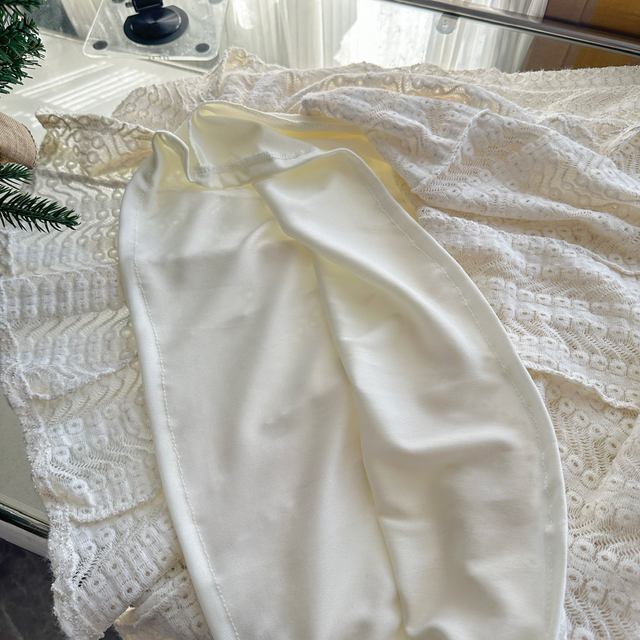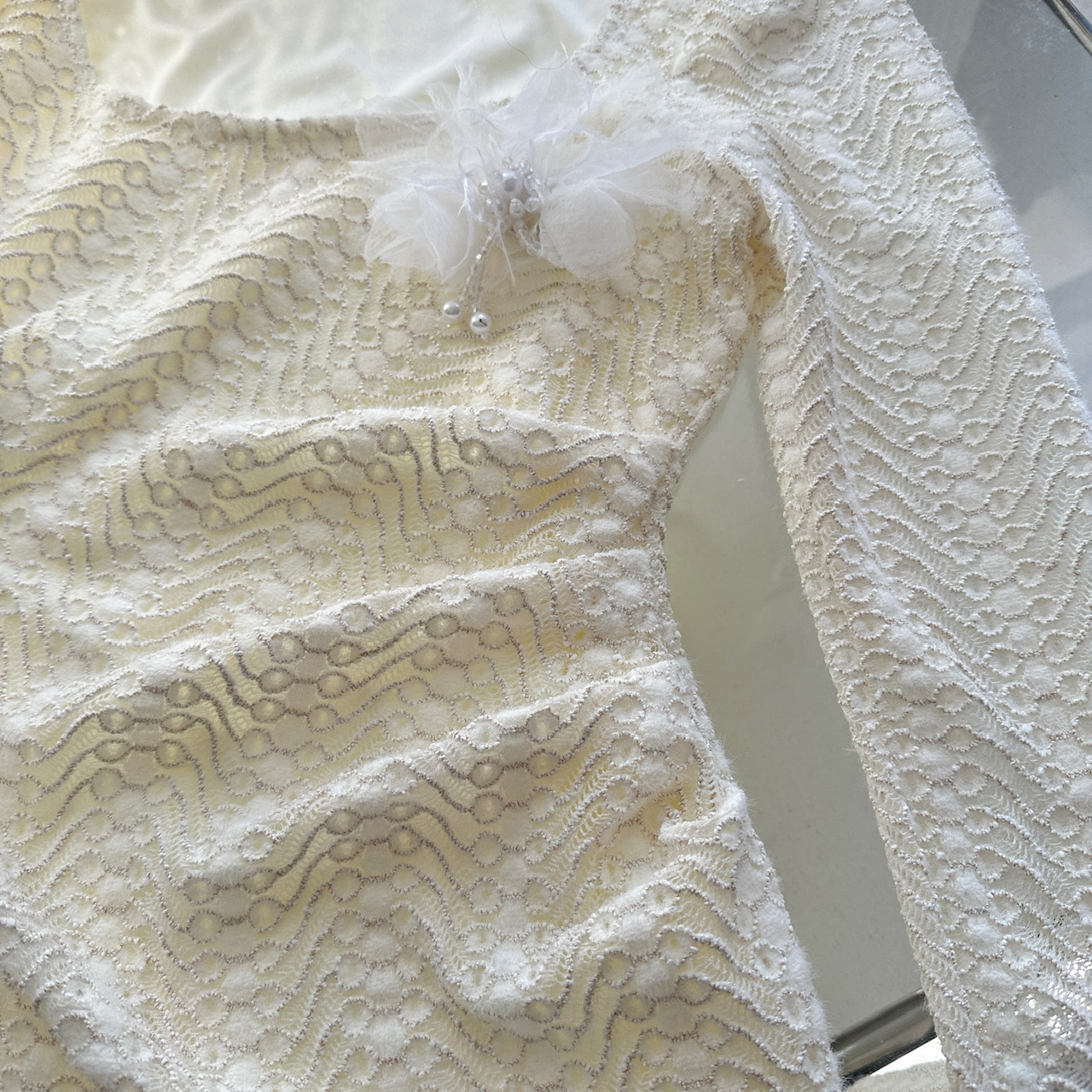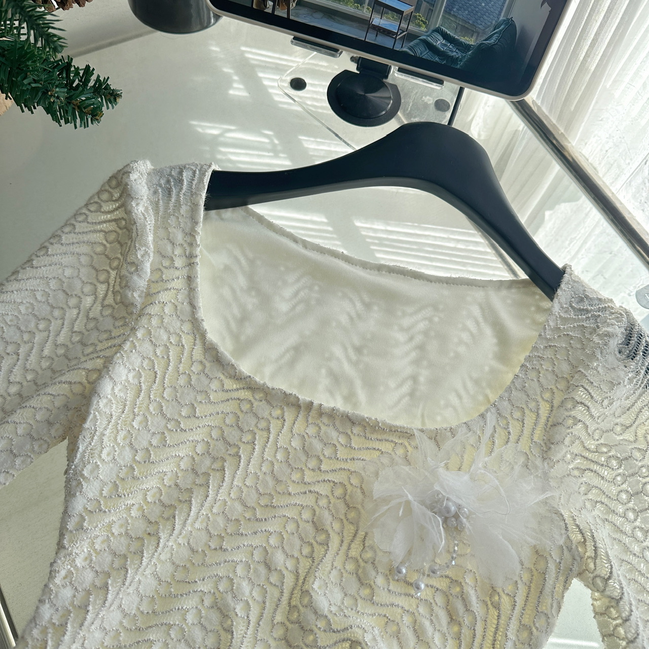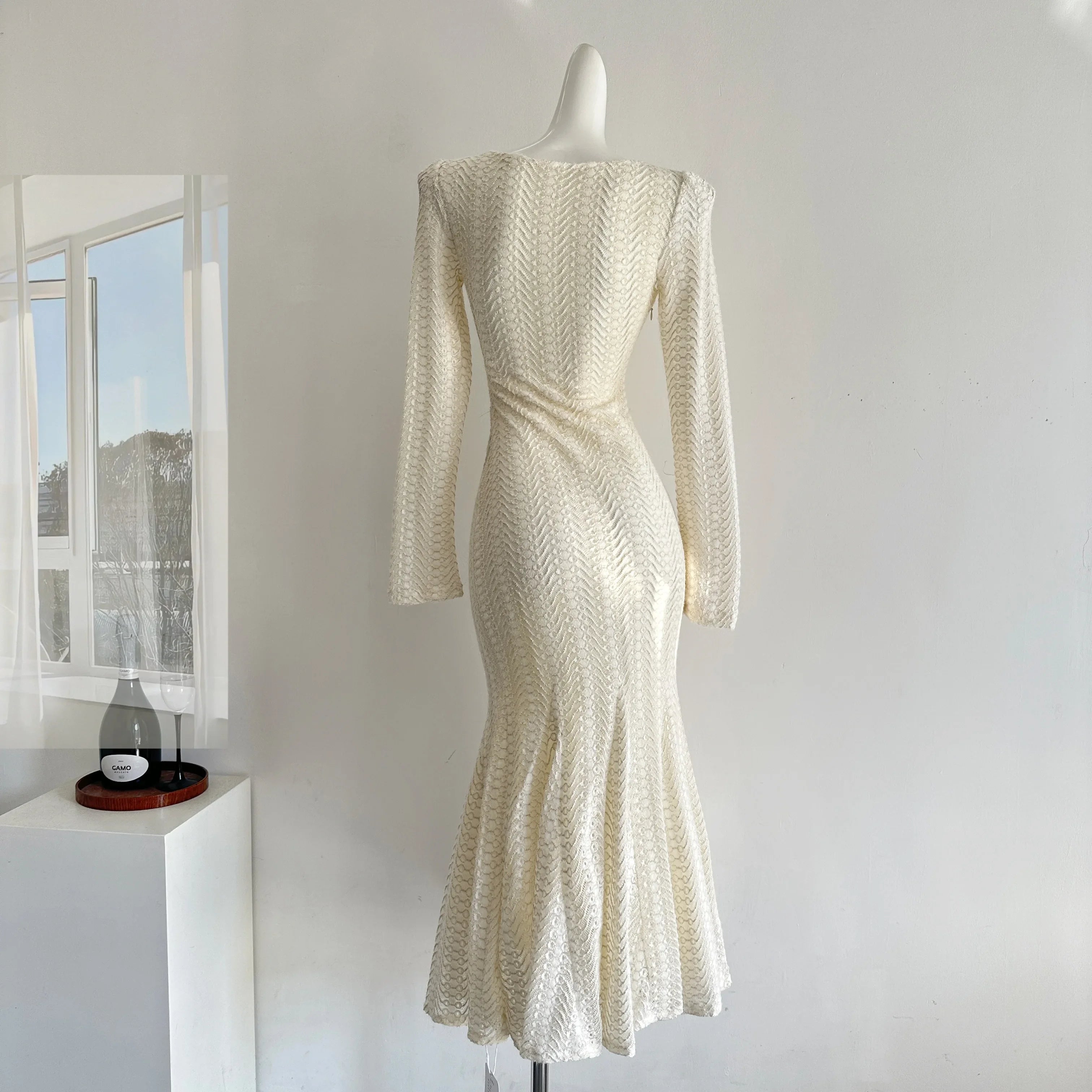 DAIIIBABYYY - Spring and Autumn Thickened Stretch Square Neck Long-sleeved Lace Long Dresses Women's Solid Color 3D Flower Slim Fishtail Dress