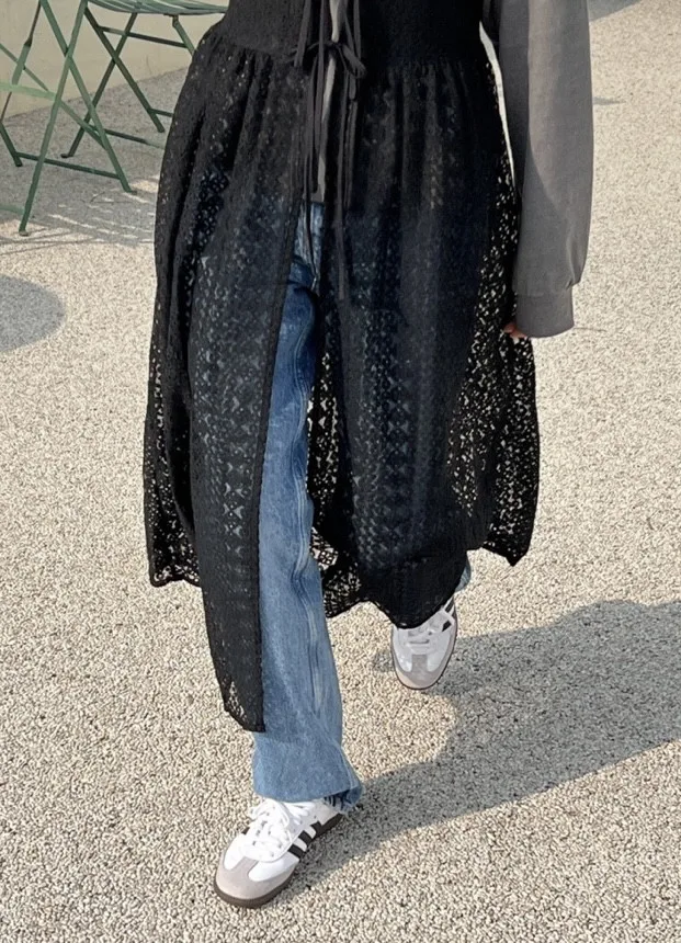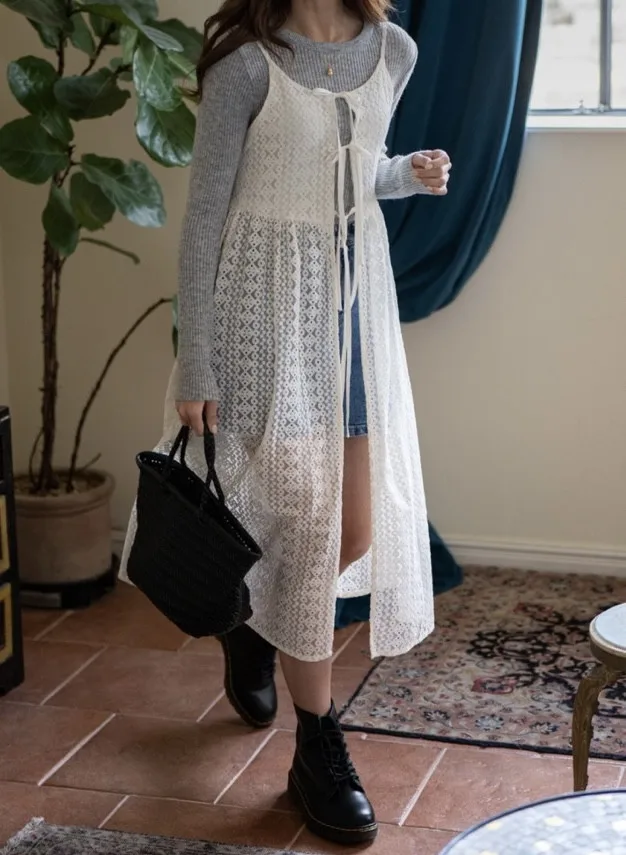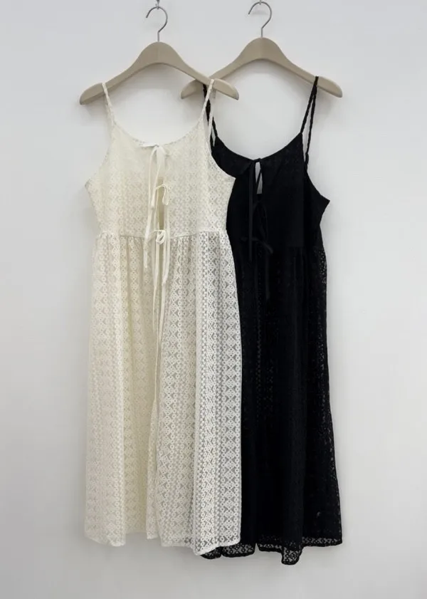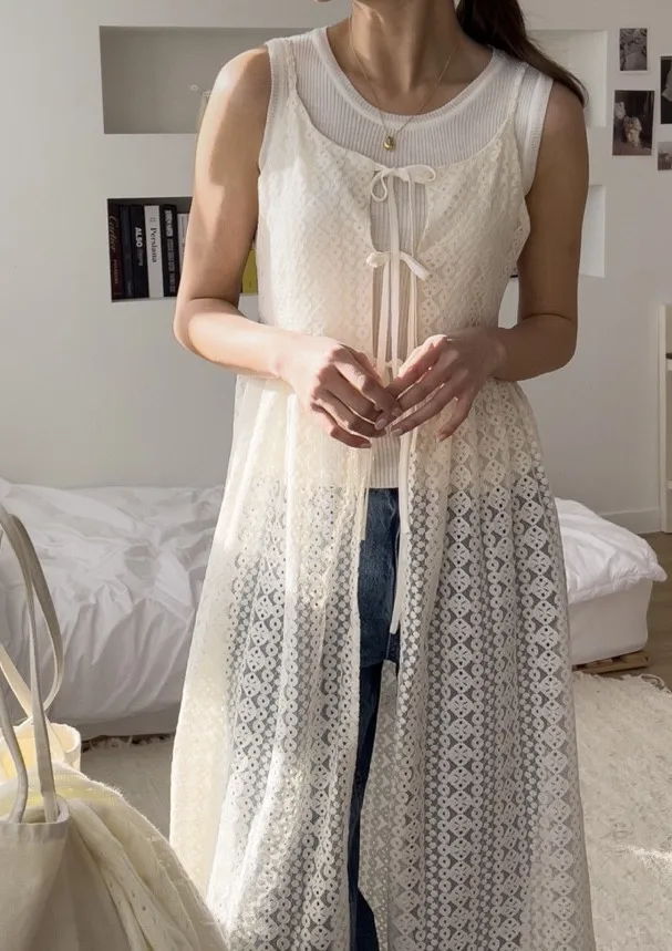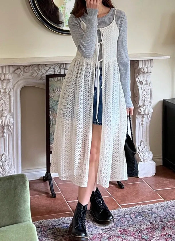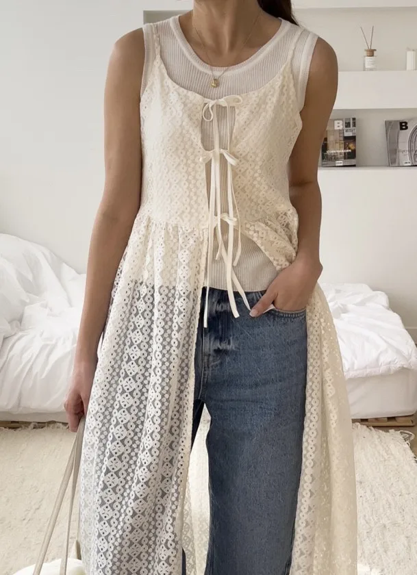 DAIIIBABYYY - Spring and Summer Korean Style See-through Lace Suspender Dress Women's One-shoulder Sleeveless Lace-up Long Camisole Dresses