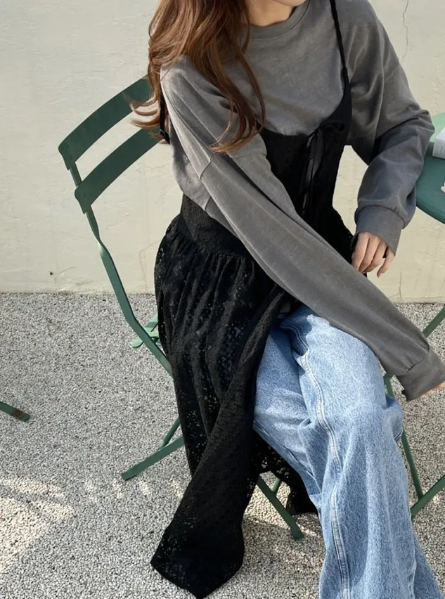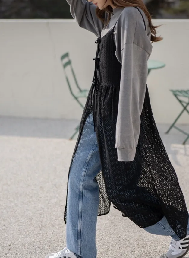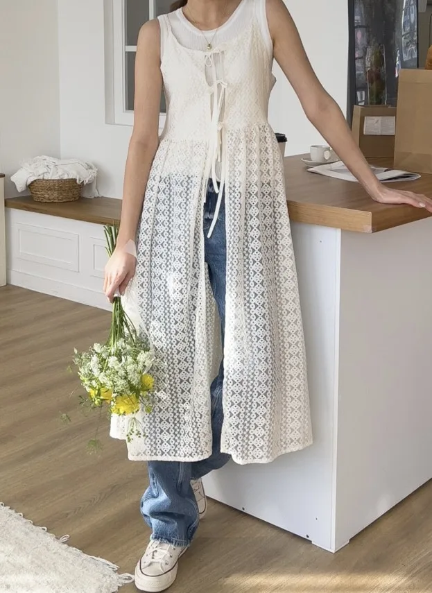 DAIIIBABYYY  -  Spring and Summer Korean Style See-through Lace Suspender Dress Women's One-shoulder Sleeveless Lace-up Long Camisole Dresses