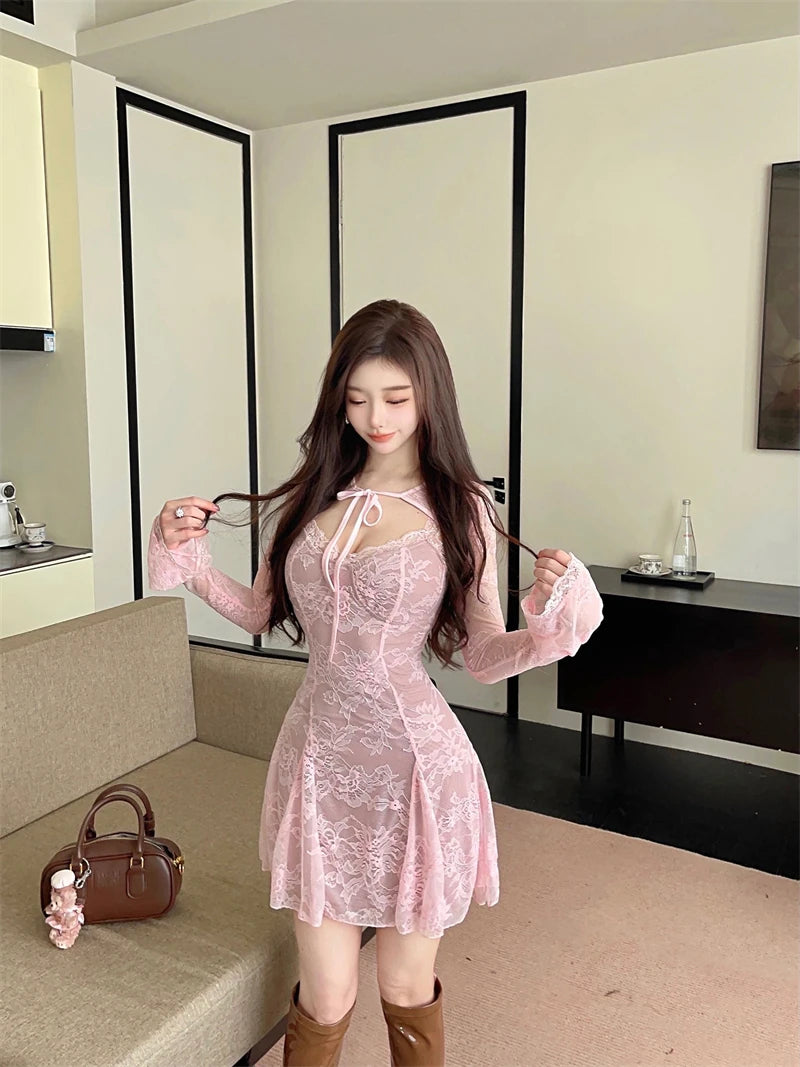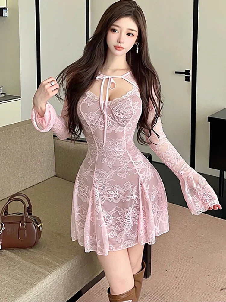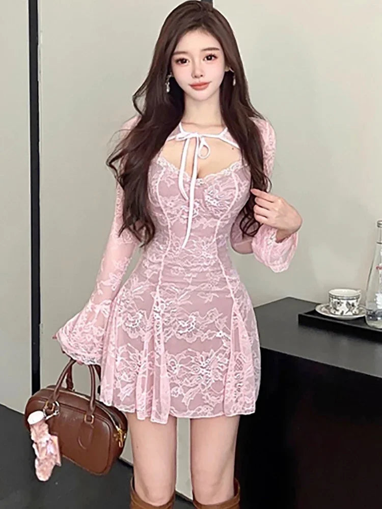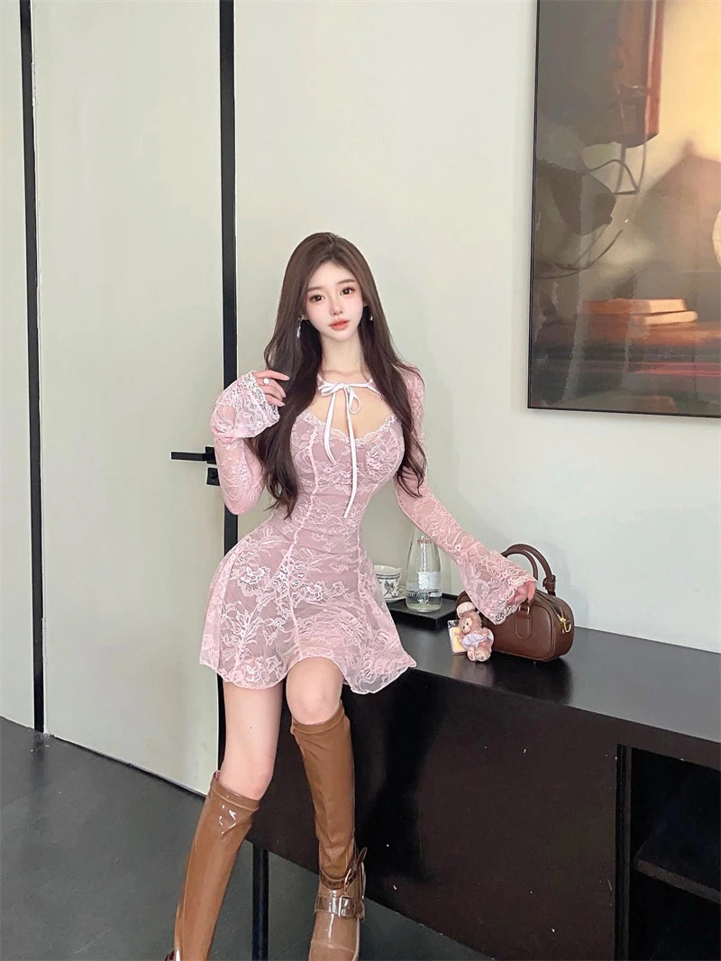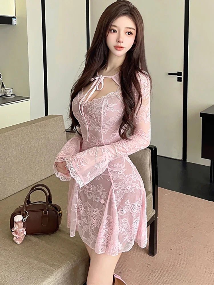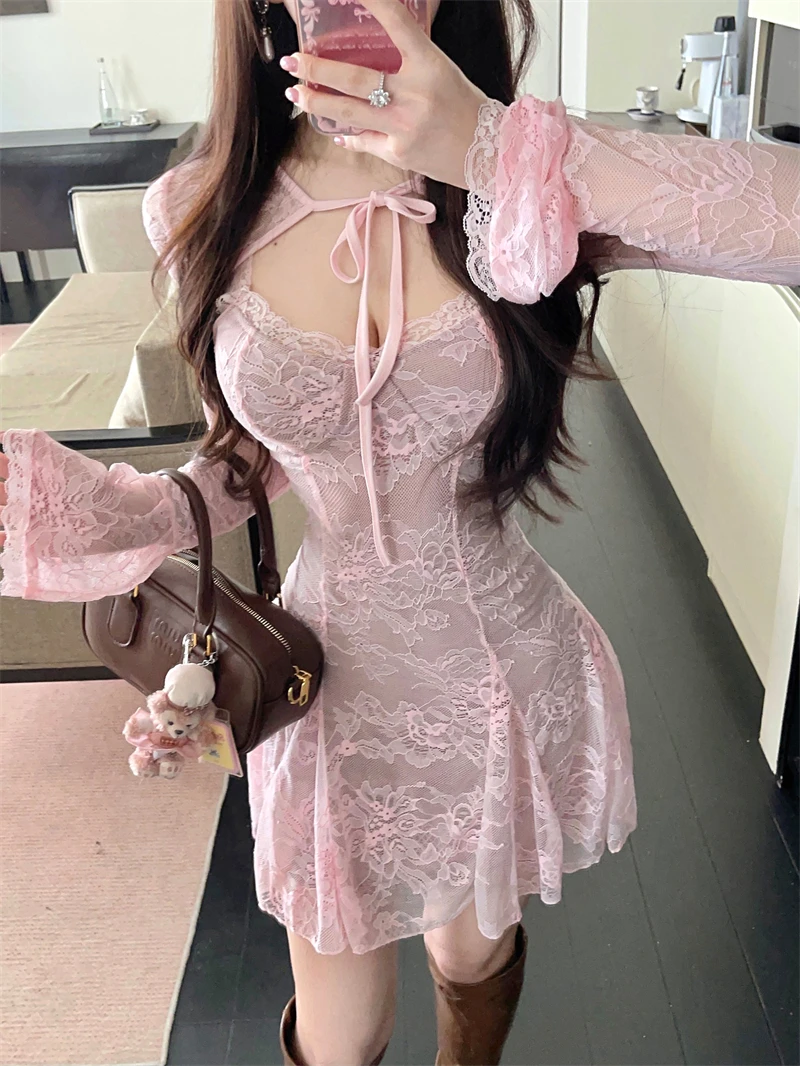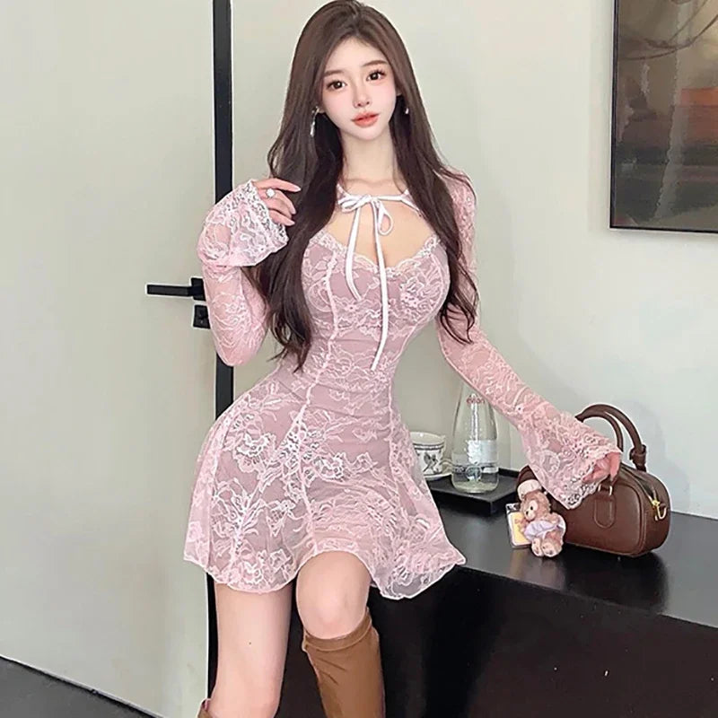 DAIIIBABYYY - Spring Autumn Pink Lace Chic Bow Square Collar Sexy Mini Dress Women Long Sleeve Bodycon Ruffled Dress 2025 Korean Fashion Dress