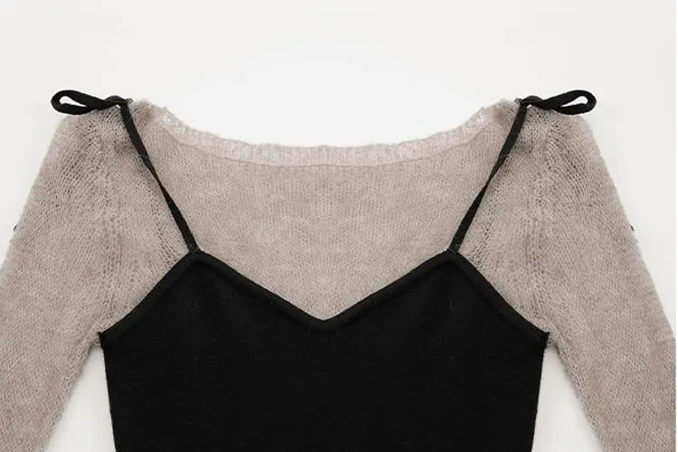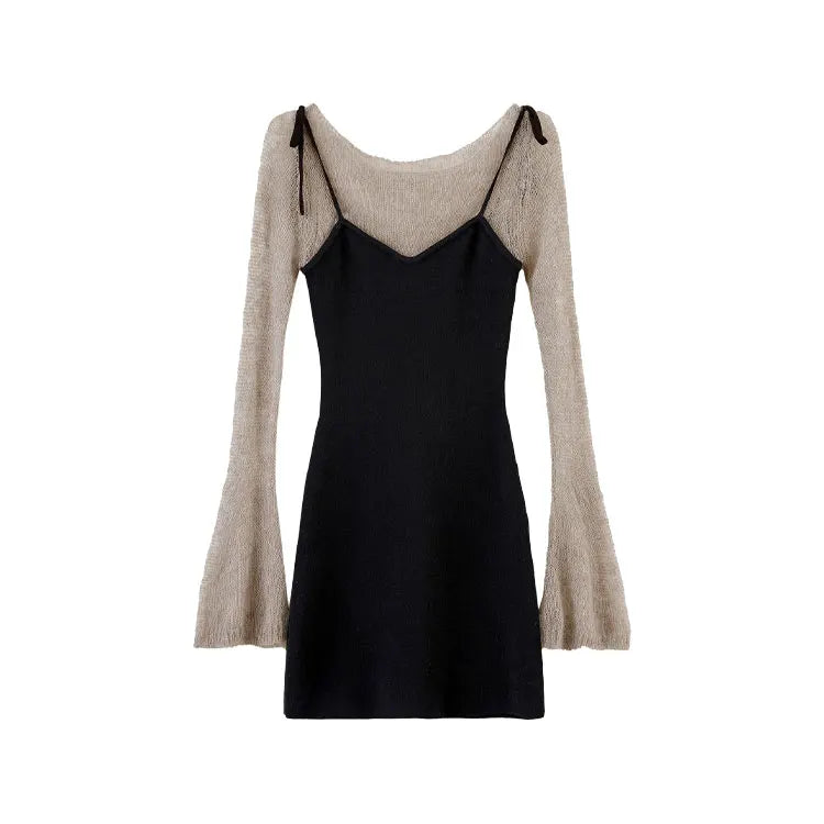 DAIIIBABYYY - Spring Autumn V-neck Sleeveless Short Temperament Camisole Dress + Women Thin Hollow Flare Sleeve Knitted Pullover Two-piece Set