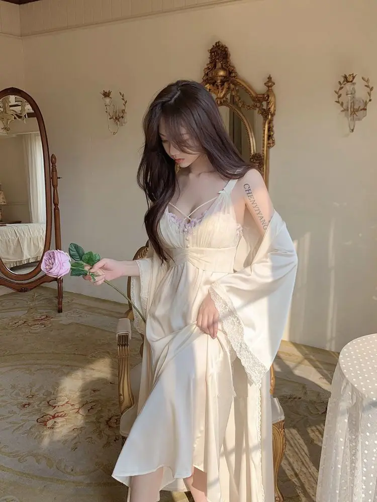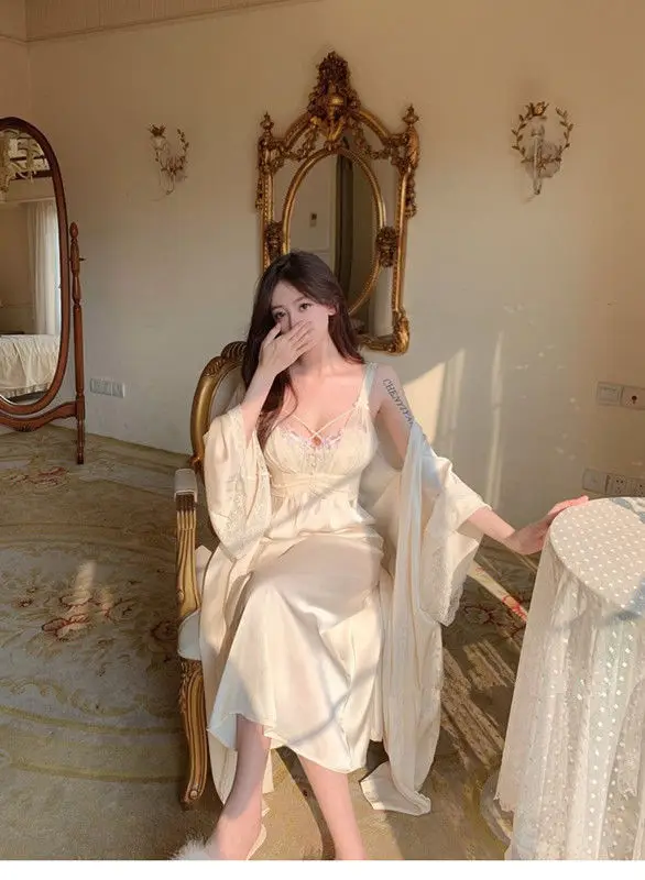 Daiiibabyyy Spring Silk Sexy Strap Dress Women Casual Korean Elegant Long Split Dress Court Retro Party Lace Dress Women Fashion V Neck