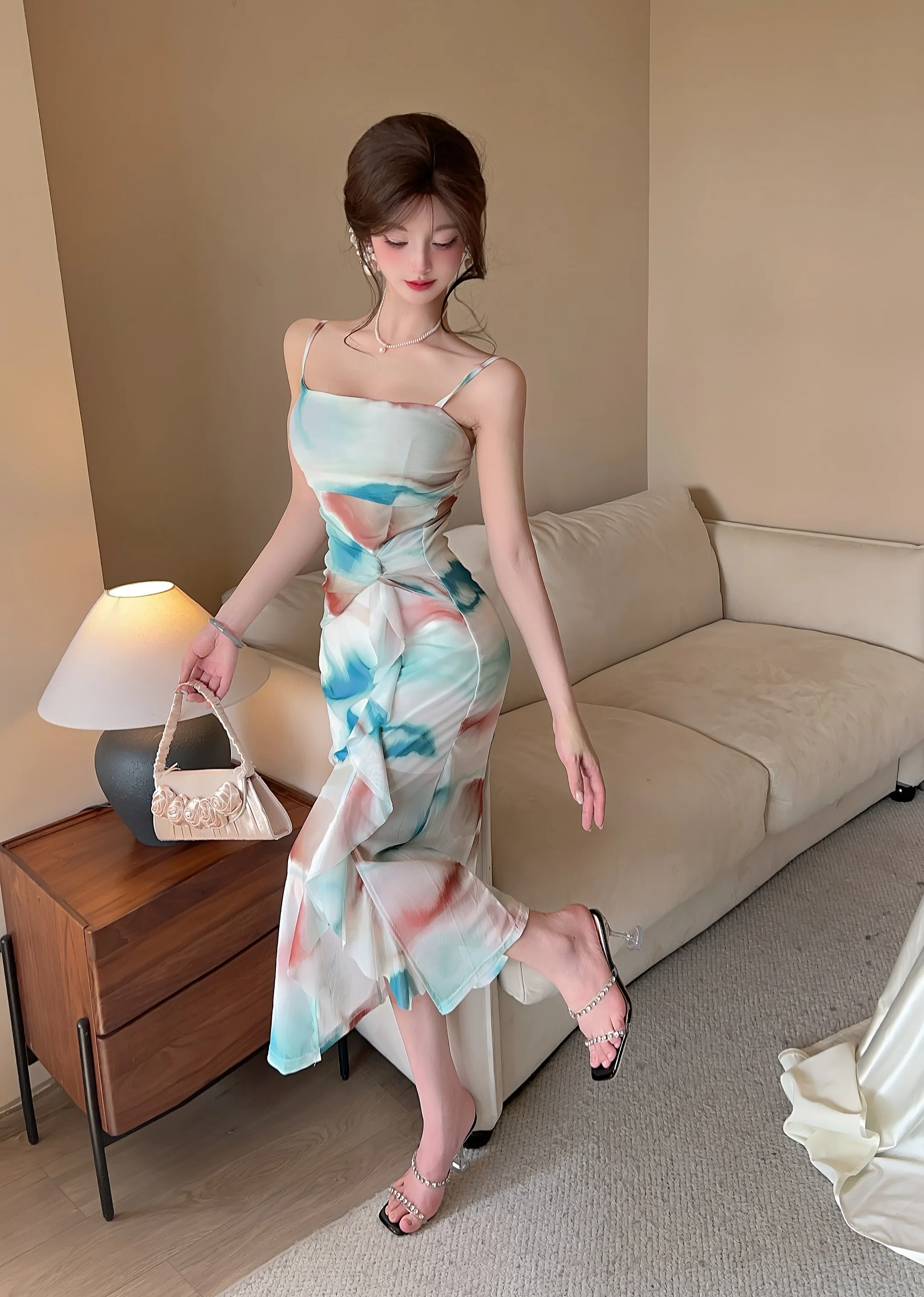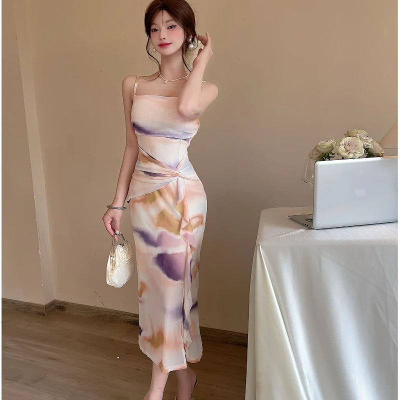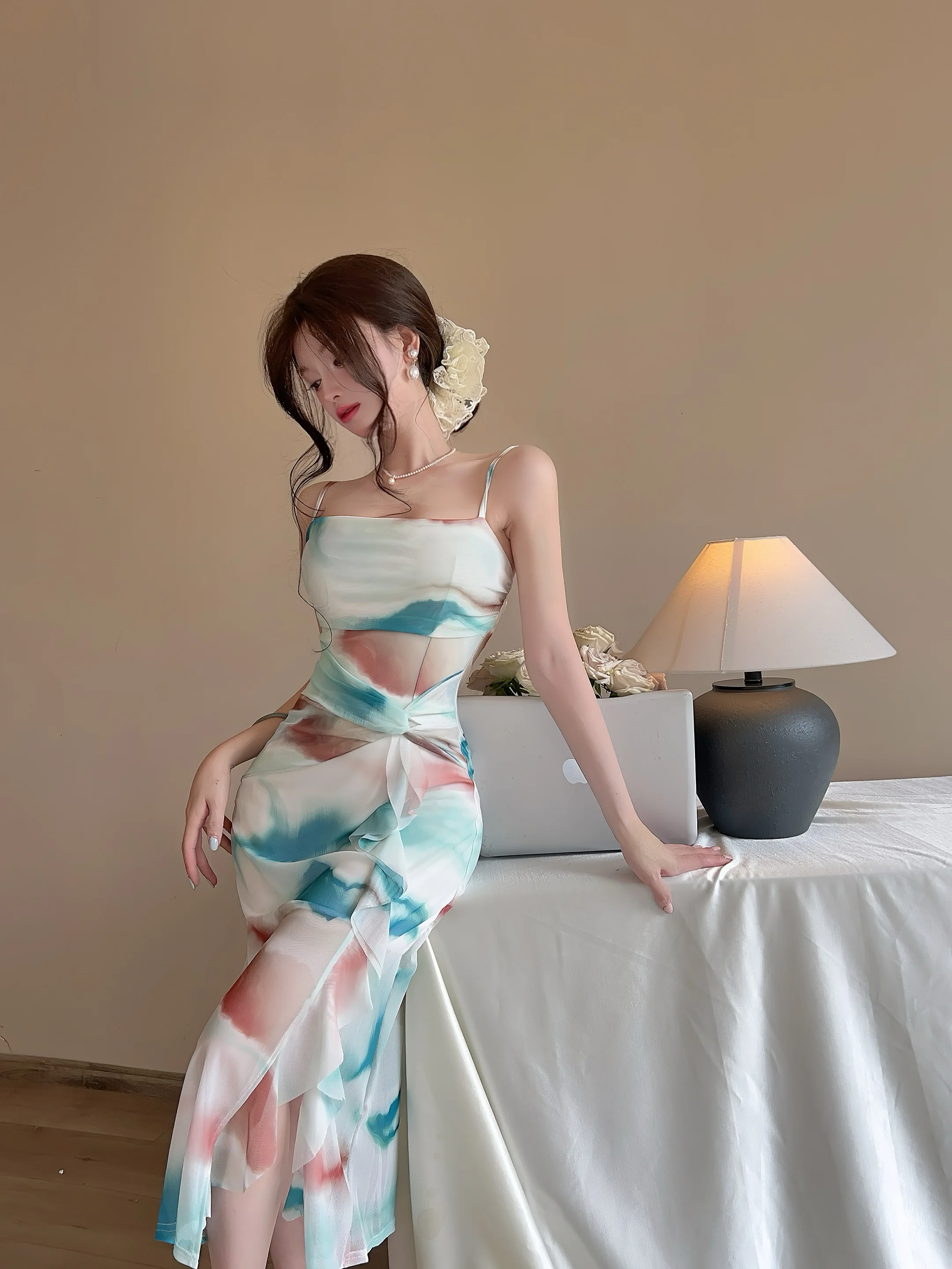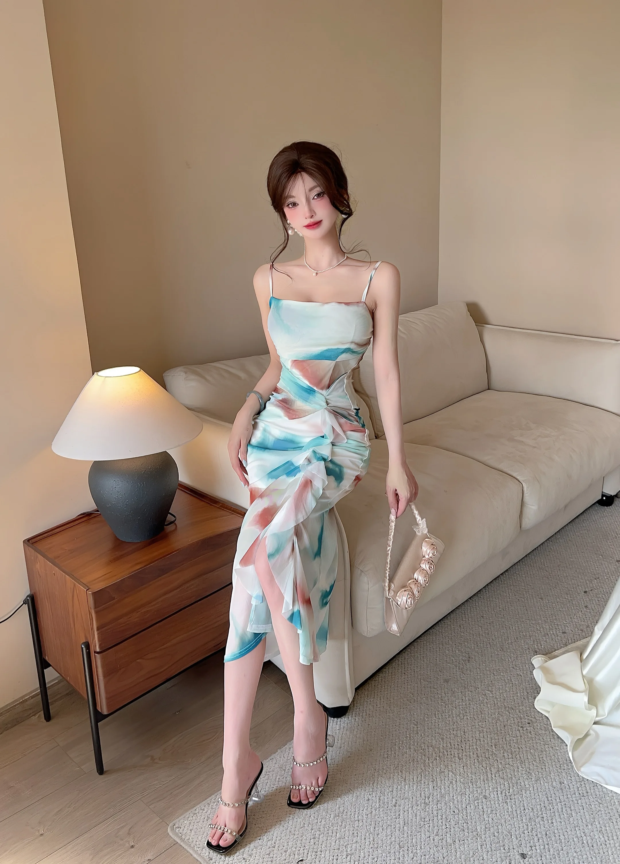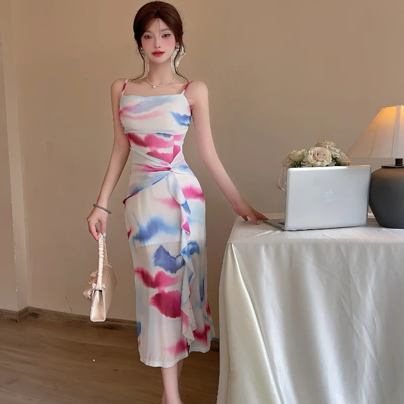 DAIIIBABYYY - Summer Boho Print Mesh Chic Ruffled Long Dress Women Elegant Bodycon Sling Sexy Dress 2025 Korean Fashion Luxury One Piece Dress
