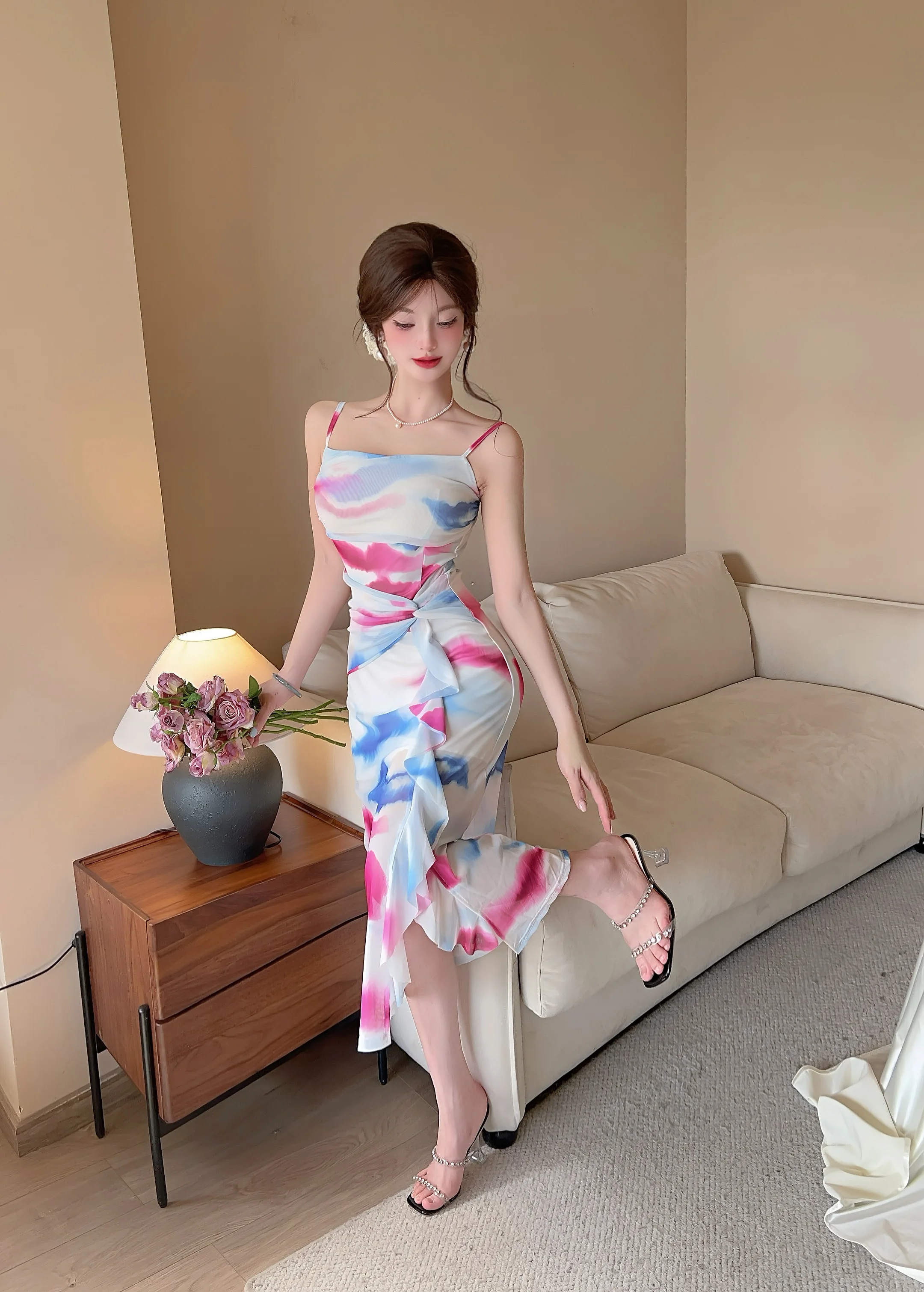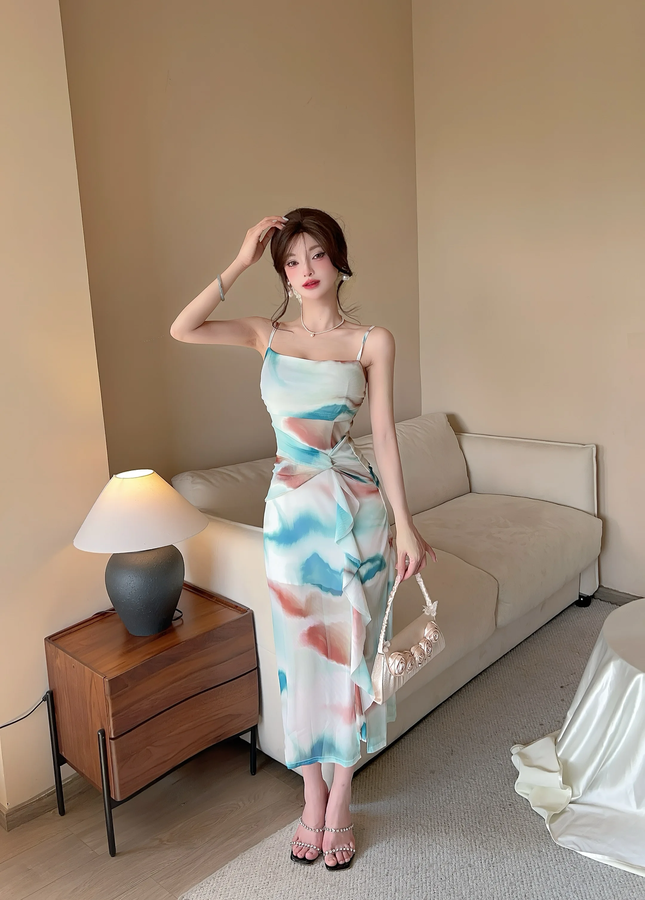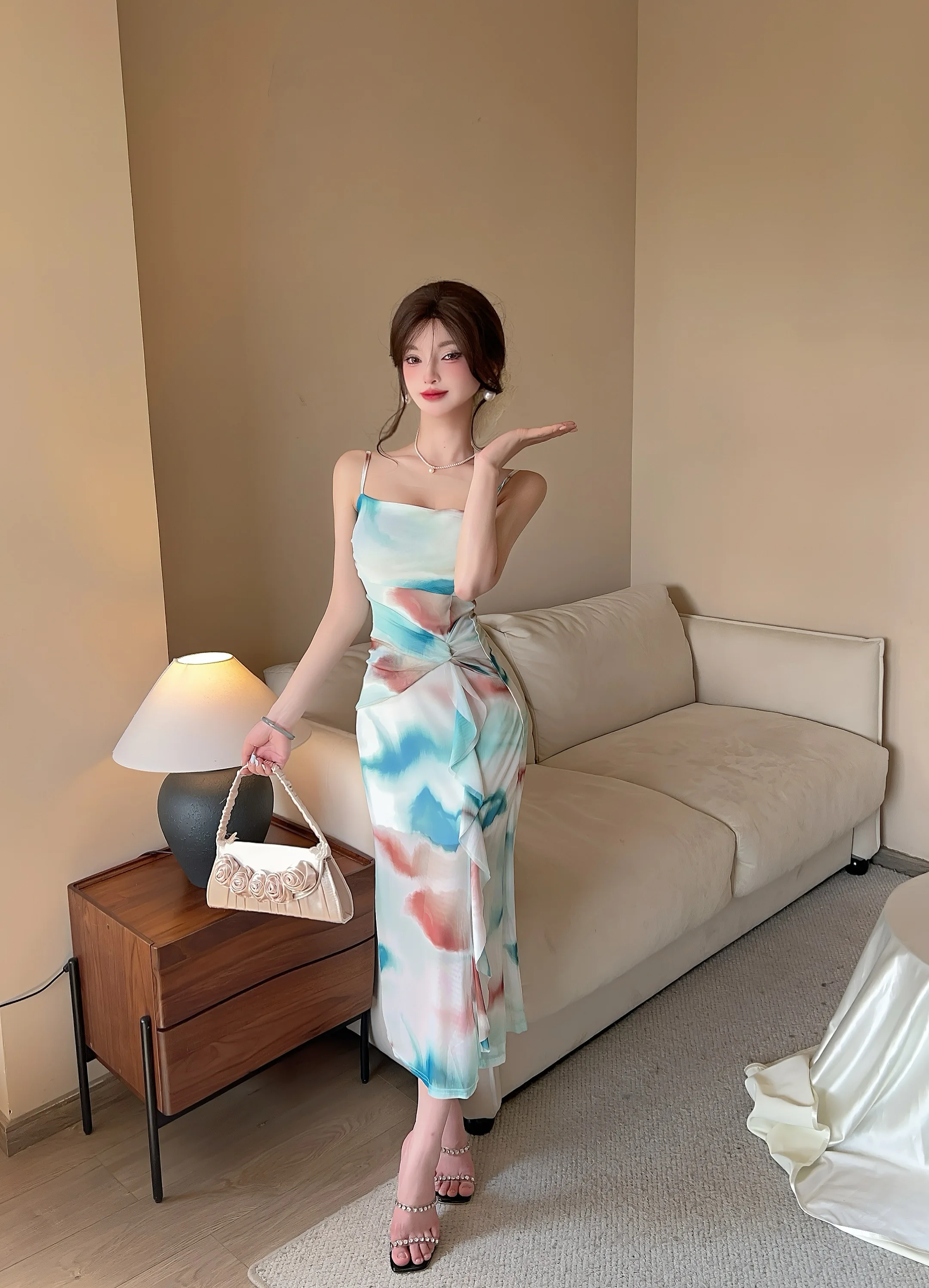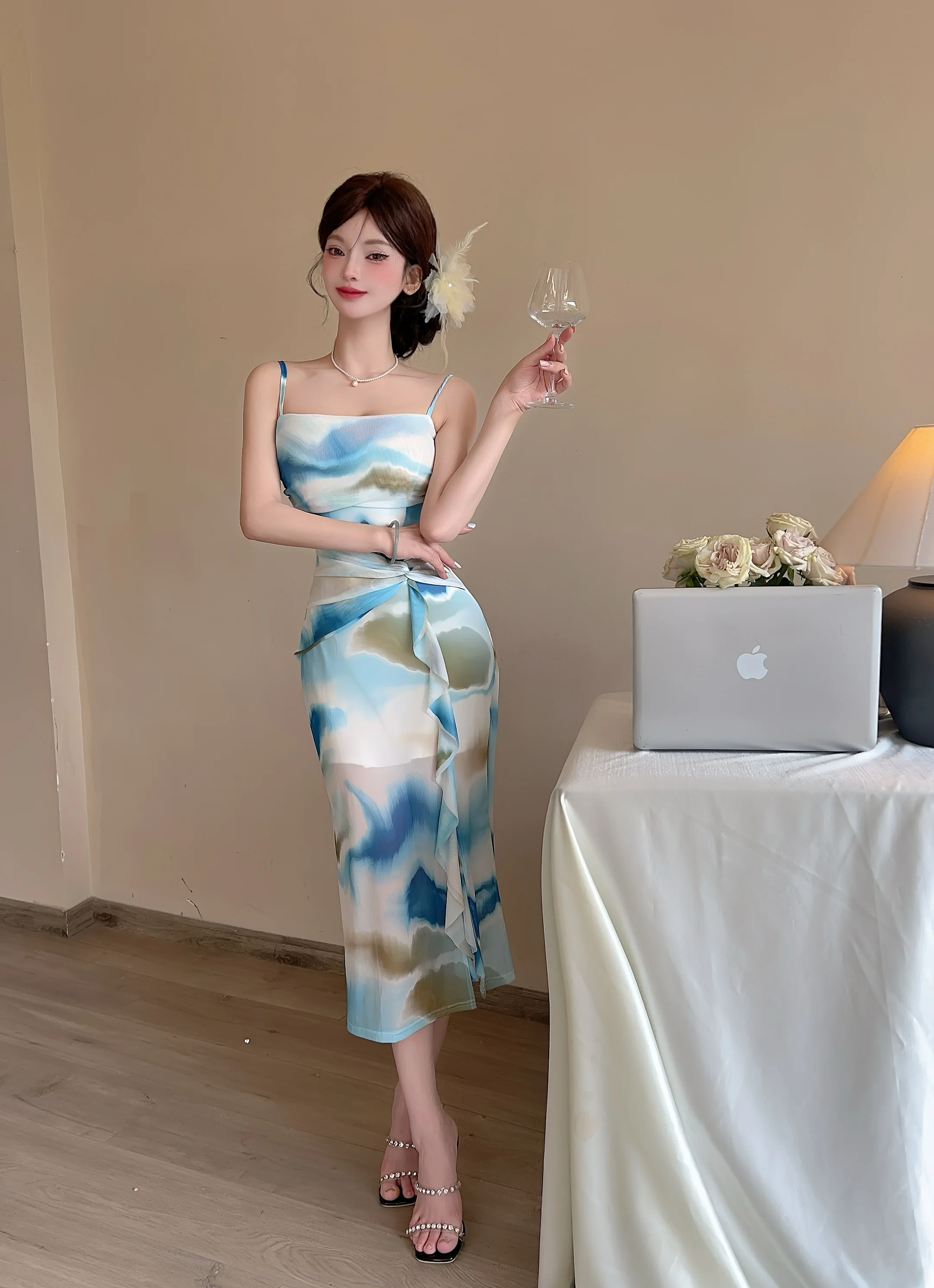 DAIIIBABYYY - Summer Boho Print Mesh Chic Ruffled Long Dress Women Elegant Bodycon Sling Sexy Dress 2025 Korean Fashion Luxury One Piece Dress