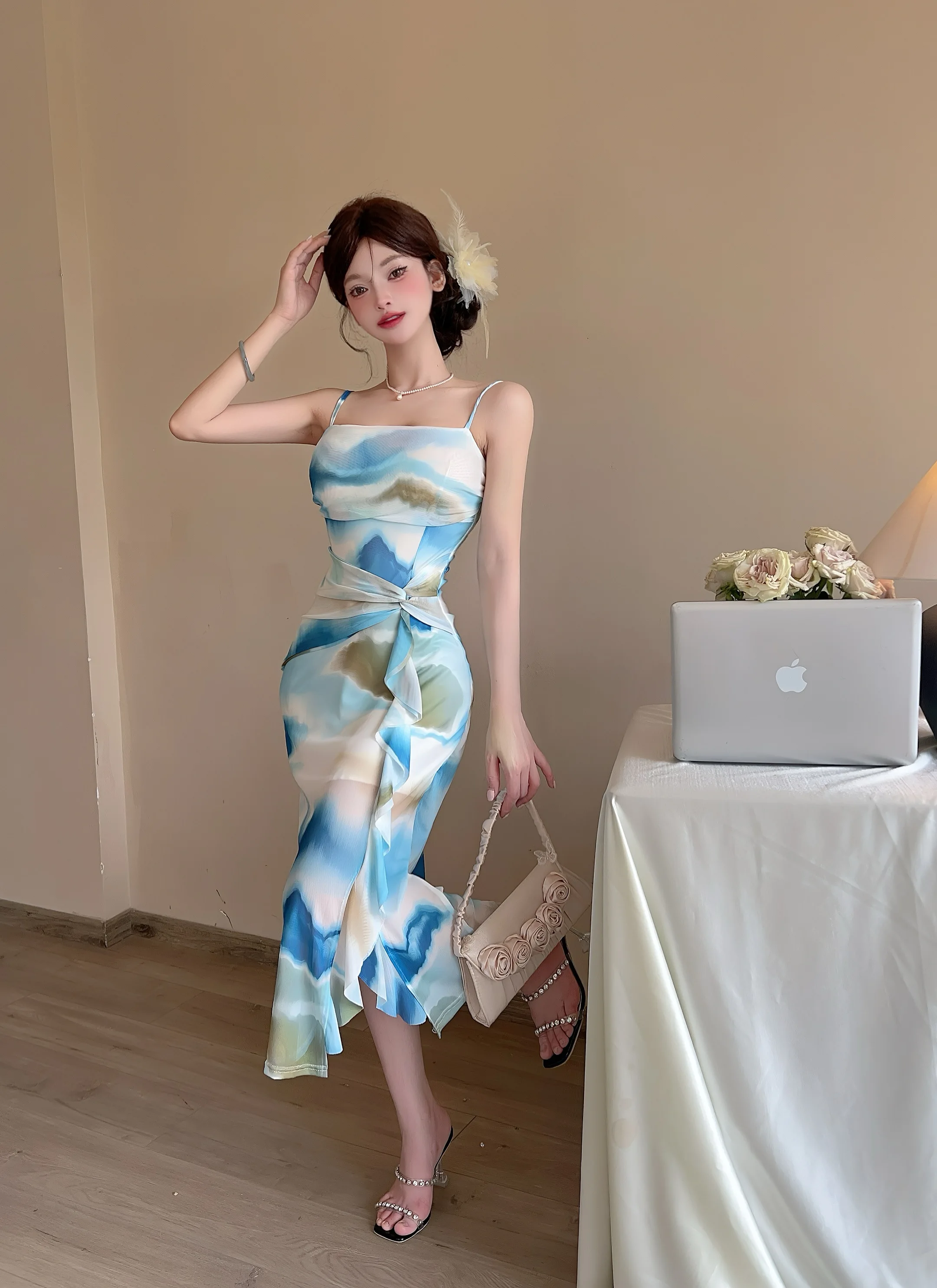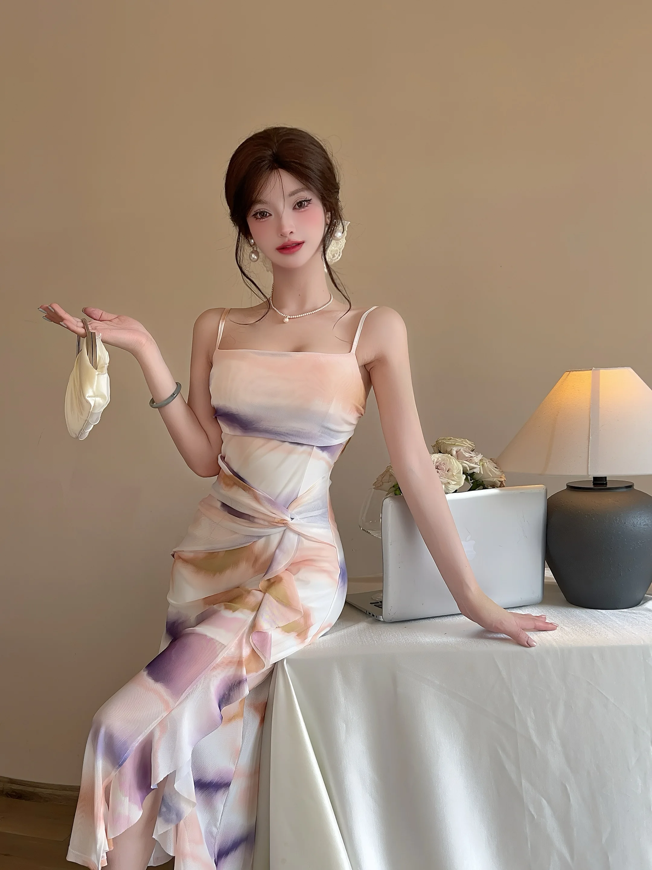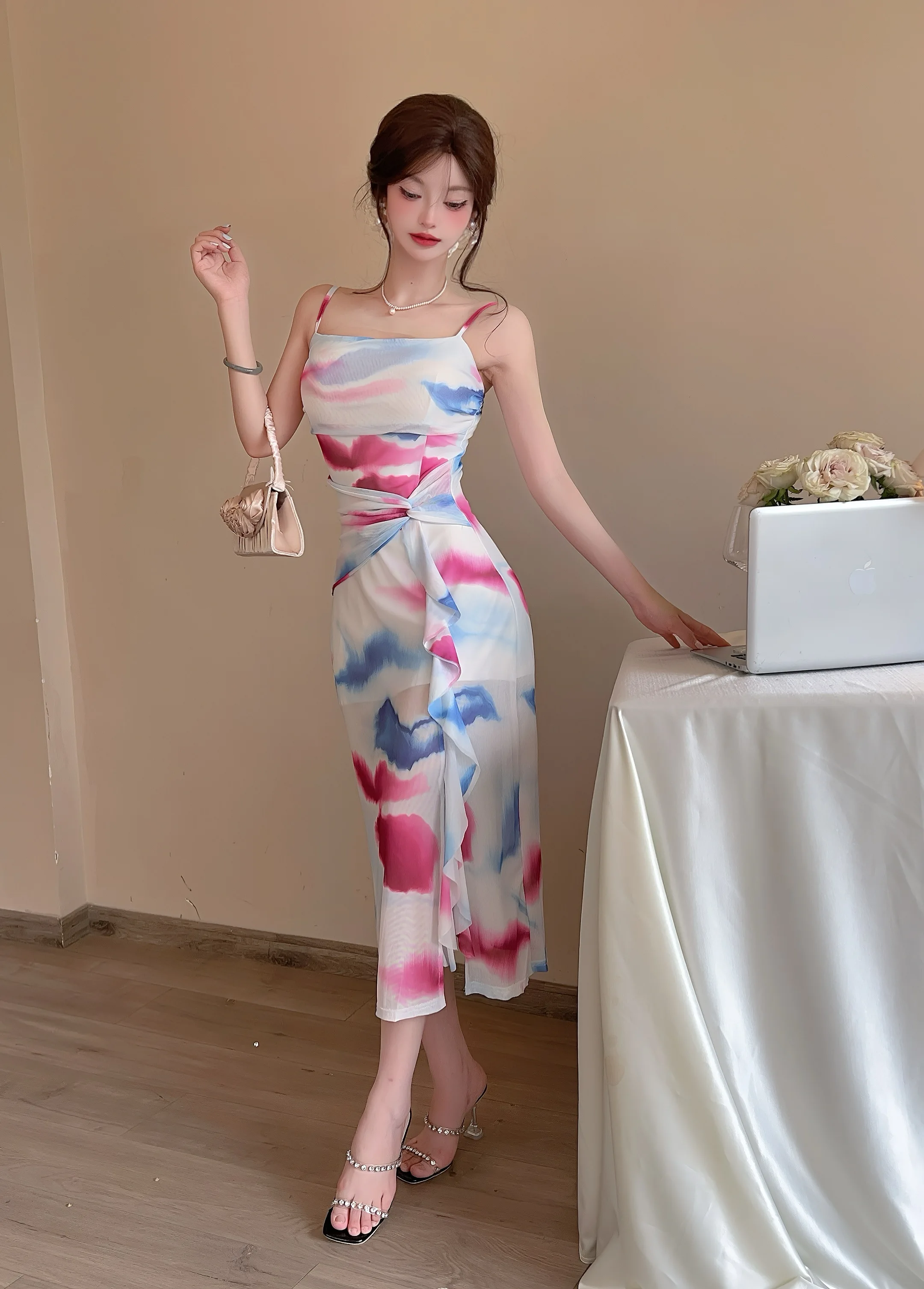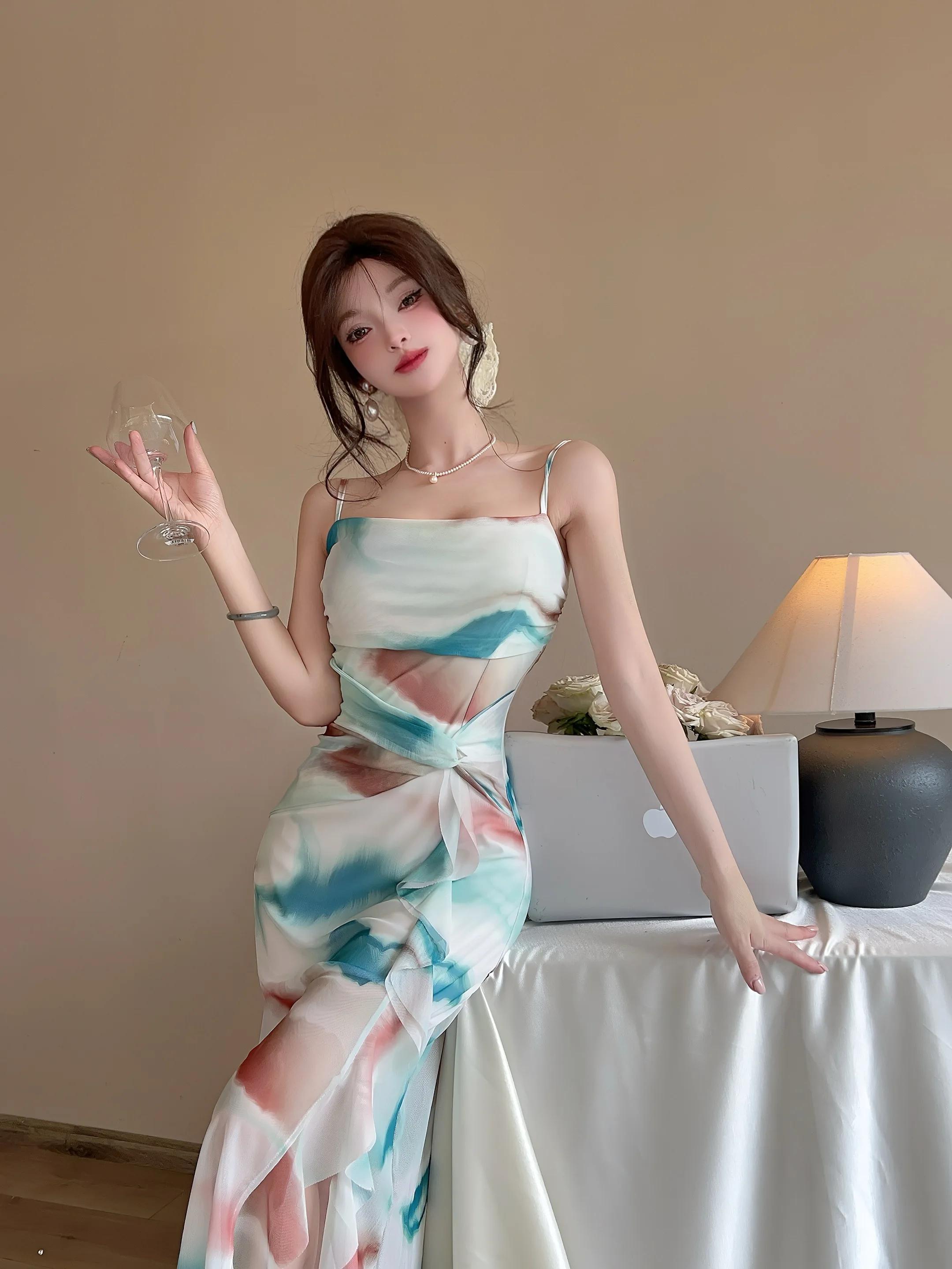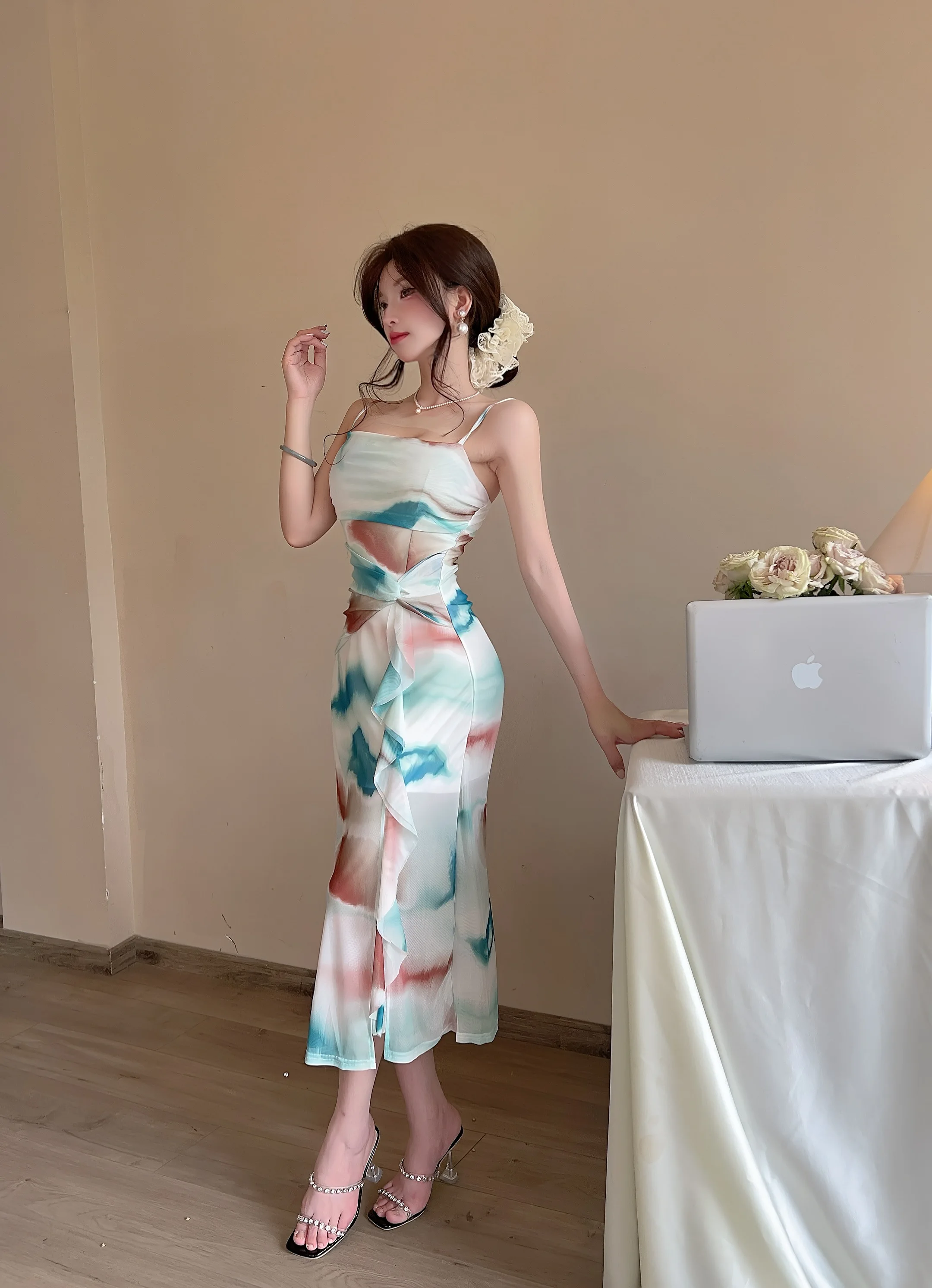 DAIIIBABYYY - Summer Boho Print Mesh Chic Ruffled Long Dress Women Elegant Bodycon Sling Sexy Dress 2025 Korean Fashion Luxury One Piece Dress