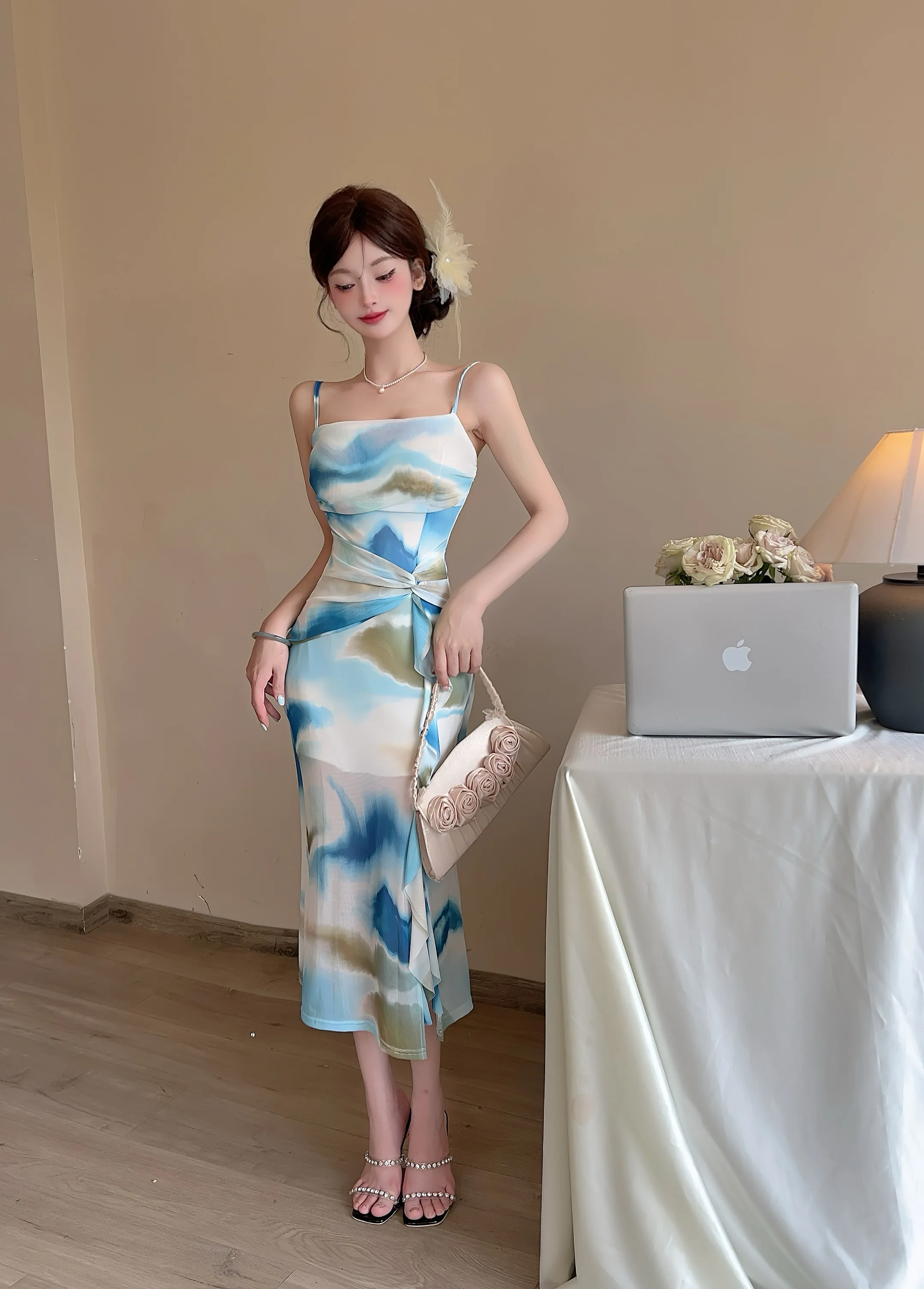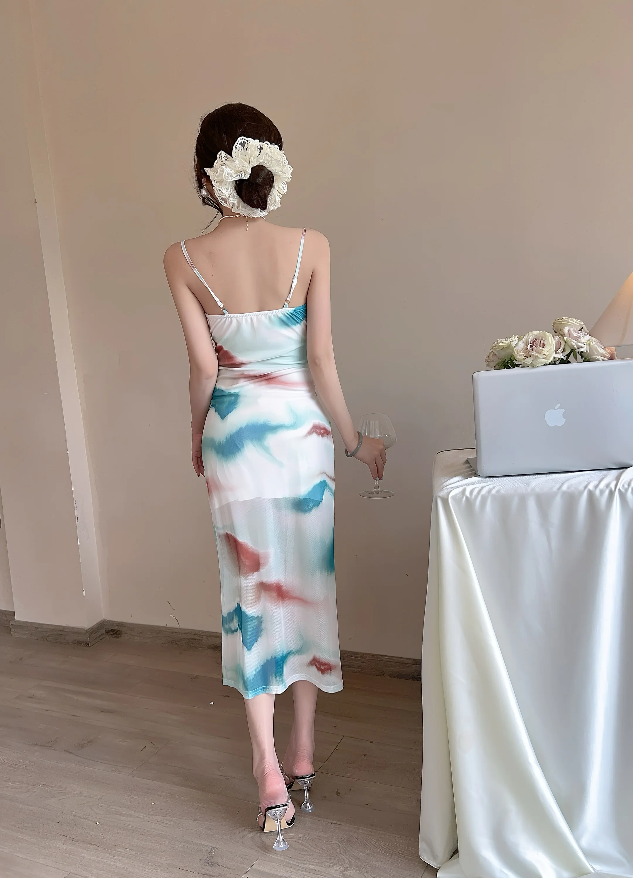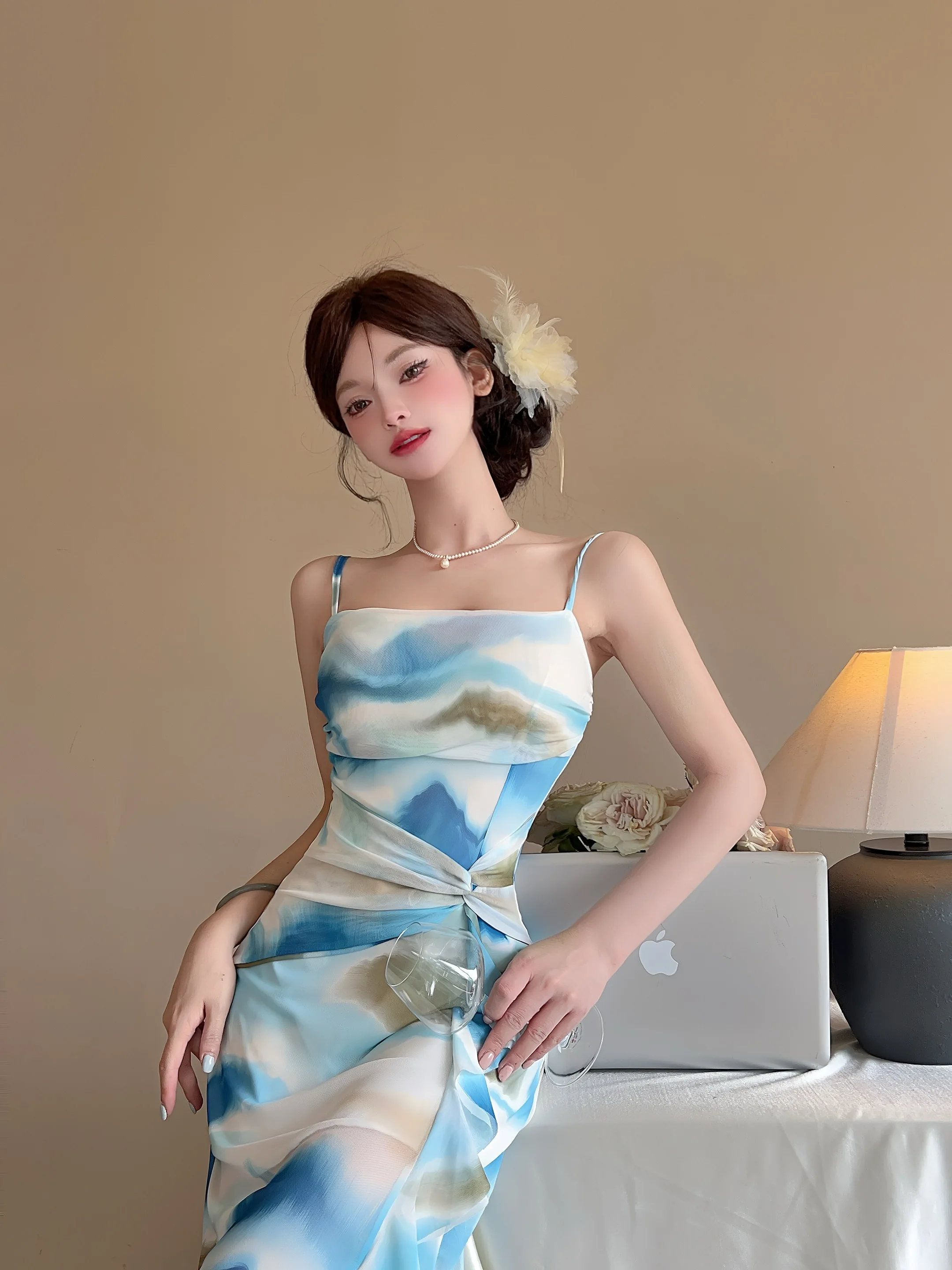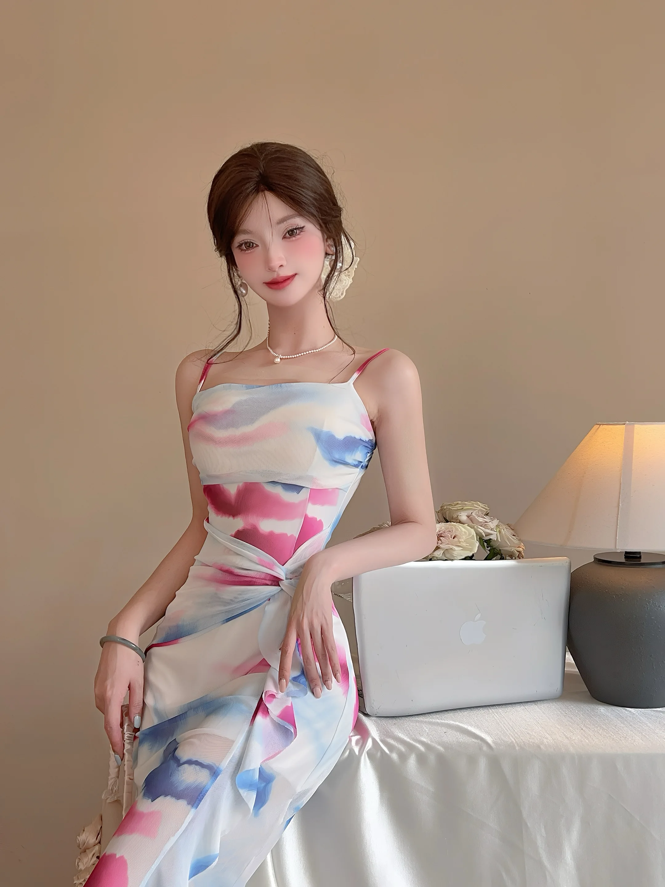 DAIIIBABYYY - Summer Boho Print Mesh Chic Ruffled Long Dress Women Elegant Bodycon Sling Sexy Dress 2025 Korean Fashion Luxury One Piece Dress