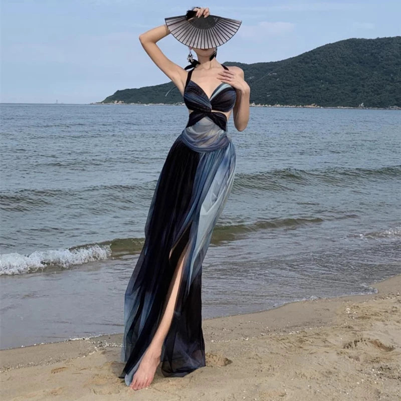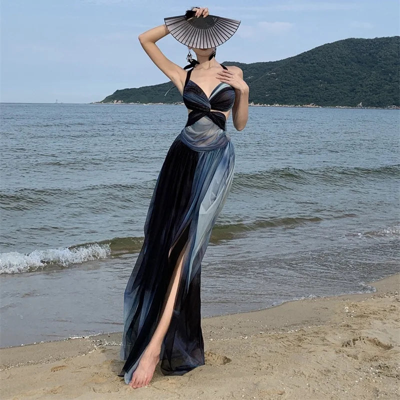 DAIIIBABYYY - Summer Casual Holiday Dress Women Beatutiful Halter Bandage Dress Fairy Tie-dye Backless Cut-out Seaside Beach Vestidos Sexy