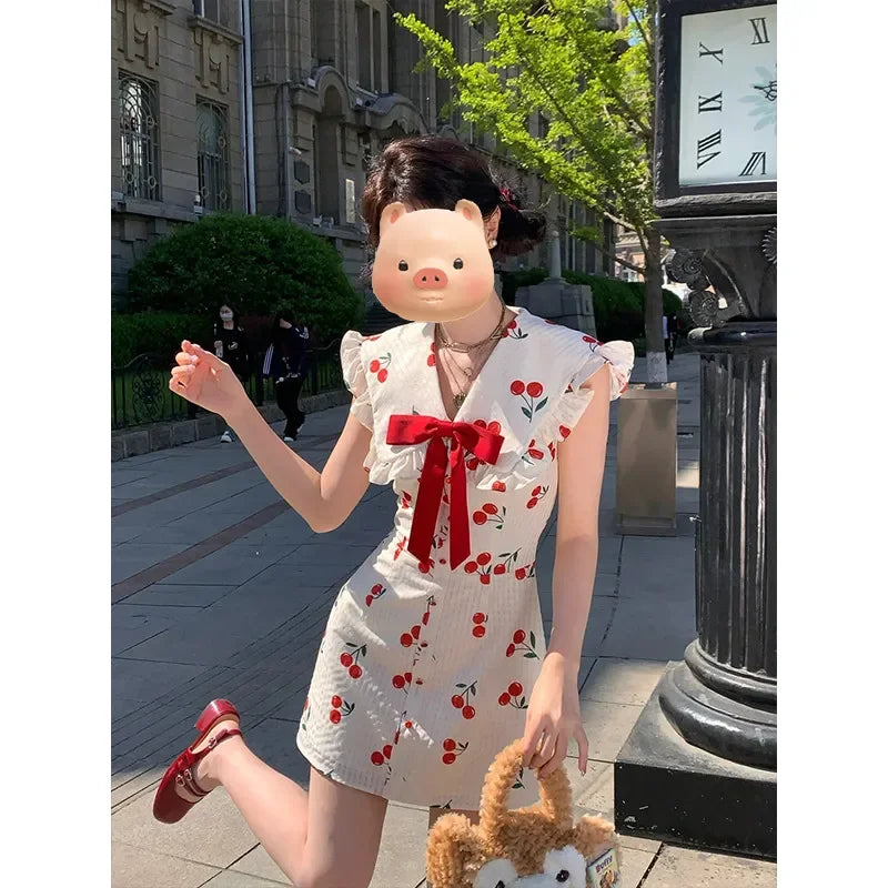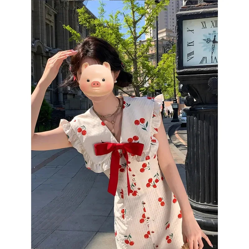 DAIIIBABYYY - Summer Fashion Small Girl Red Cherry Print Doll Dress Women Cute Bow Slim Mini Shirt Dress Holiday Sleeveless Short A Line Skirt