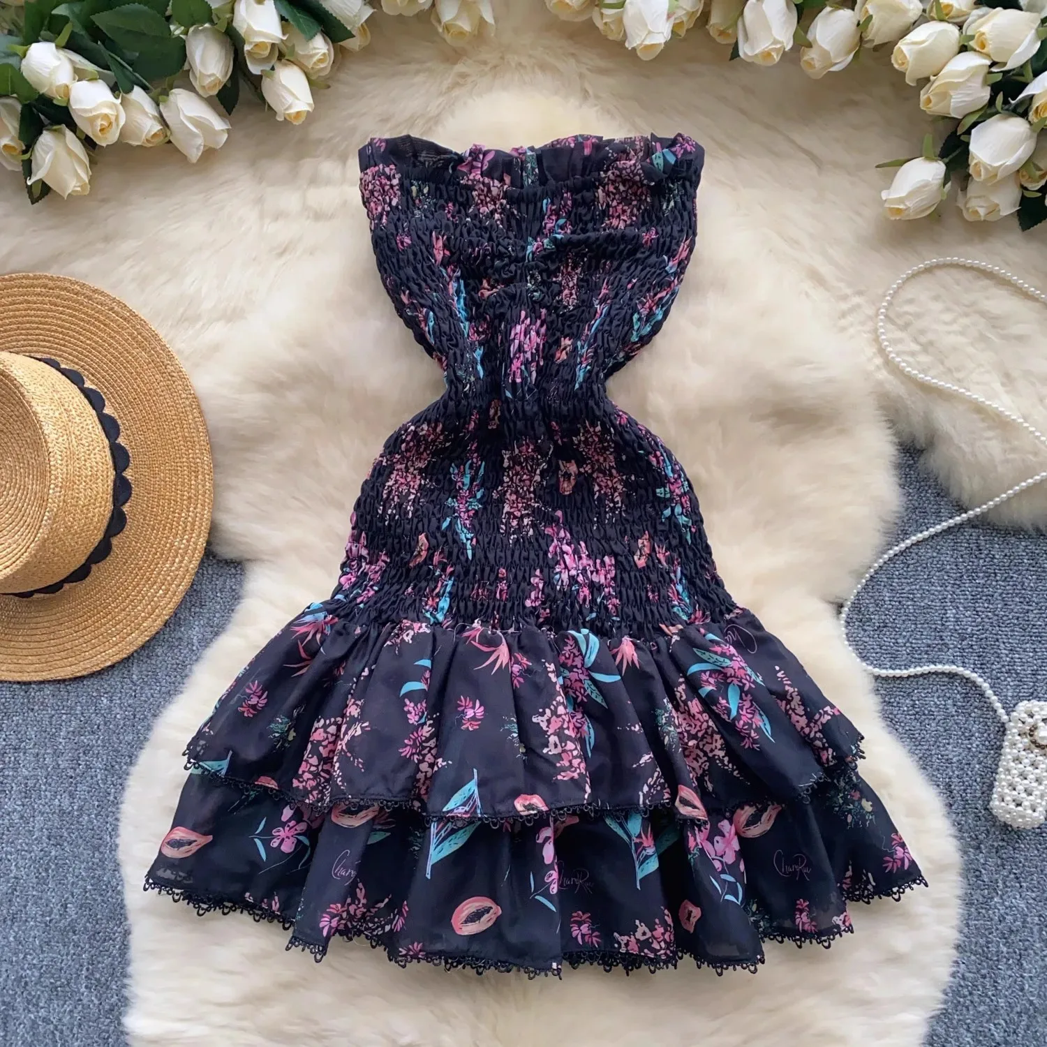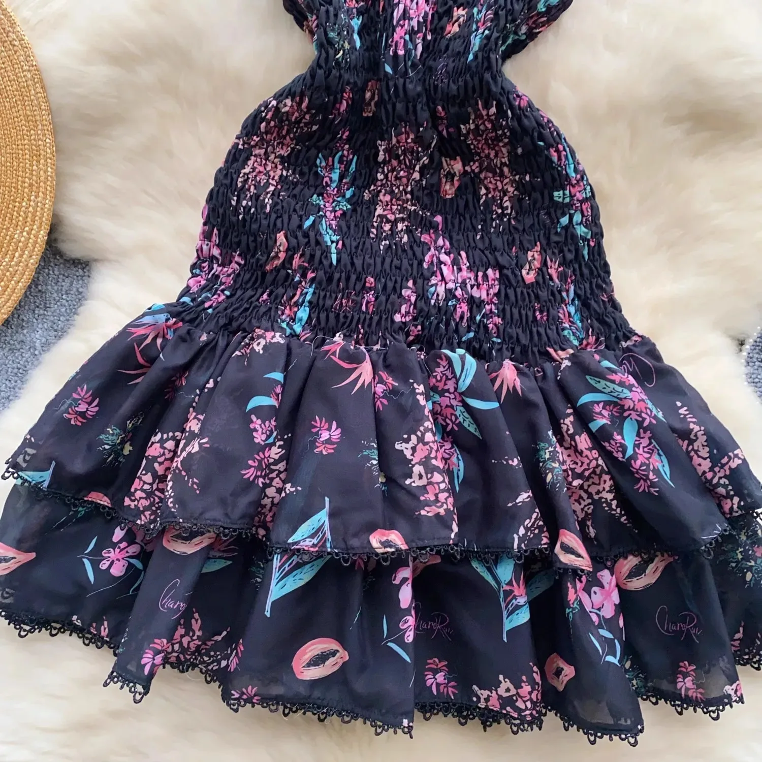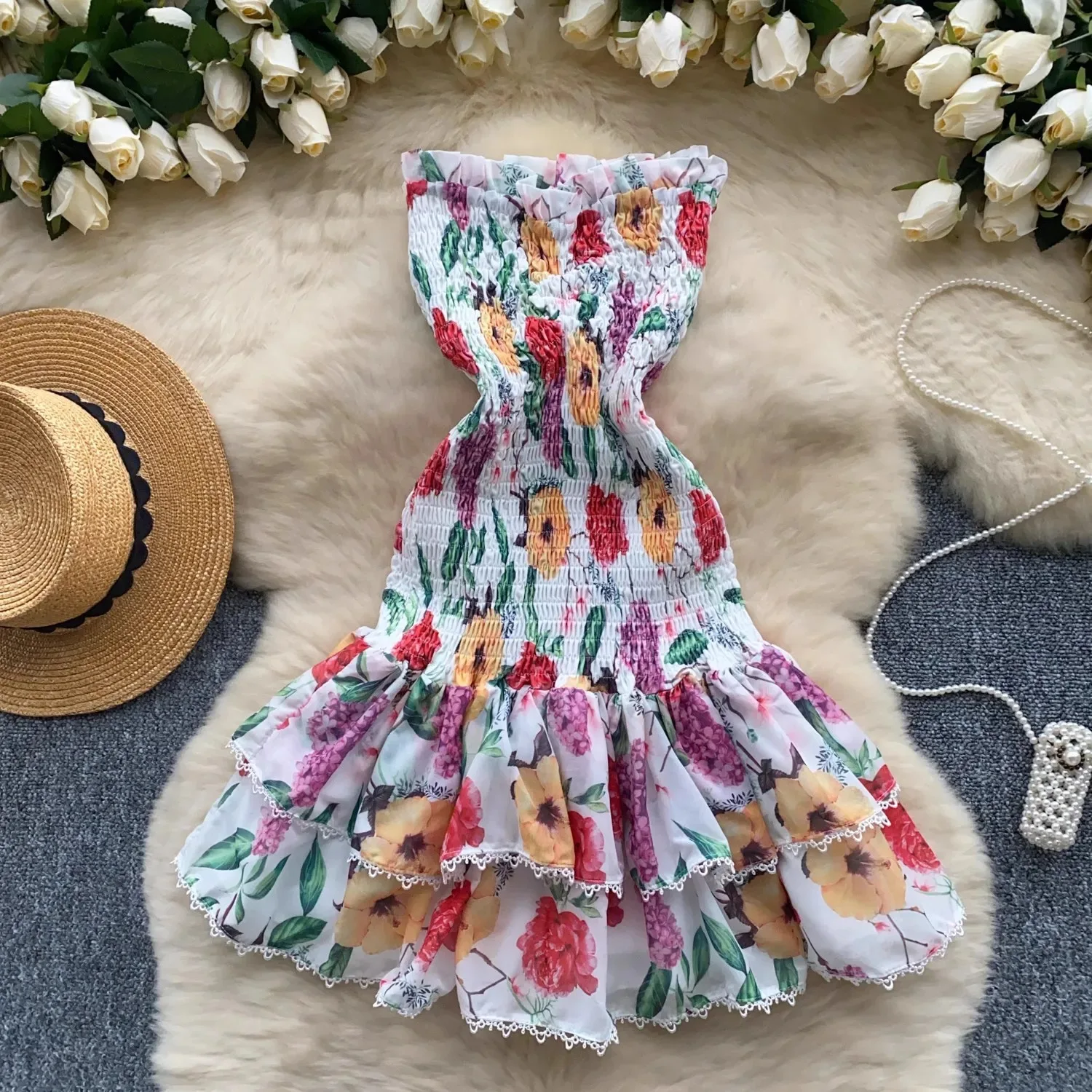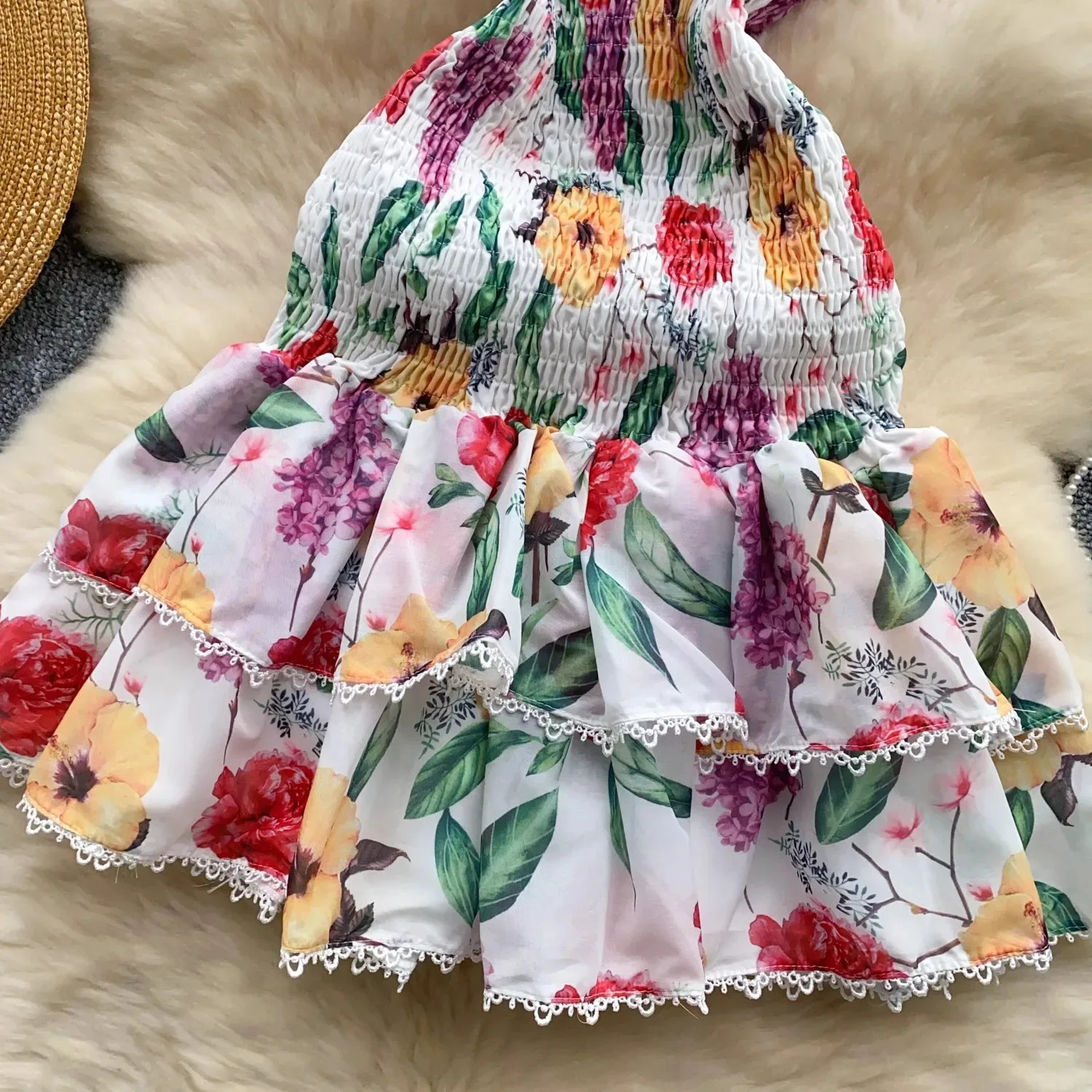 DAIIIBABYYY - Summer Floral Sundress Holiday Halter Print Corset Short Dress Women Sexy Backless Ruffles Cake Vestidos Mini Flower Beach Robe