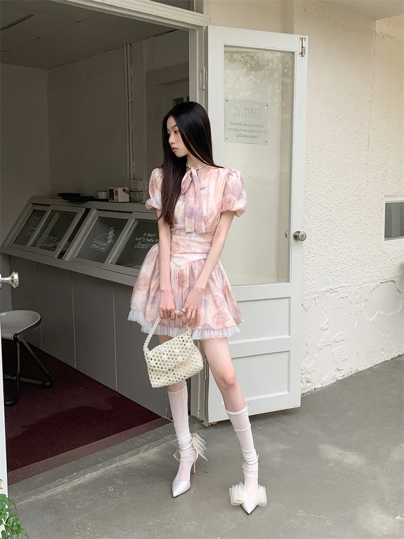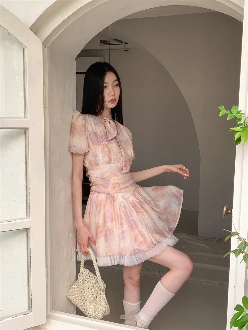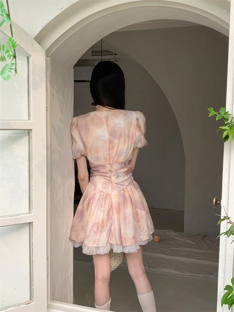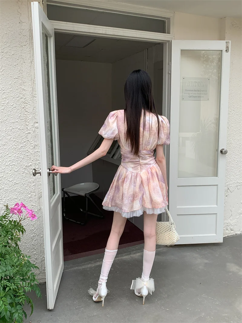 DAIIIBABYYY - Summer Pink Dress Printing Lace Ruffled Womens Sexy Korean Fashion Simple Temperament NEW Y2K Female Clothing Dress