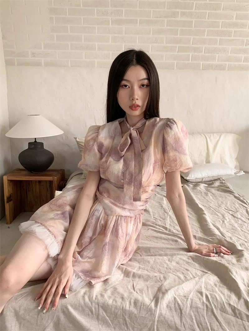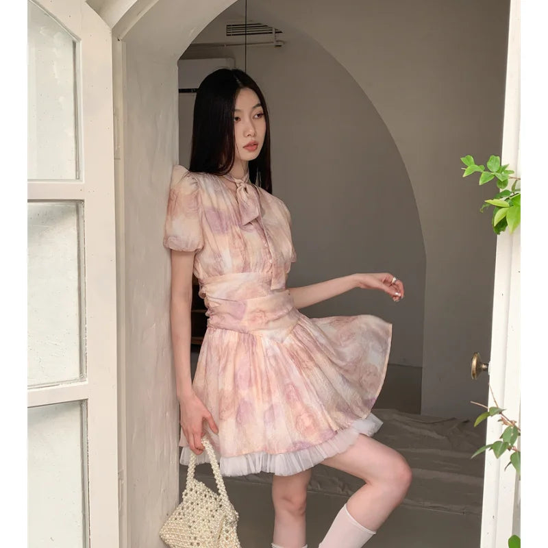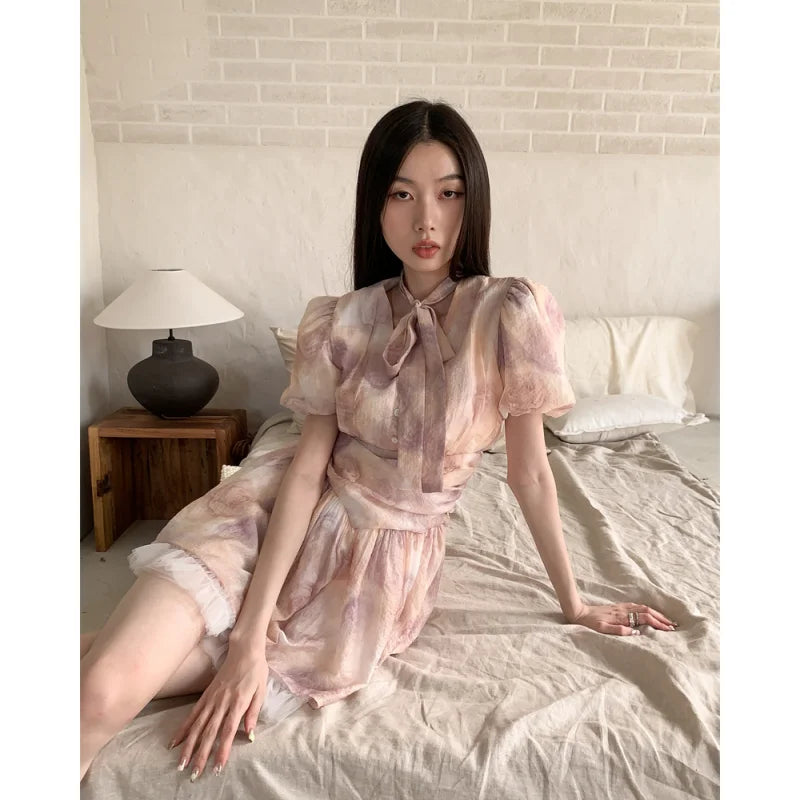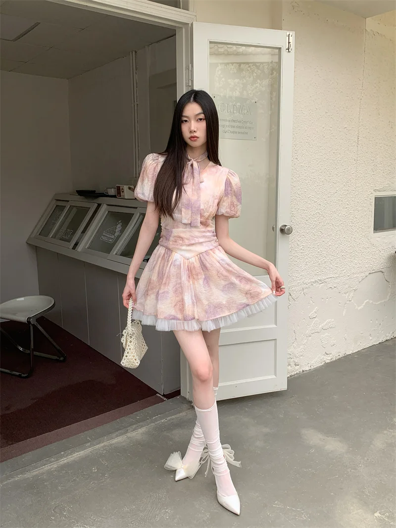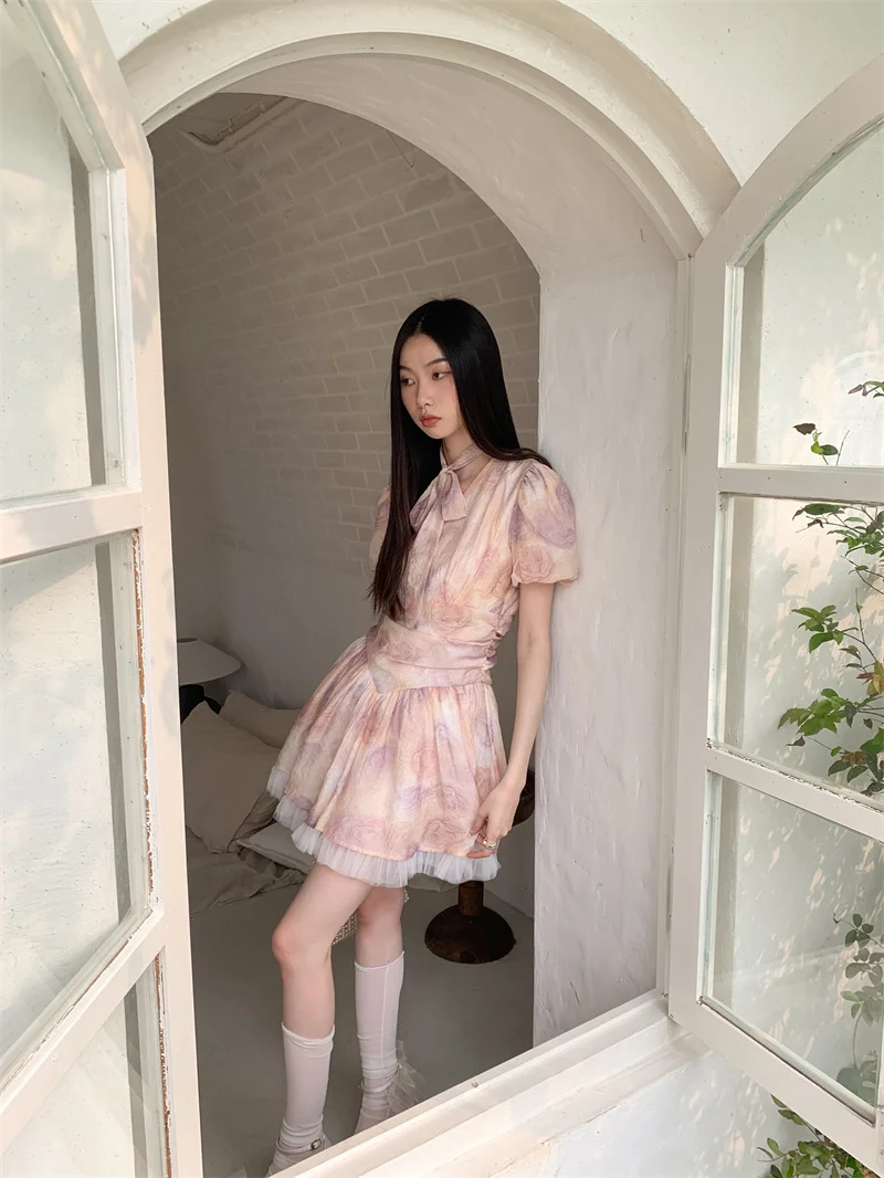 DAIIIBABYYY - Summer Pink Dress Printing Lace Ruffled Womens Sexy Korean Fashion Simple Temperament NEW Y2K Female Clothing Dress