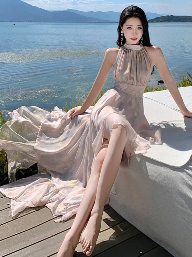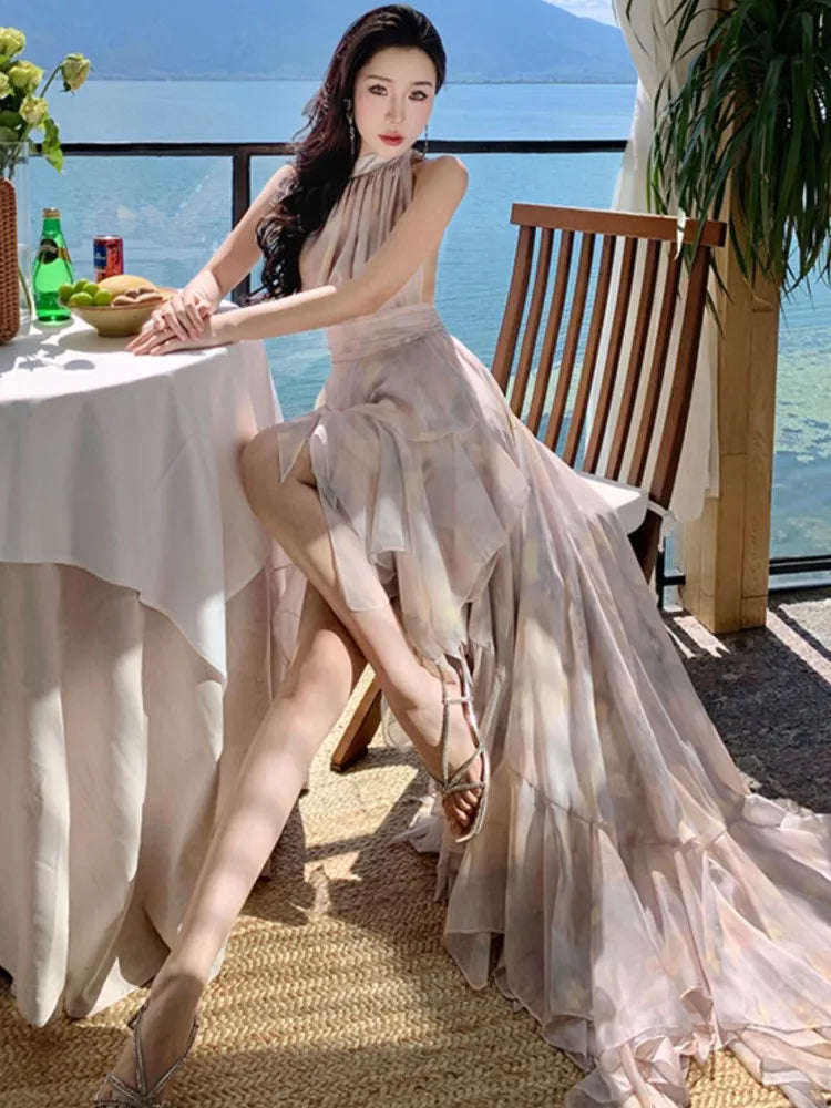 DAIIIBABYYY - Summer Print Halter Womens Dresses Vintage Sleeveless Backless Slim Birthday Party Dress Elegant Irregular Pleated Long Robe New