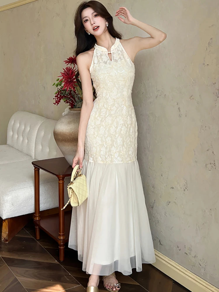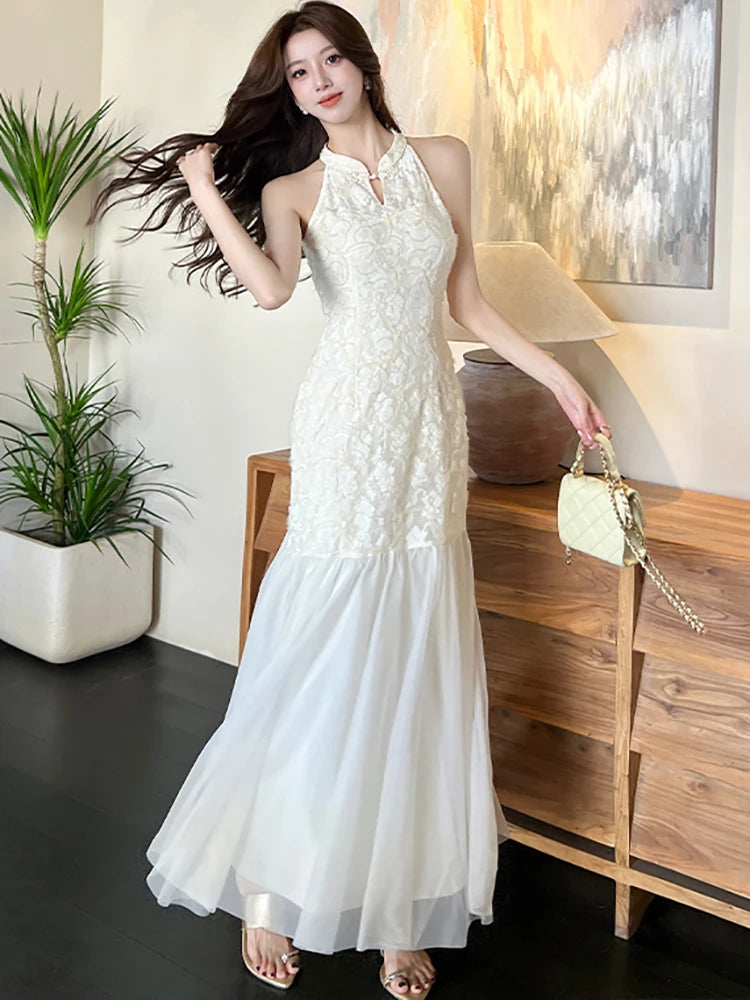 DAIIIBABYYY  -  Summer White Jacquard Patchwork Mesh Ruffled Maxi Dress Women Elegant Luxury Neck-mounted Sexy Dress 2025 Korean Bodycon Dresses