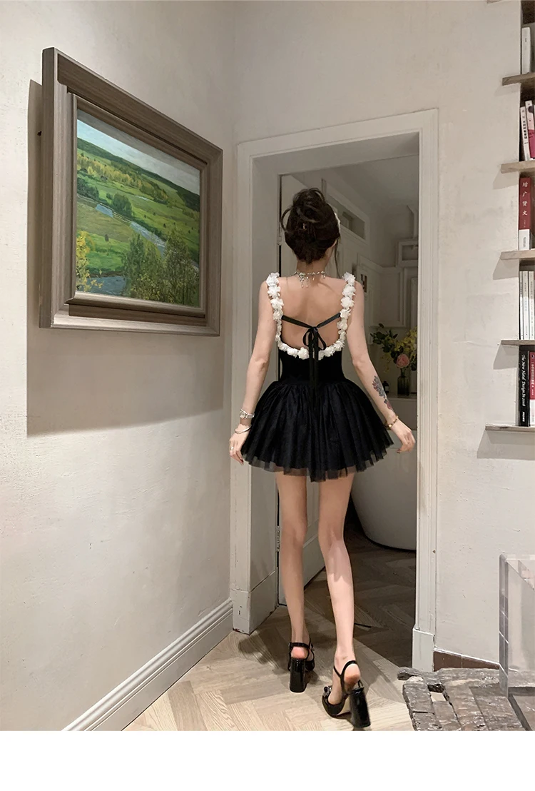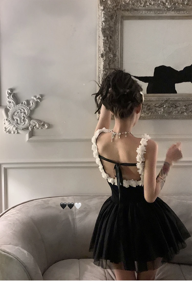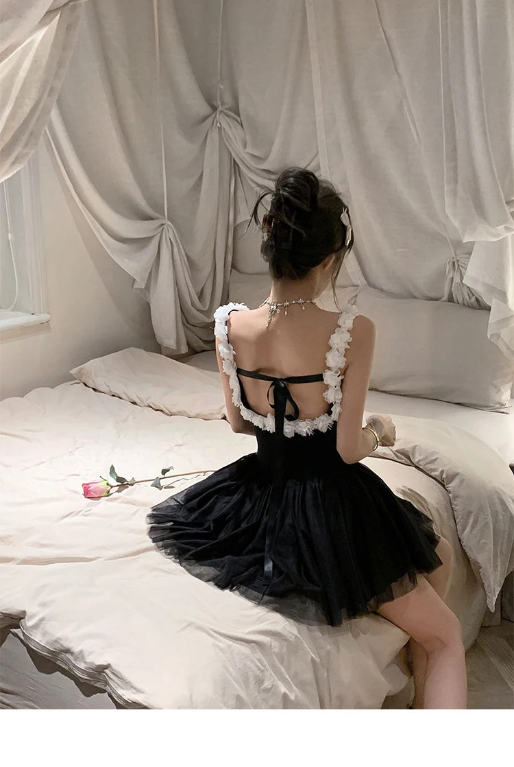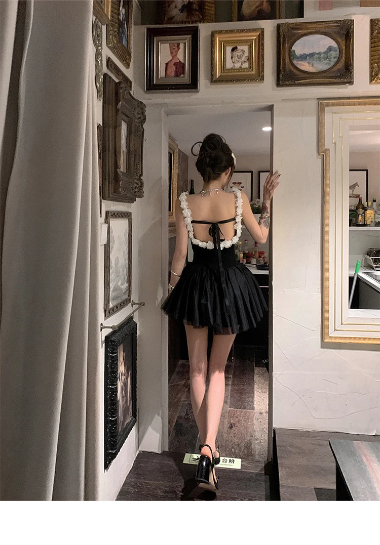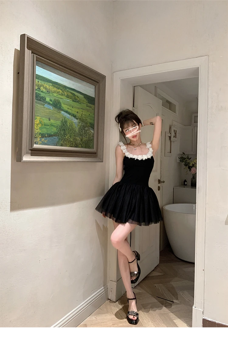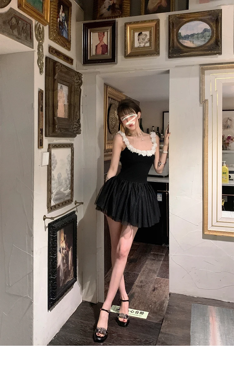DAIIIBABYYY - Summer Women's Black Straps Dress Sexy Square Neck High Level Sense Fashion Ballet Wind Suspender Ball Gown Short Skirt Dress