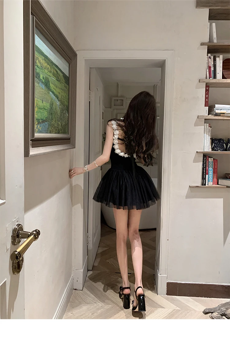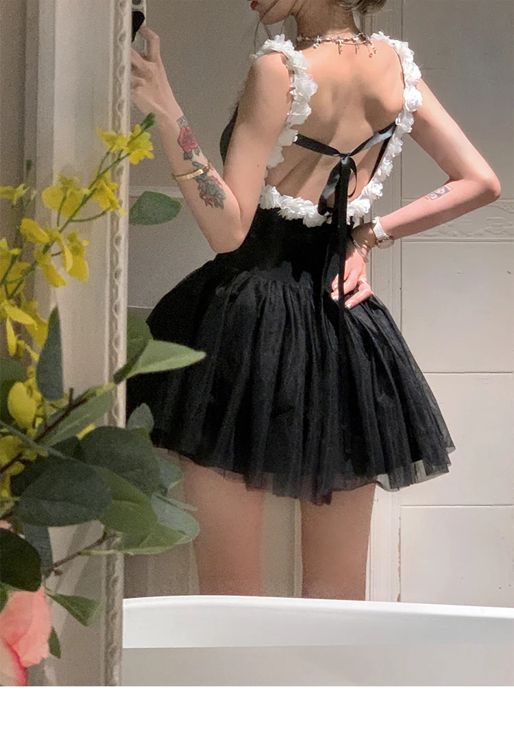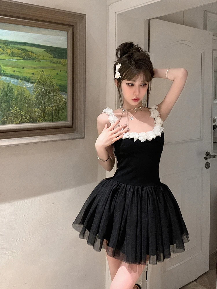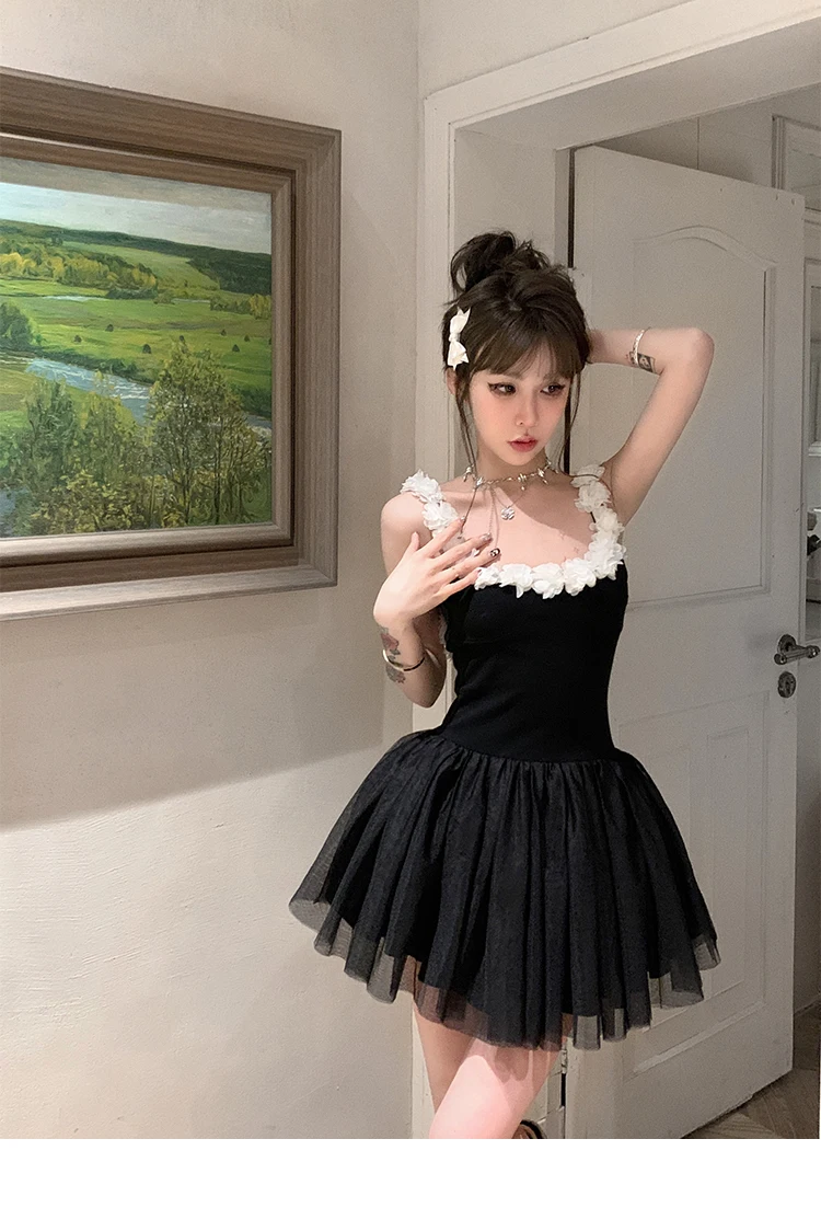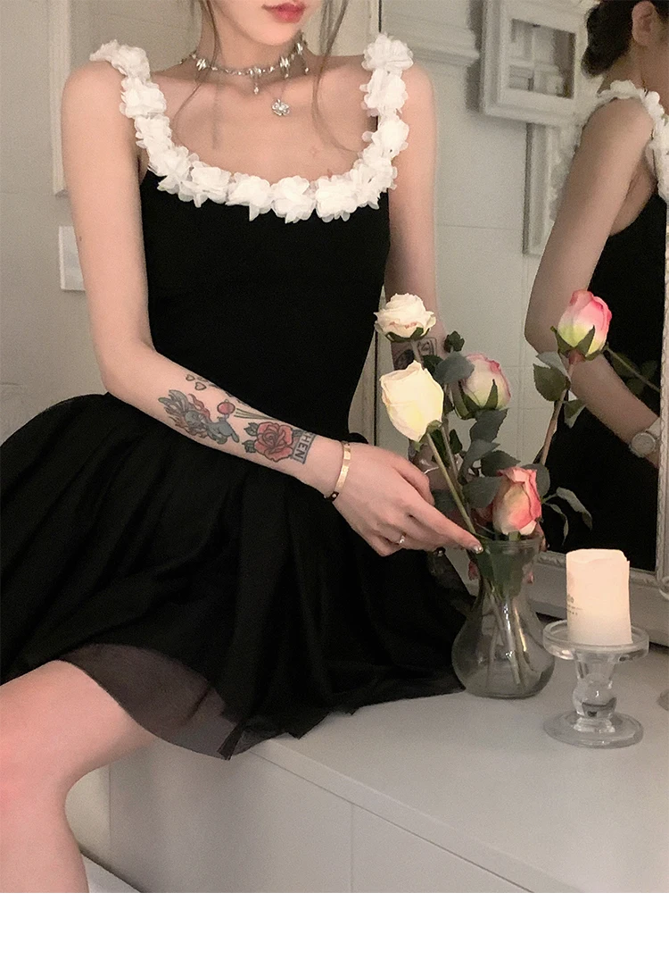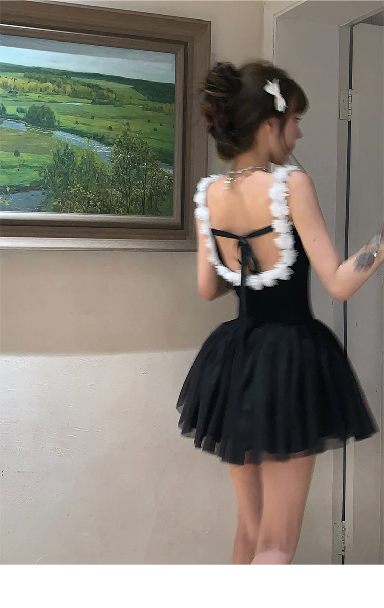 DAIIIBABYYY - Summer Women's Black Straps Dress Sexy Square Neck High Level Sense Fashion Ballet Wind Suspender Ball Gown Short Skirt Dress
