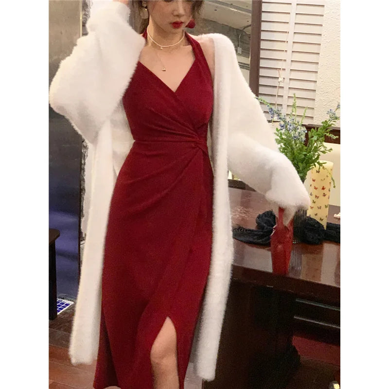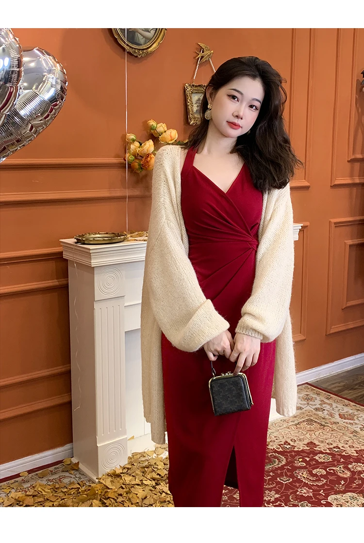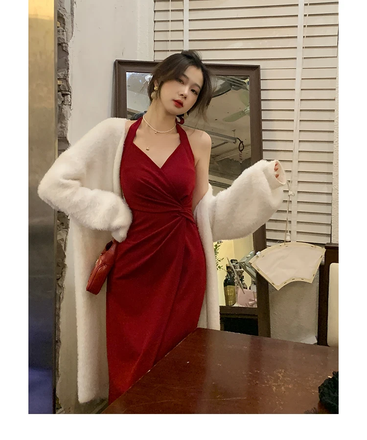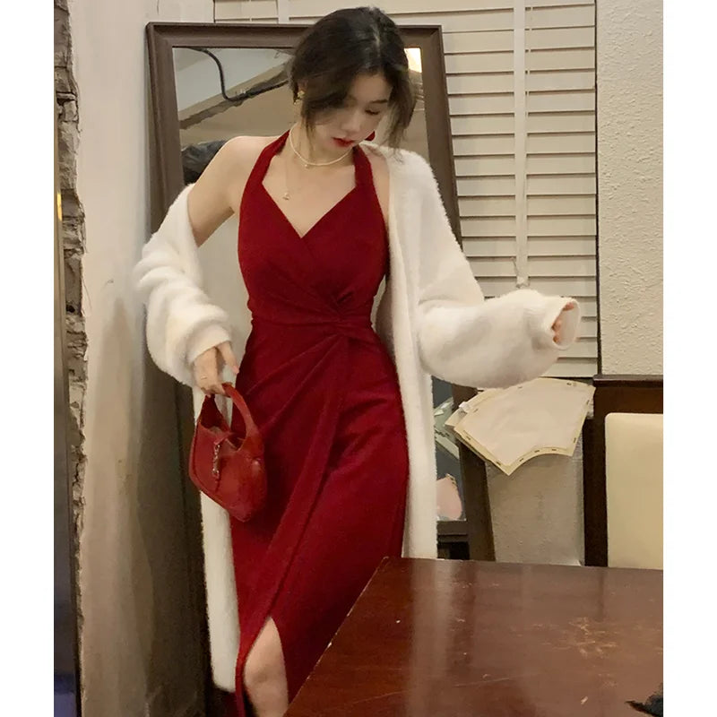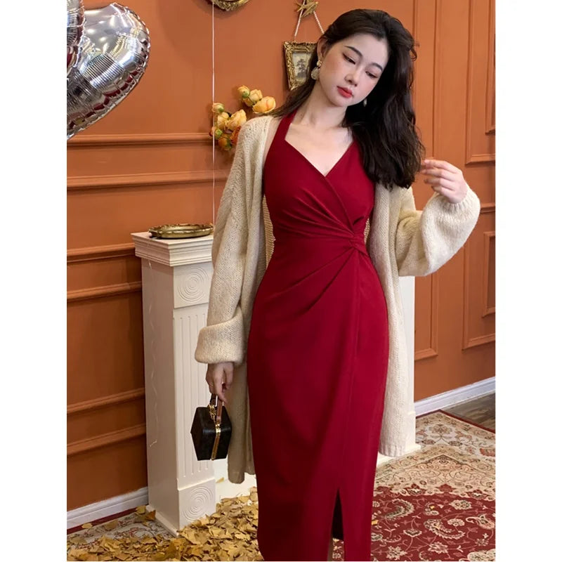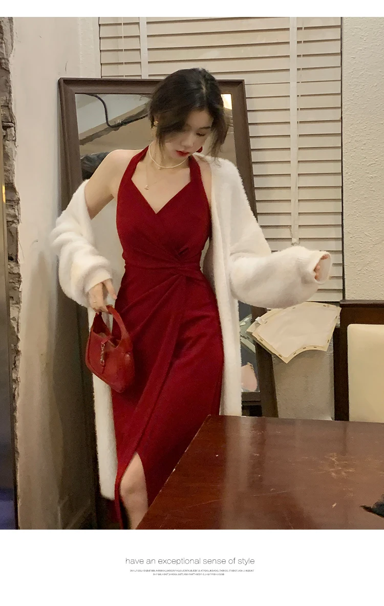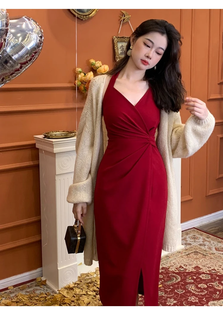 DAIIIBABYYY - Summer Womens Red Dress Straps Dress Sleeveless Sexy New Chinese Style Fashion Suspender Simple Slit Skirt Hanging Neck Dress