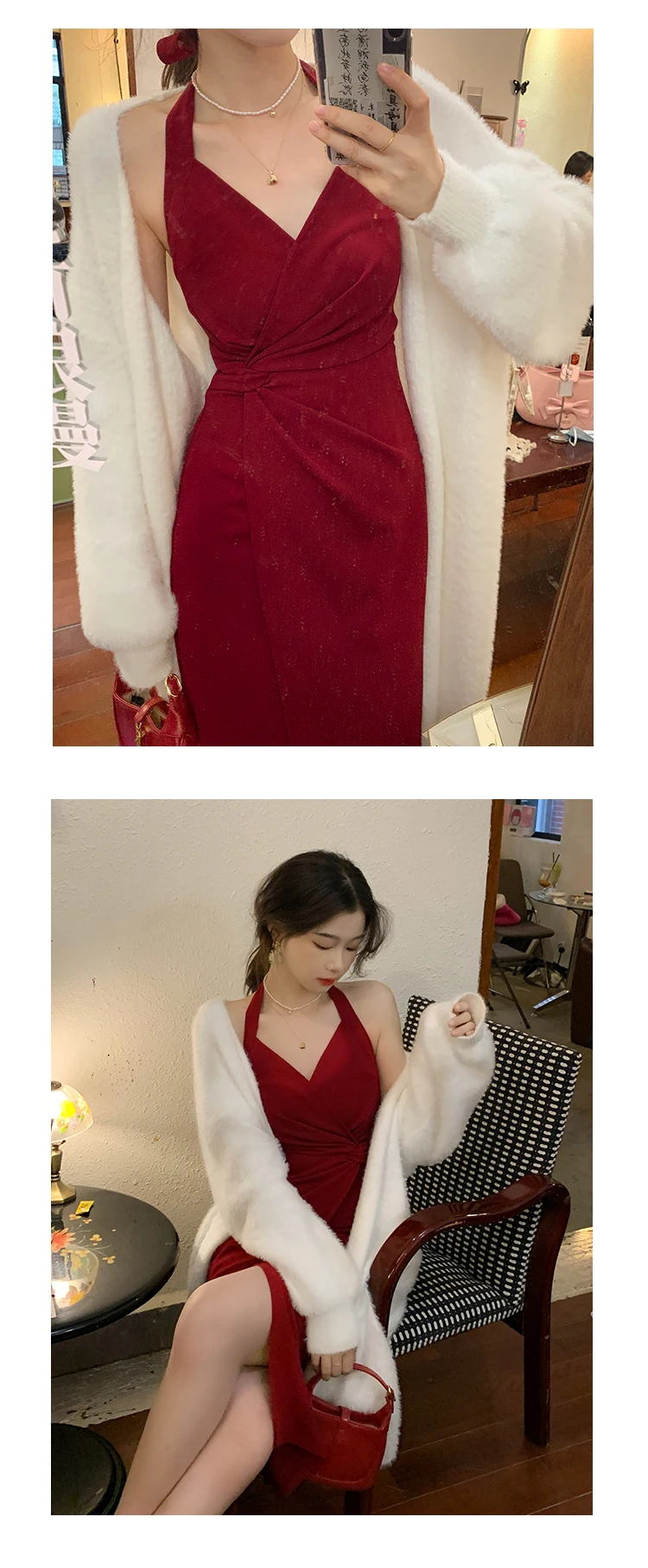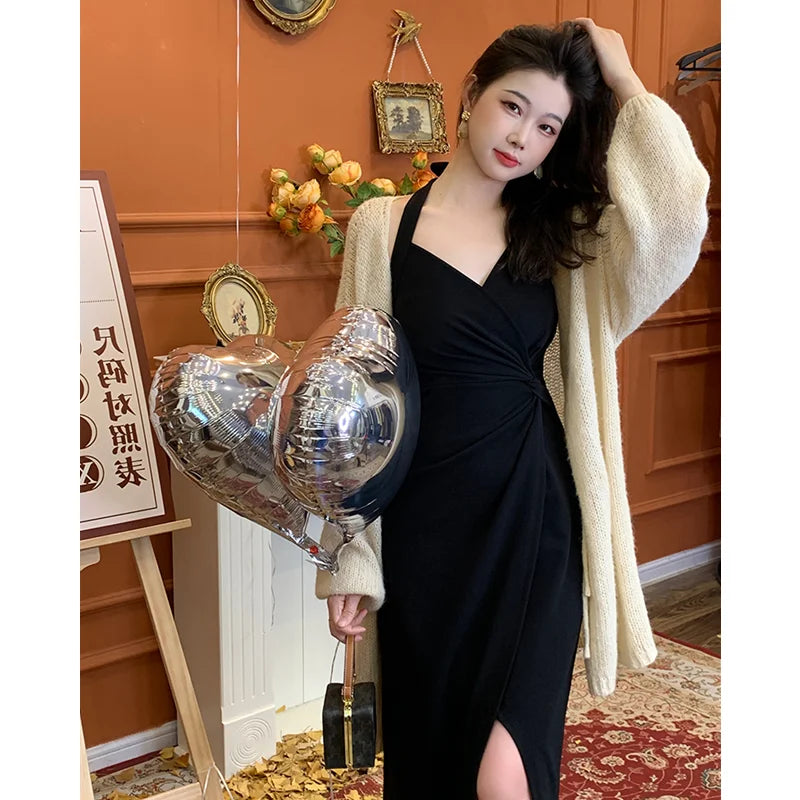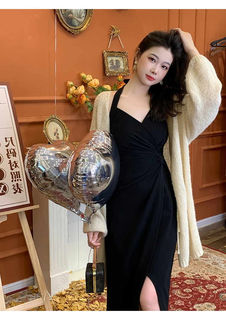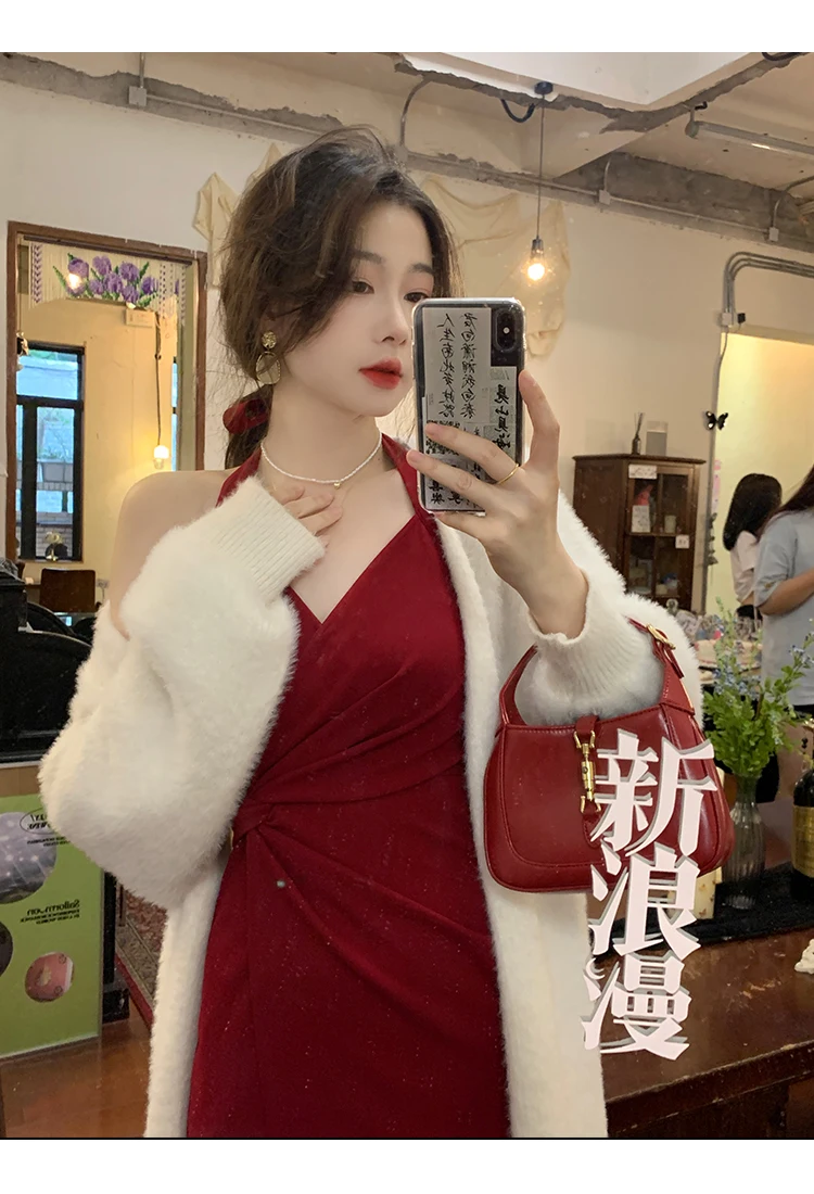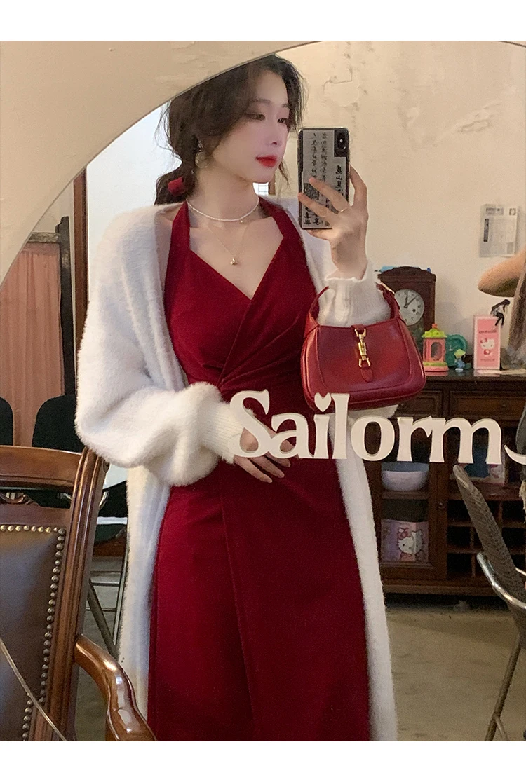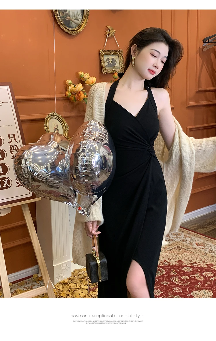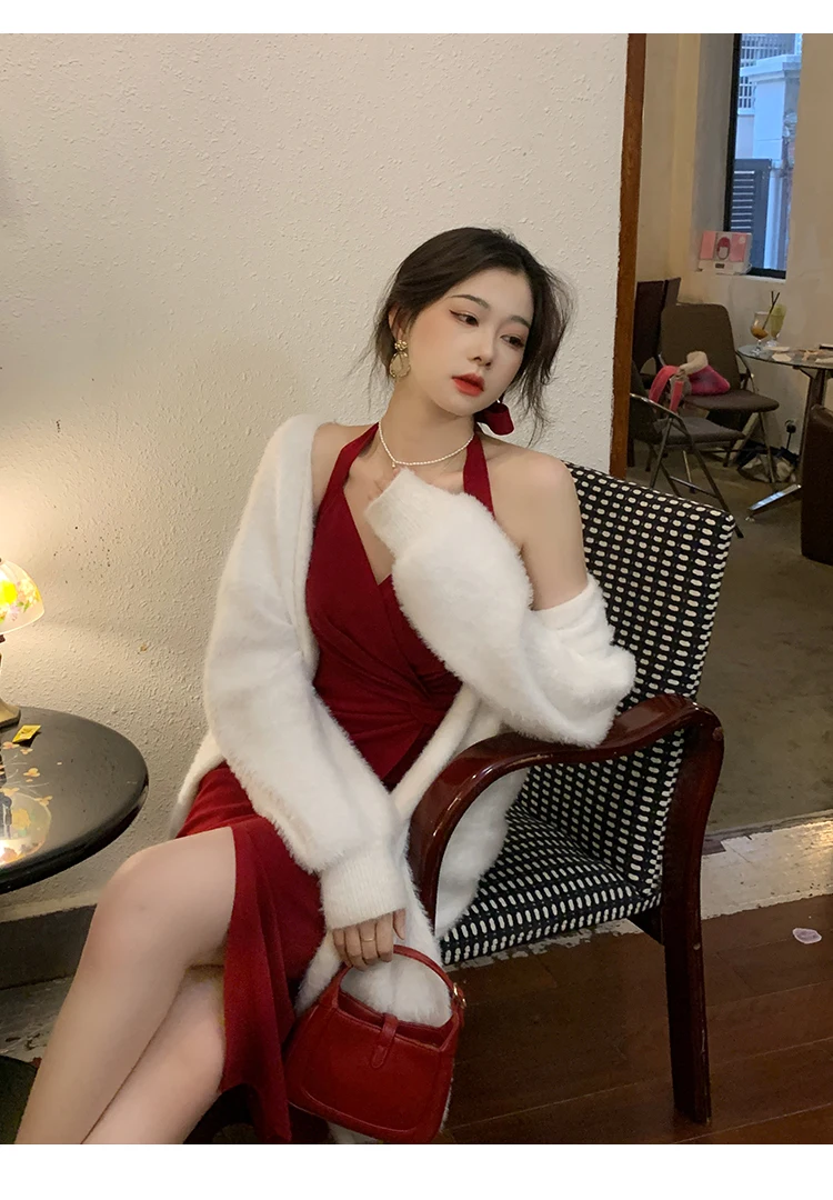 DAIIIBABYYY - Summer Womens Red Dress Straps Dress Sleeveless Sexy New Chinese Style Fashion Suspender Simple Slit Skirt Hanging Neck Dress